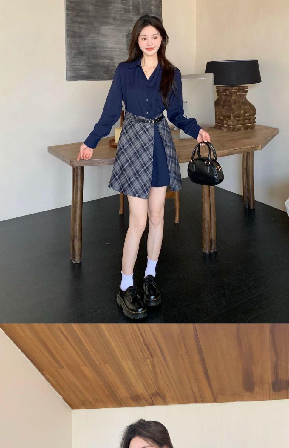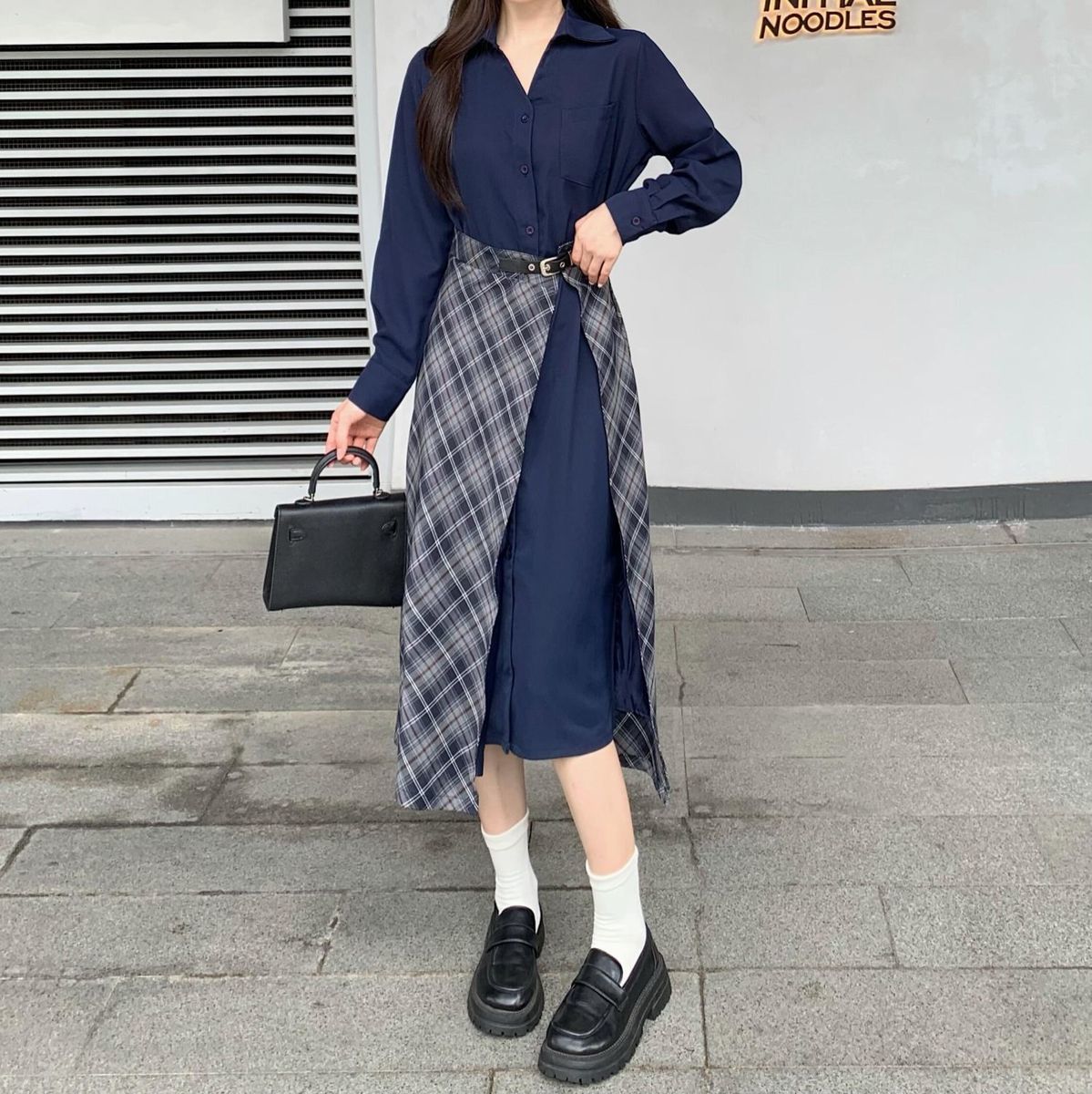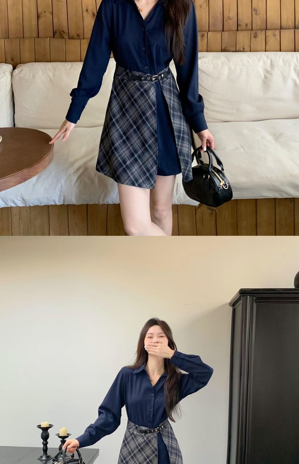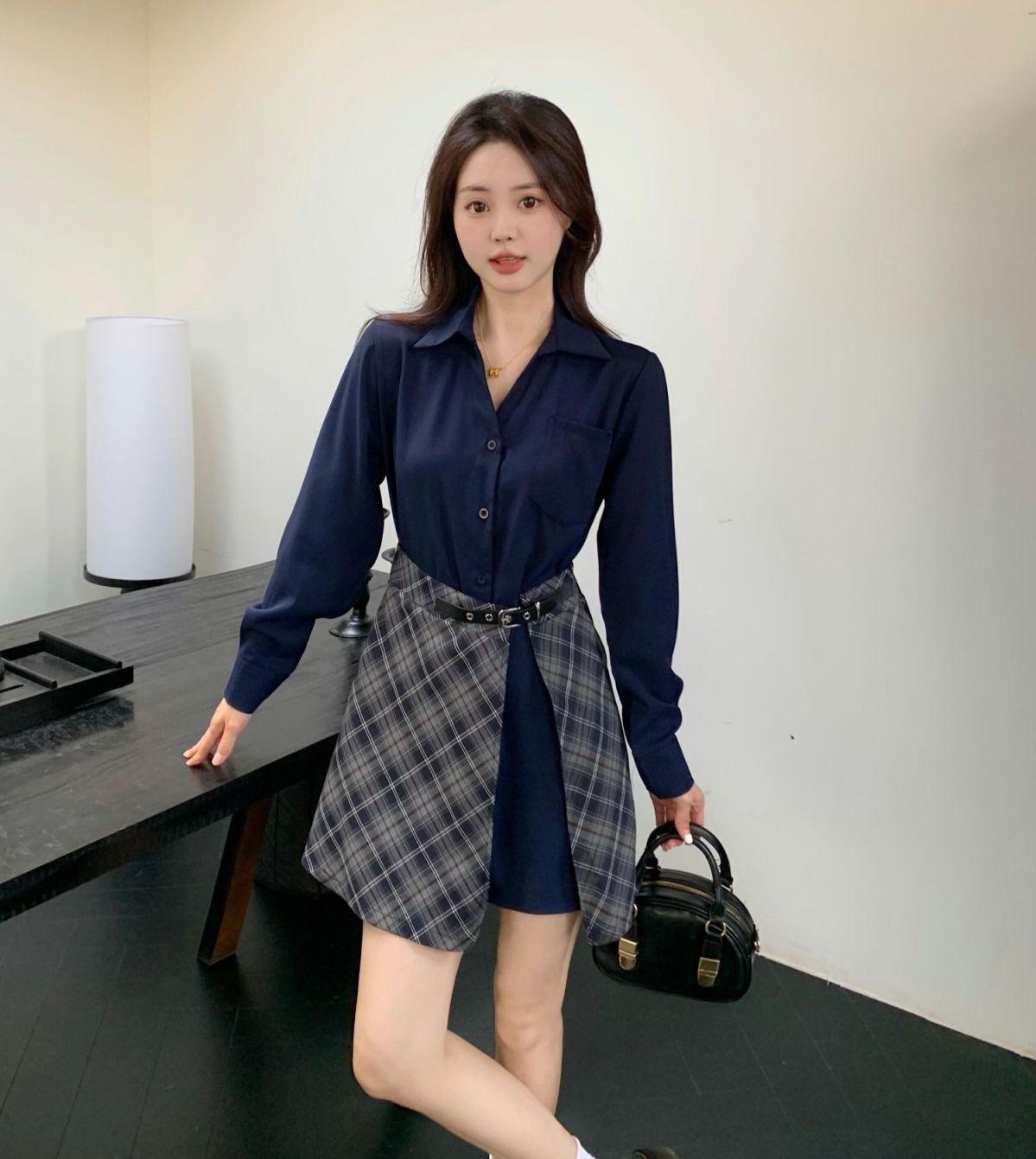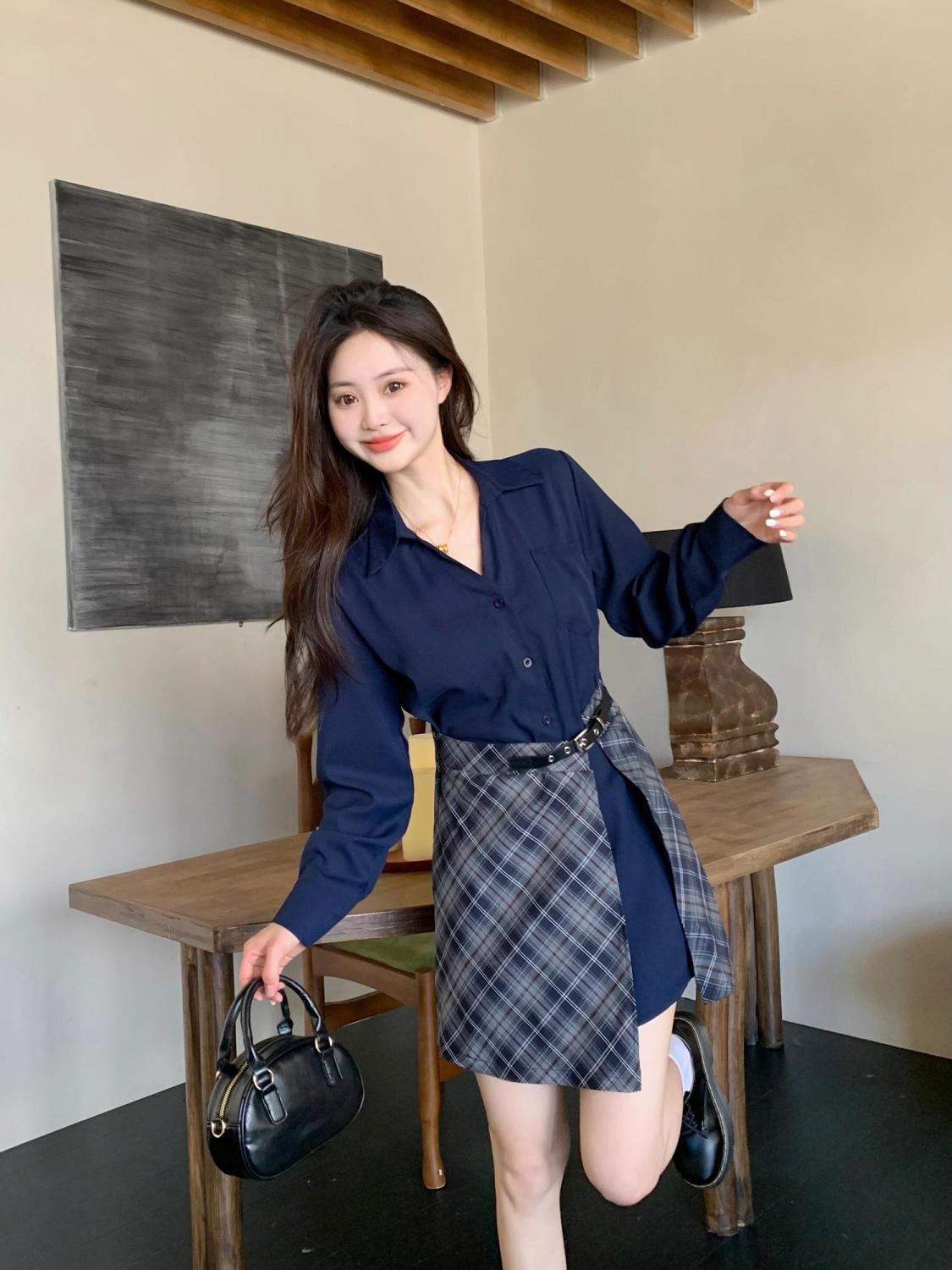 Vestido camisero de dos piezas con diseño de moda y falda corta a cuadros elegante de estilo francés para mujer de principios de primavera