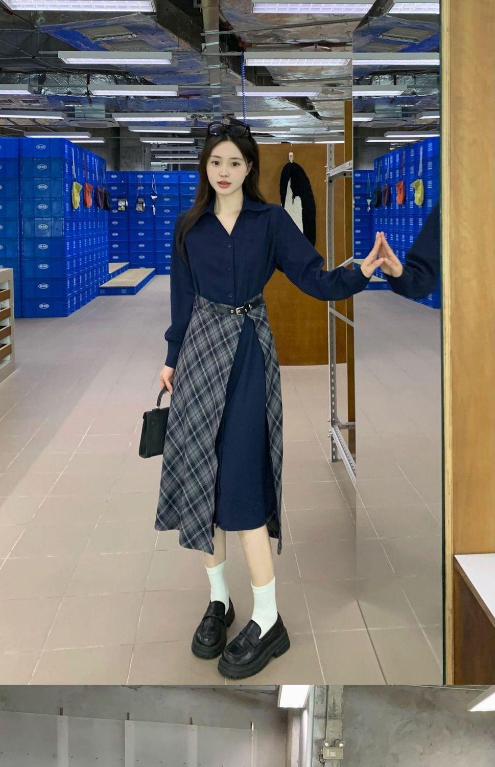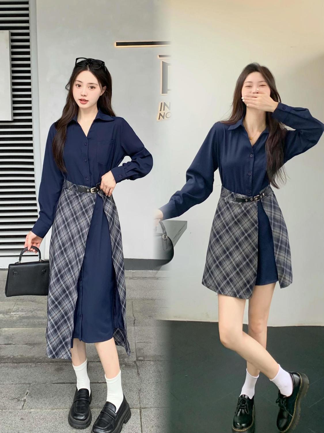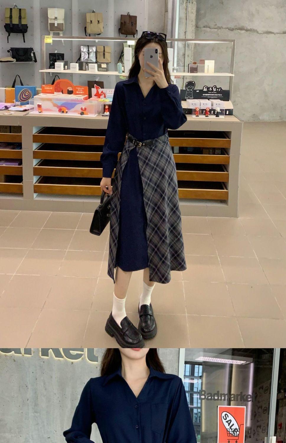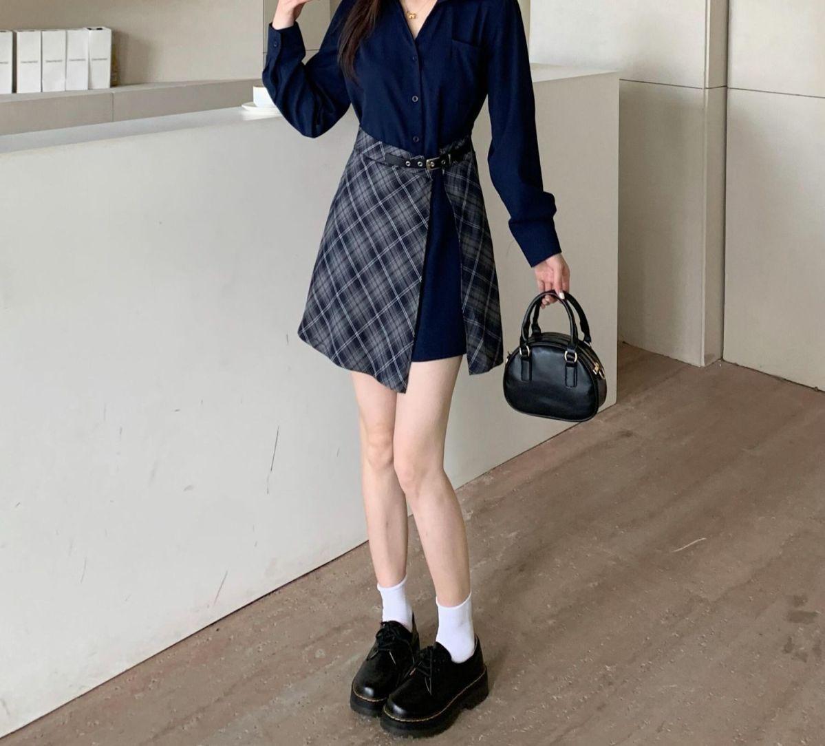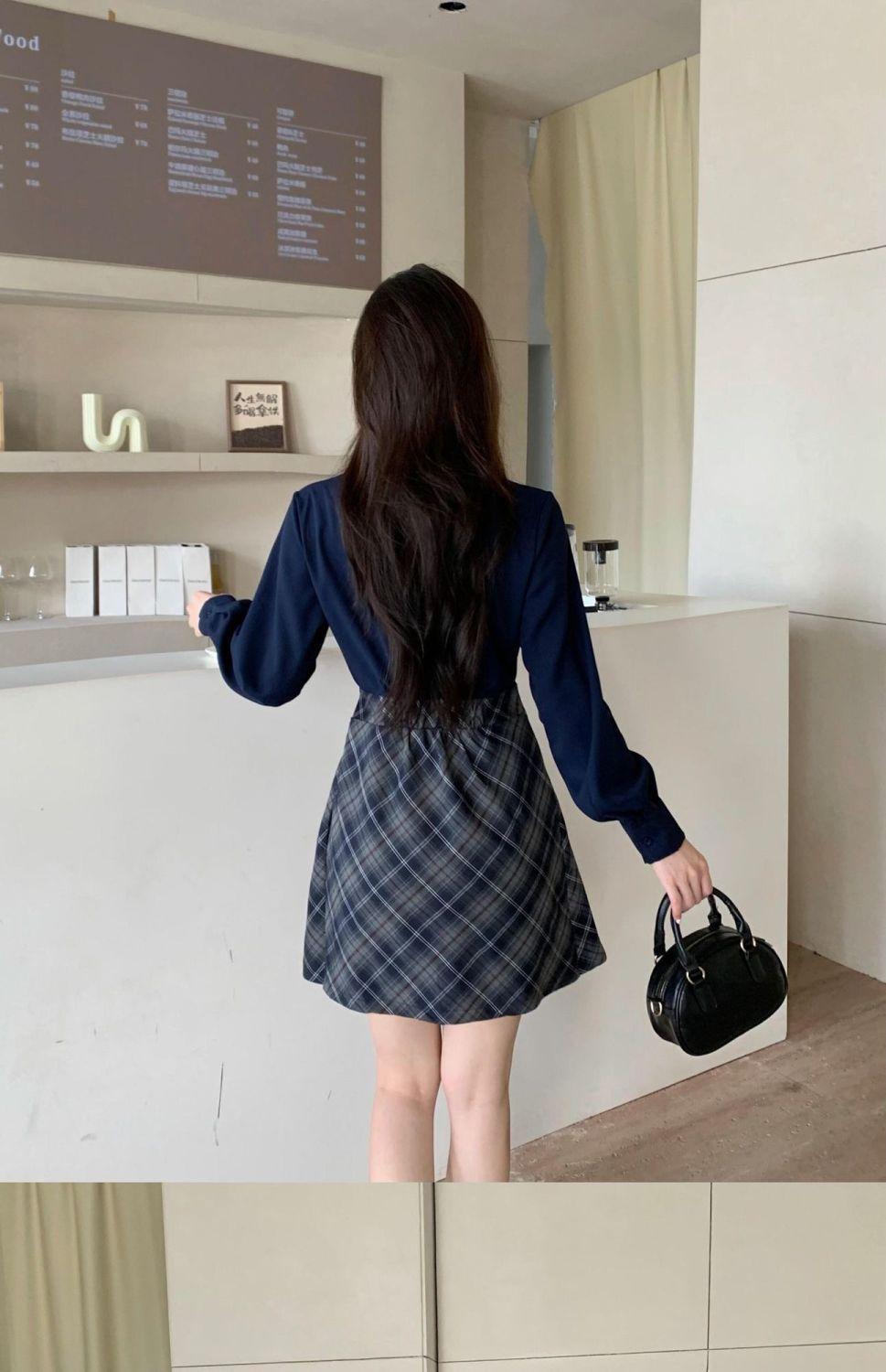 Vestido camisero de dos piezas con diseño de moda y falda corta a cuadros elegante de estilo francés para mujer de principios de primavera