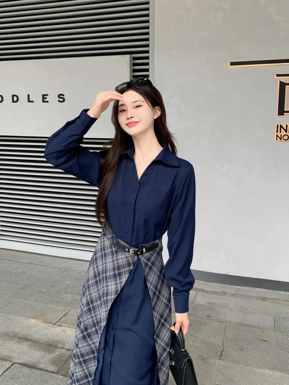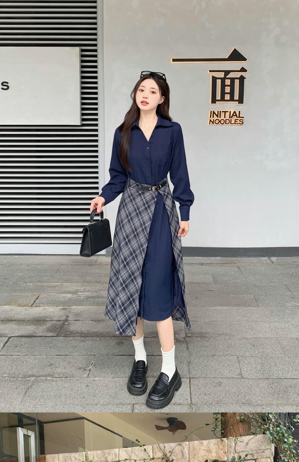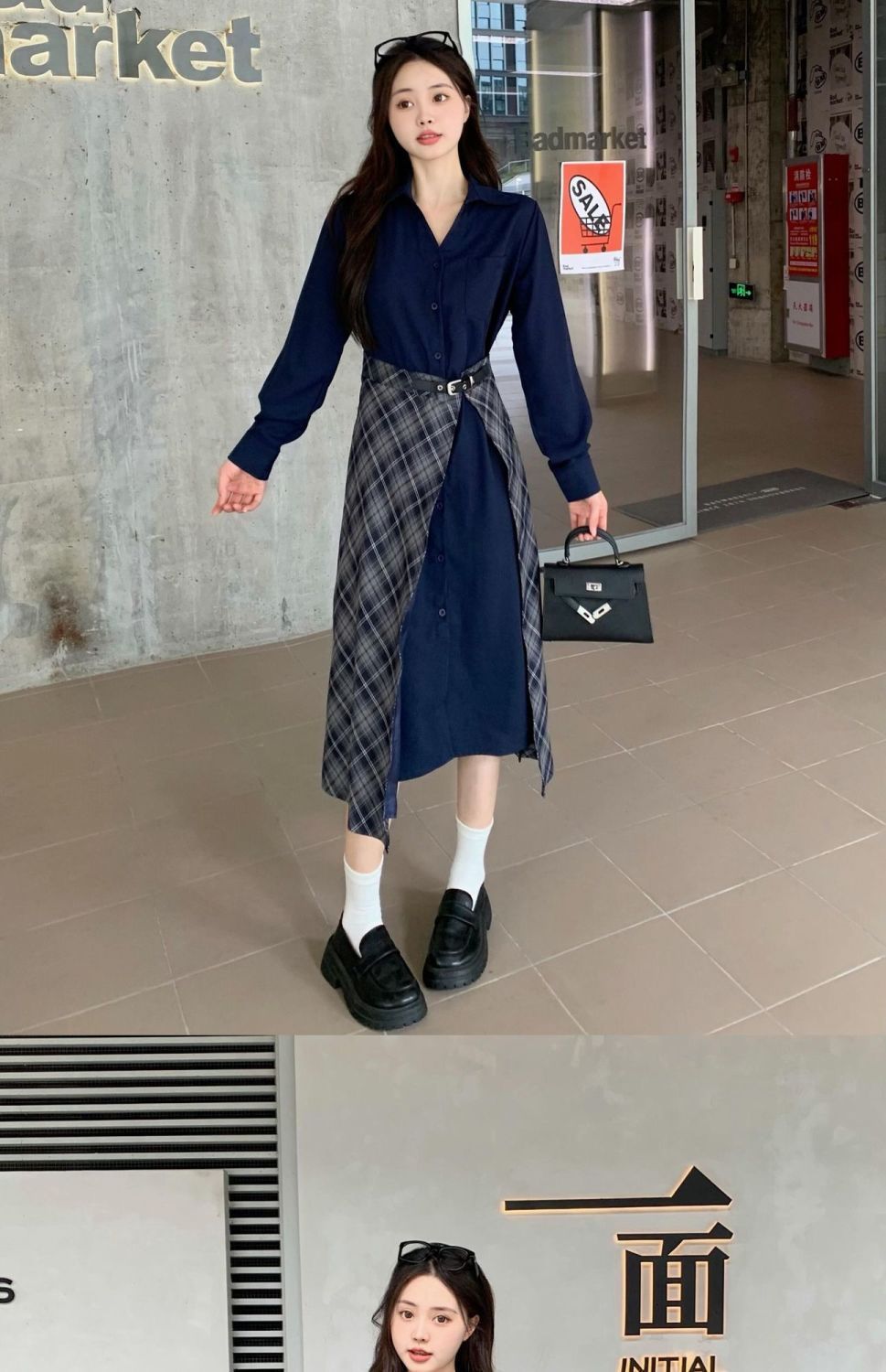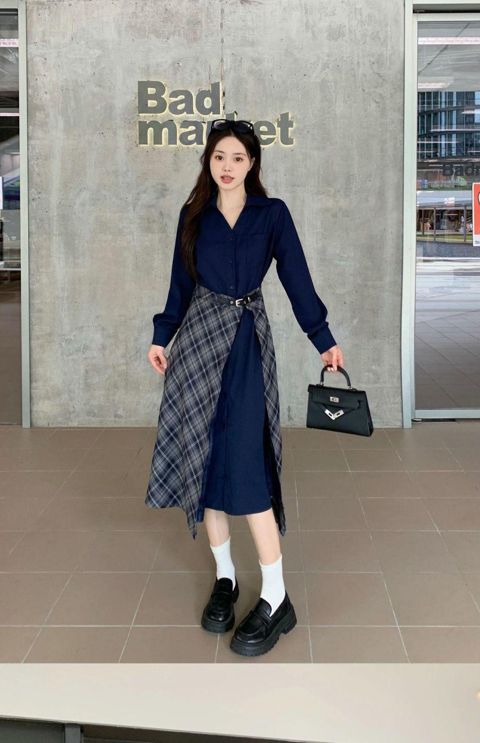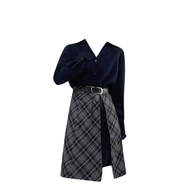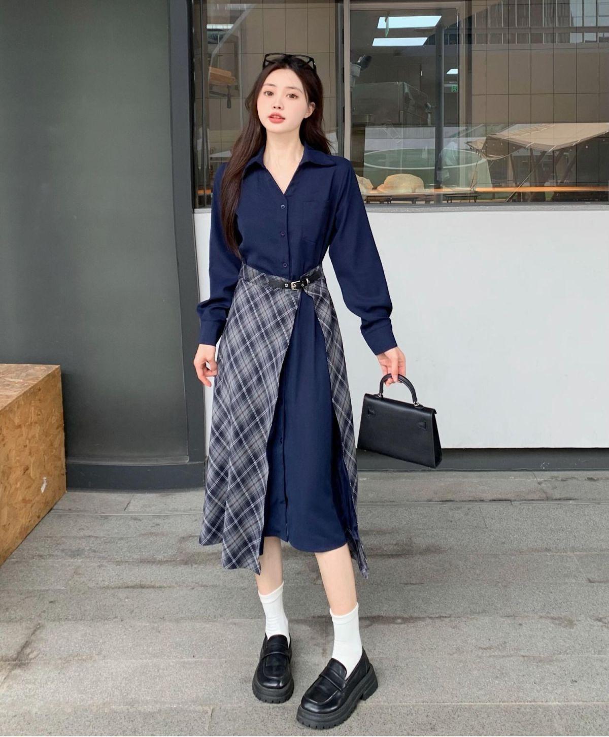 Vestido camisero de dos piezas con diseño de moda y falda corta a cuadros elegante de estilo francés para mujer de principios de primavera