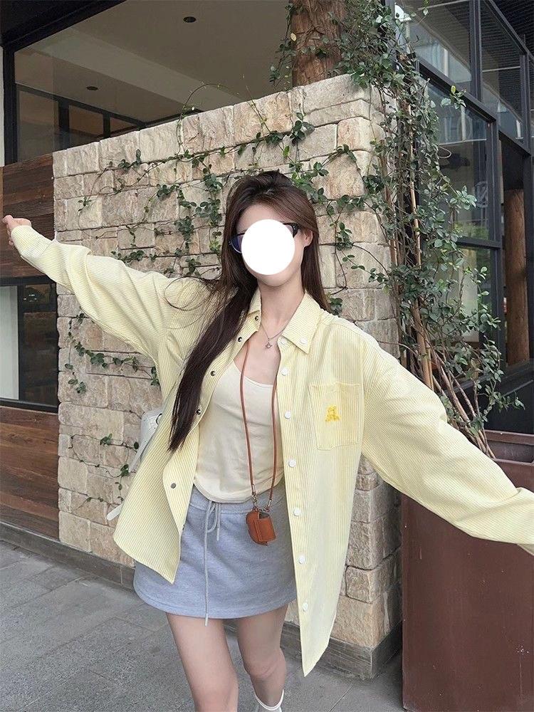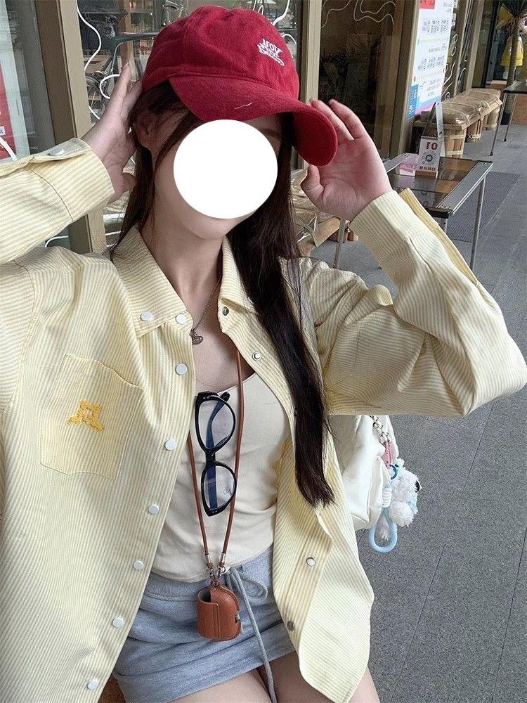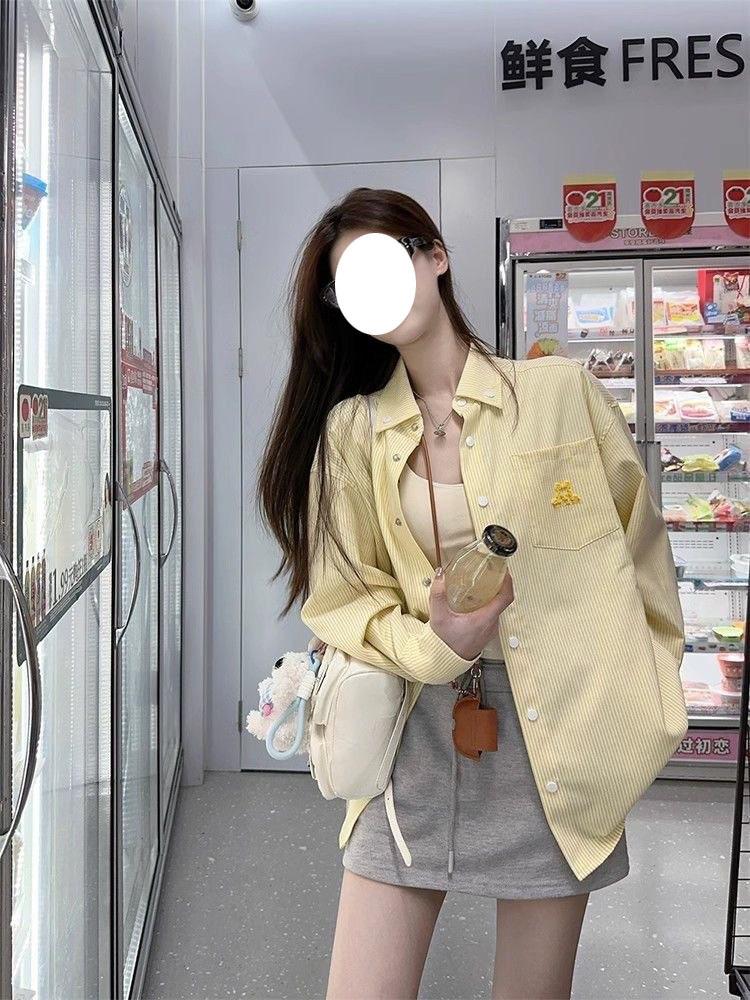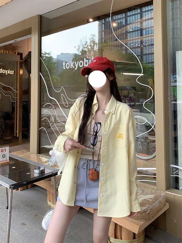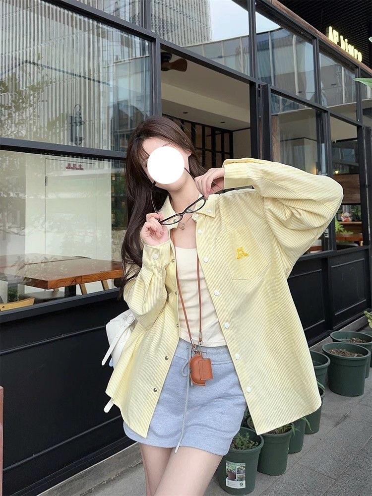Cárdigan de Manga Larga con Protección Solar Exterior Estilo Coreano para Mujer Nuevo de Primavera Temprana Bordado de Toalla a Rayas Suelto Camisa Camiseta con Cuello Polo