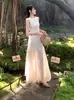 Vestido elegante de estilo francés con escote en V y encaje de manga corta para mujer, novedad de verano 2025, falda de cadera estilo diosa de alta gama