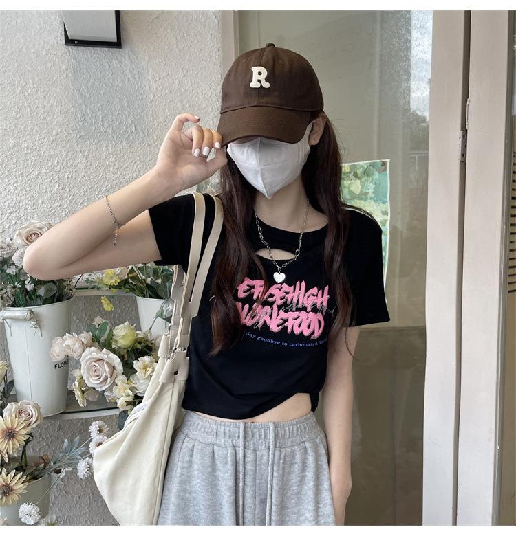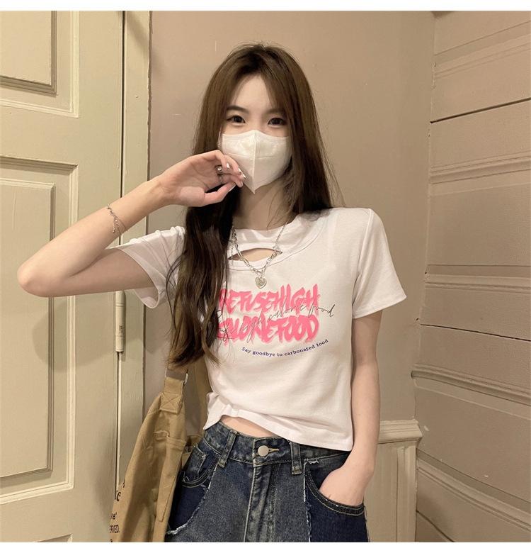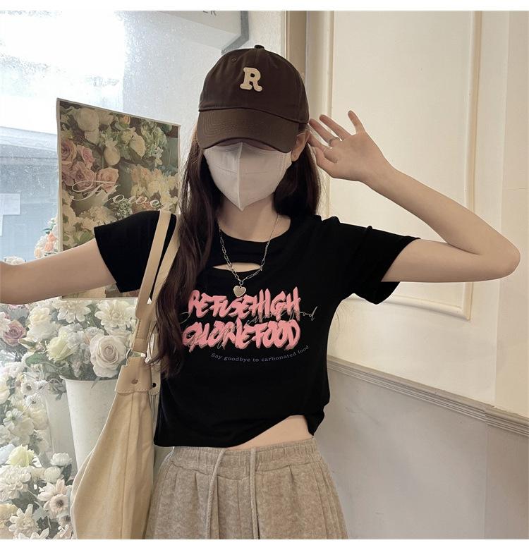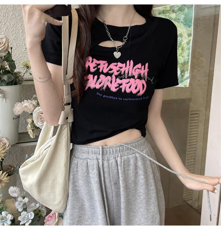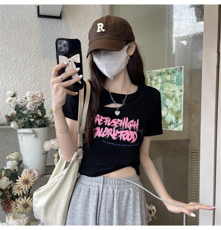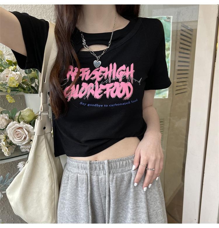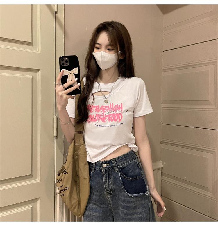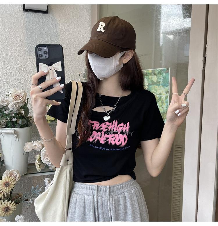 Camiseta de manga corta estilo americano para mujer, estilo sexy, verano 2025, nuevo diseño, top corto adelgazante con hombros descubiertos y tendencia