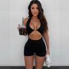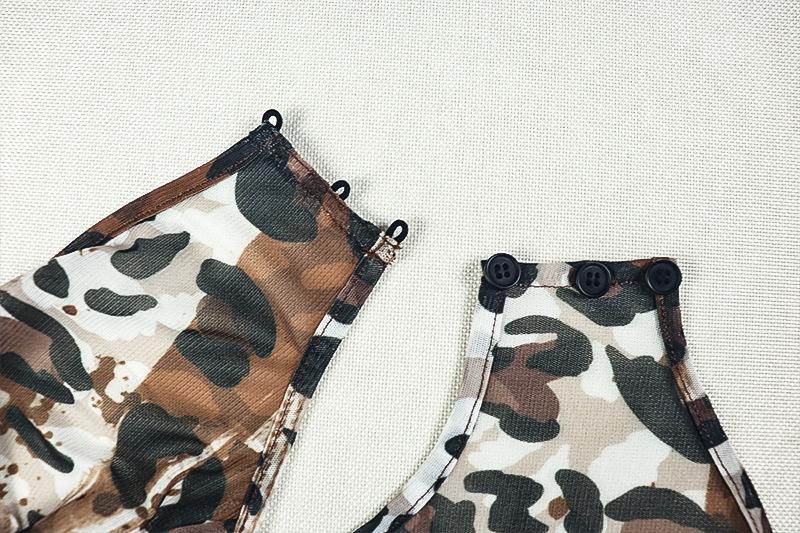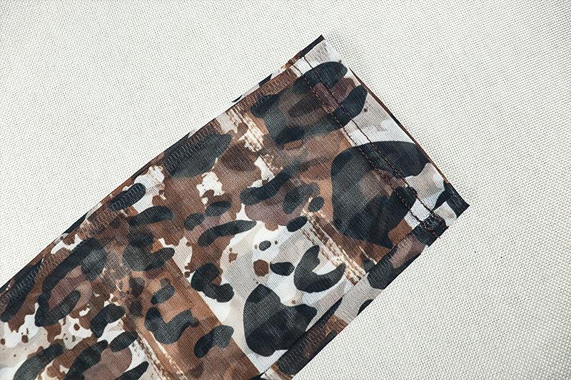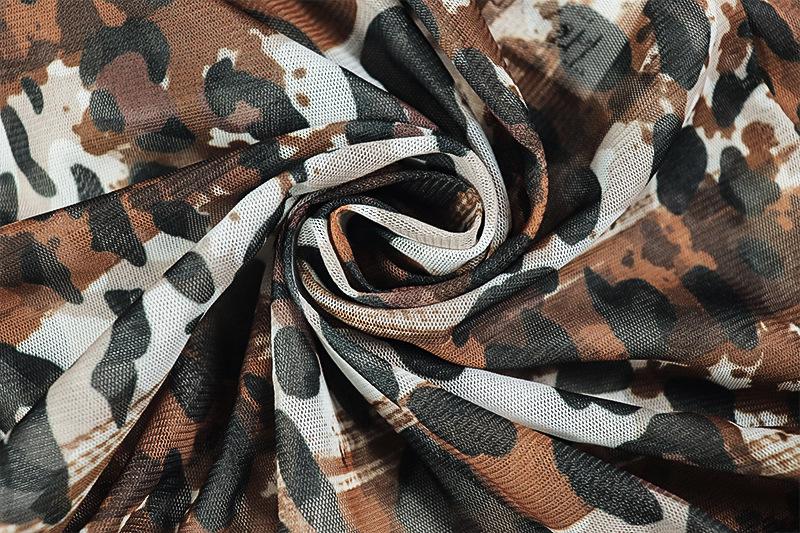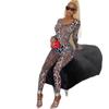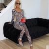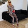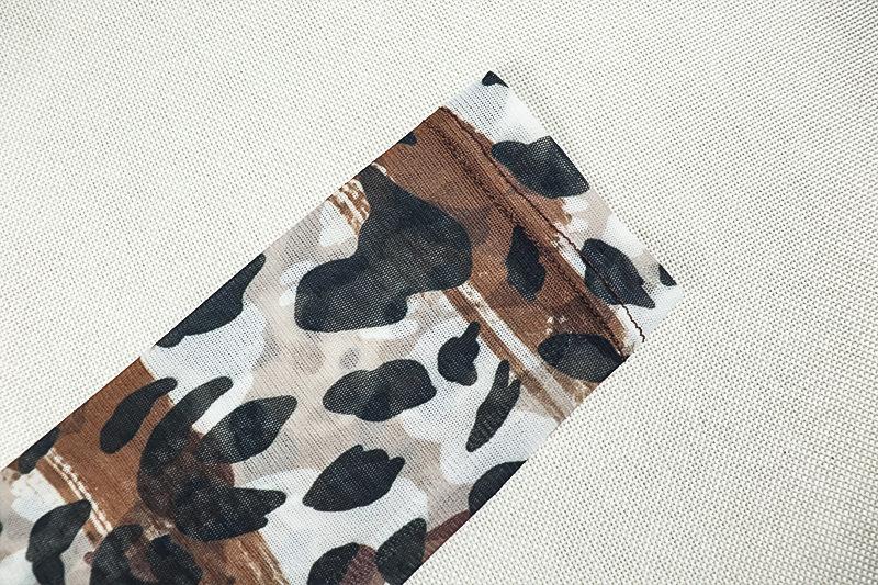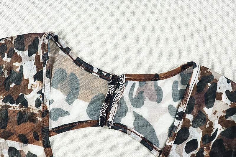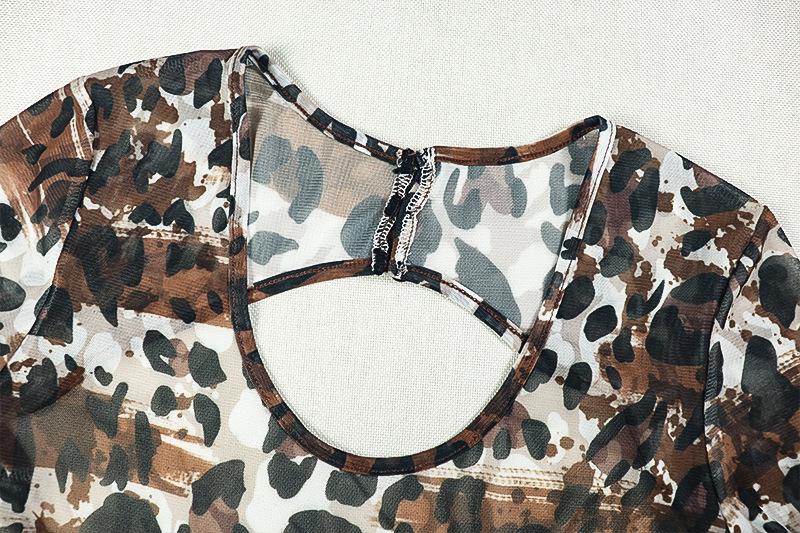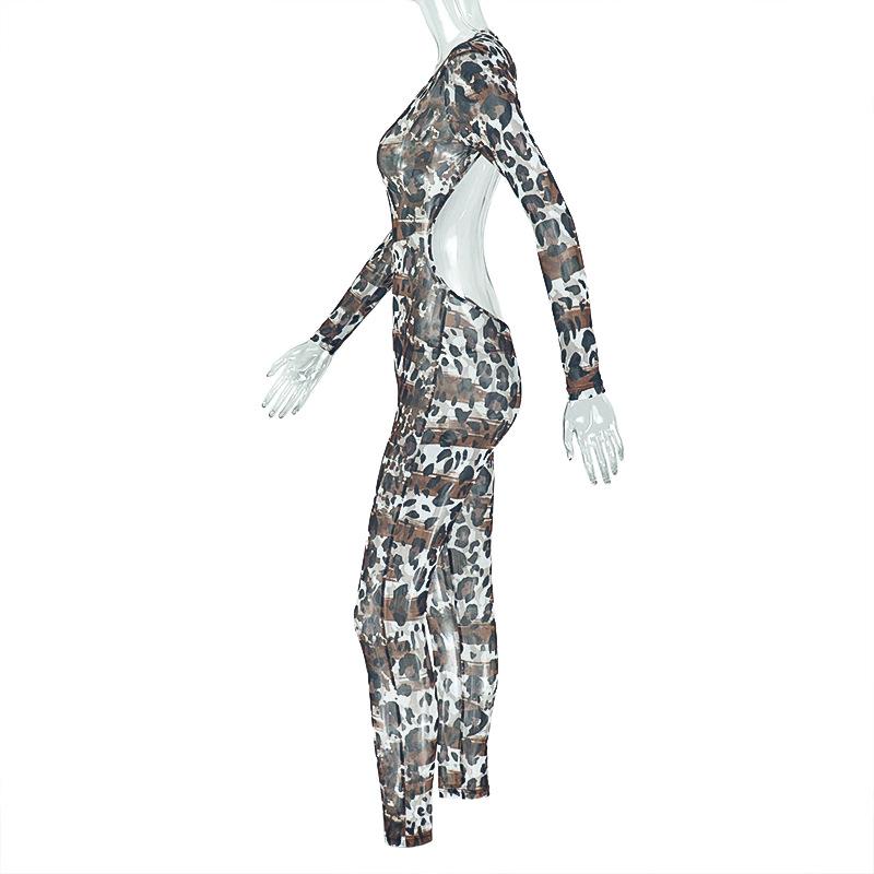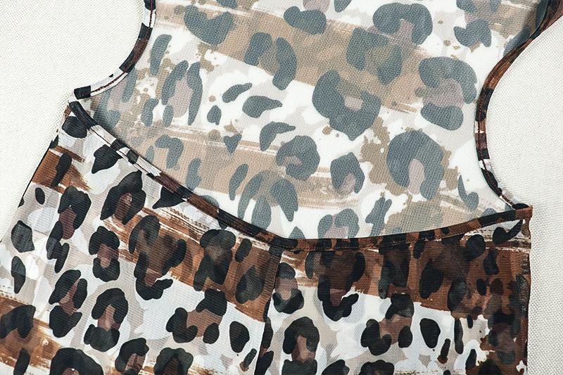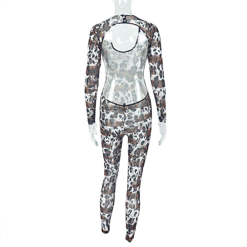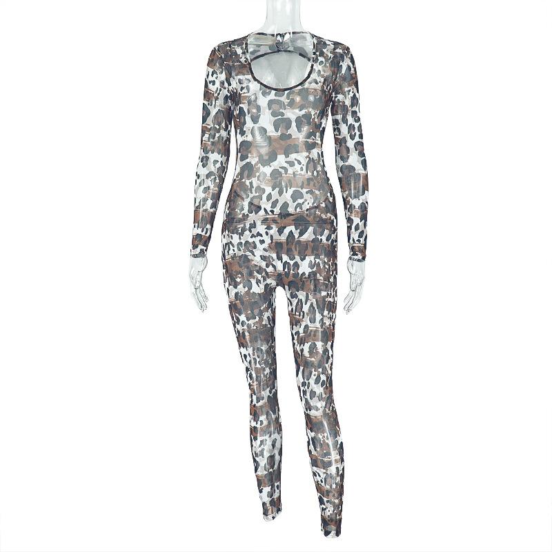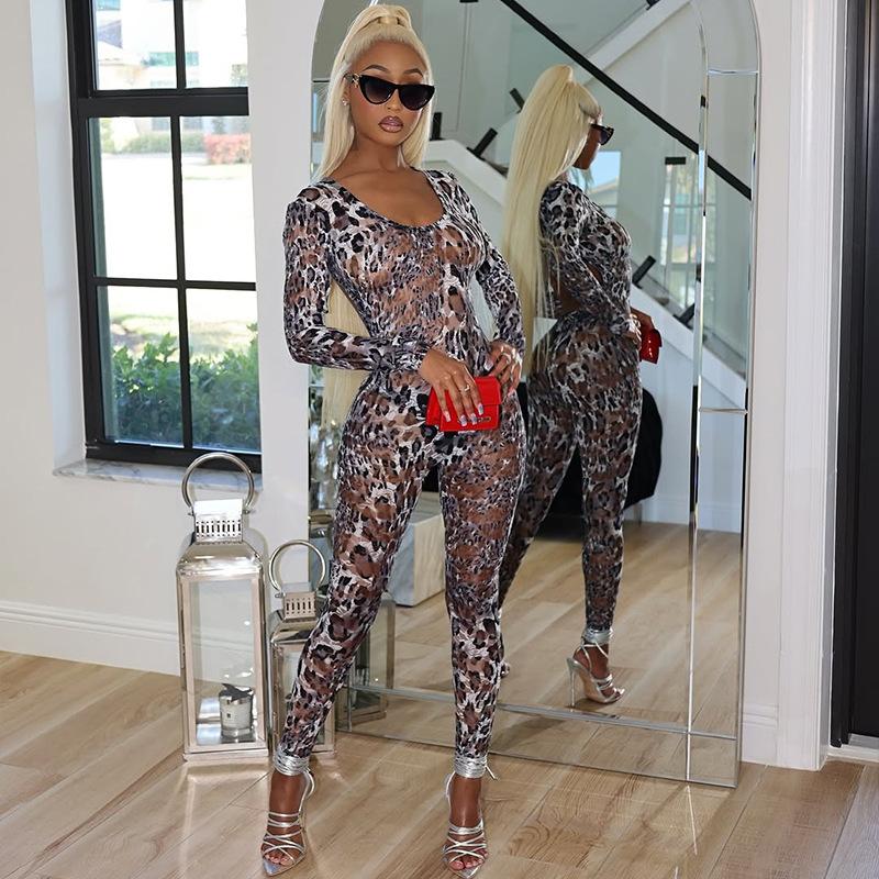 Mono deportivo informal transfronterizo de estilo europeo y americano para mujer, con estampado de leopardo, ajustado, con cuello en U microtransparente y hueco.