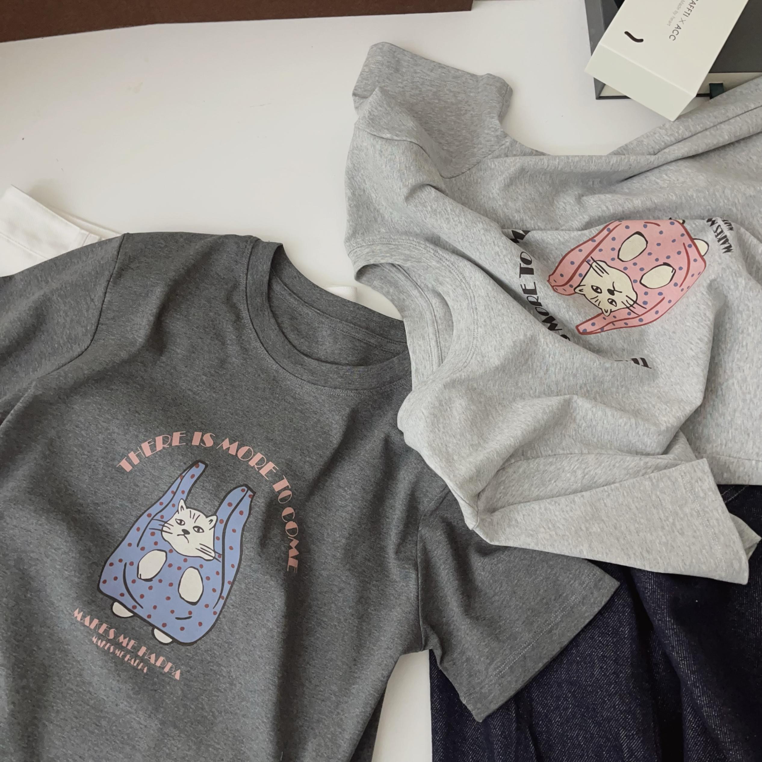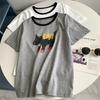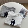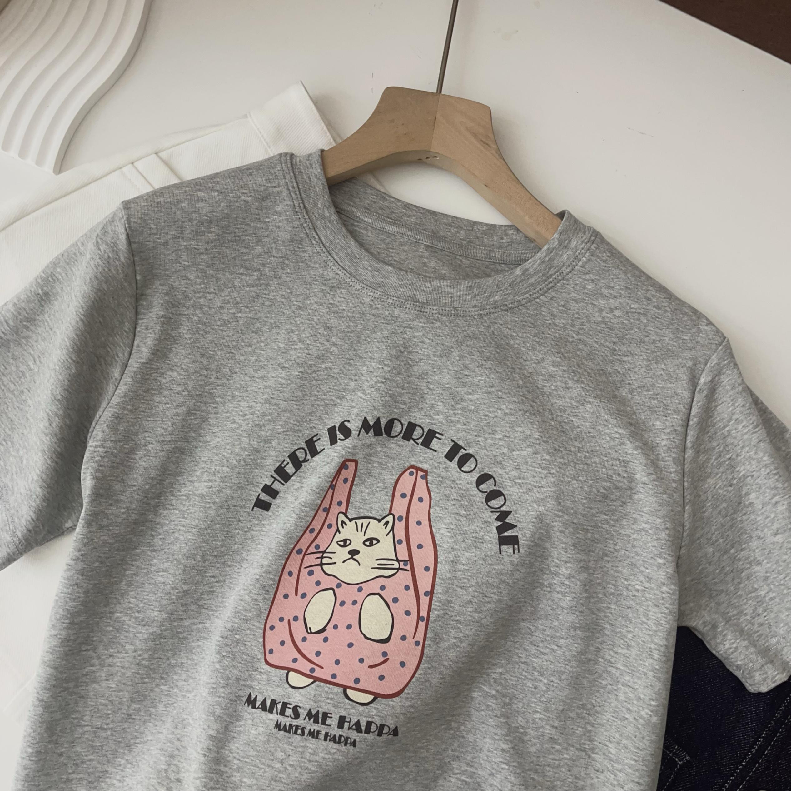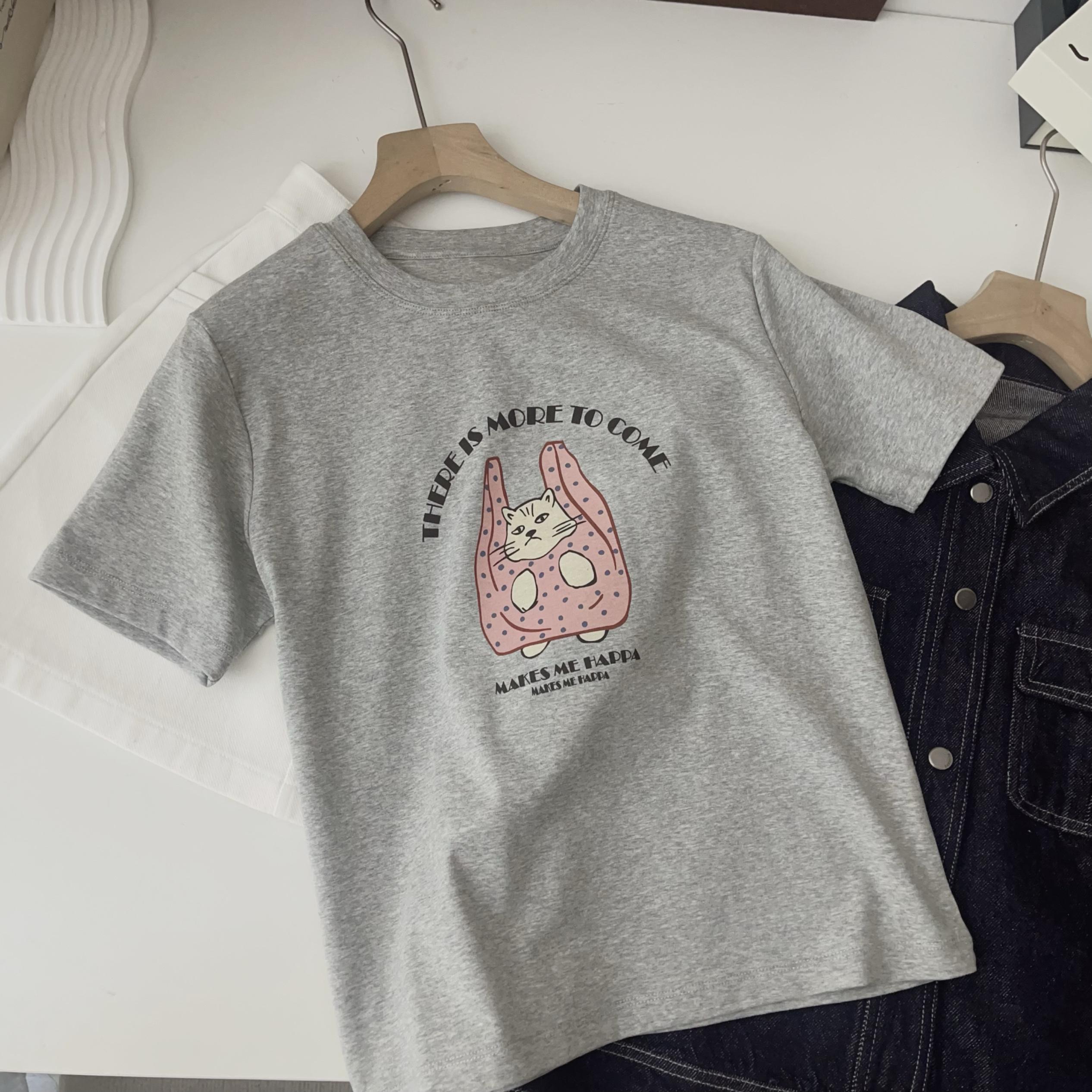 Camiseta de manga corta con estampado de gato de dibujos animados para mujer, primavera 2025, estilo coreano, combinable con todo, antiedad, estilo occidental, moderna.