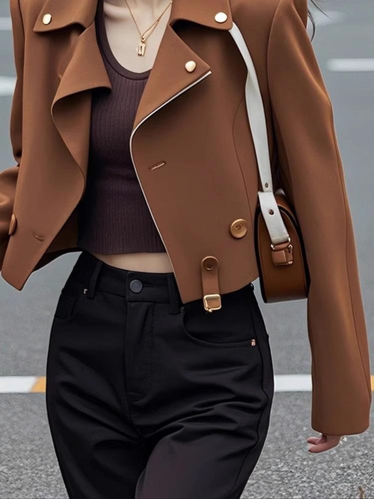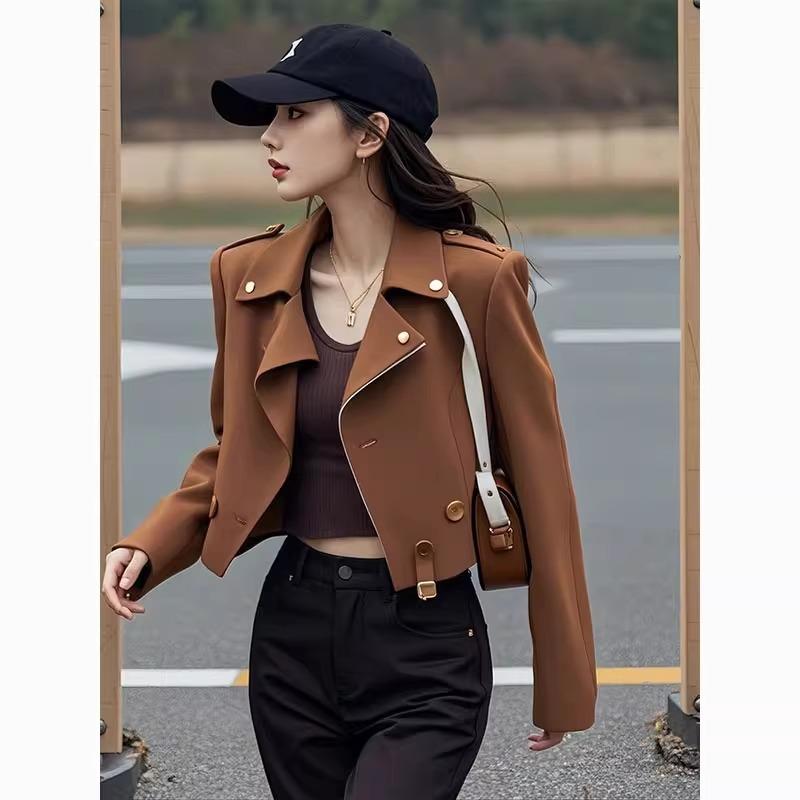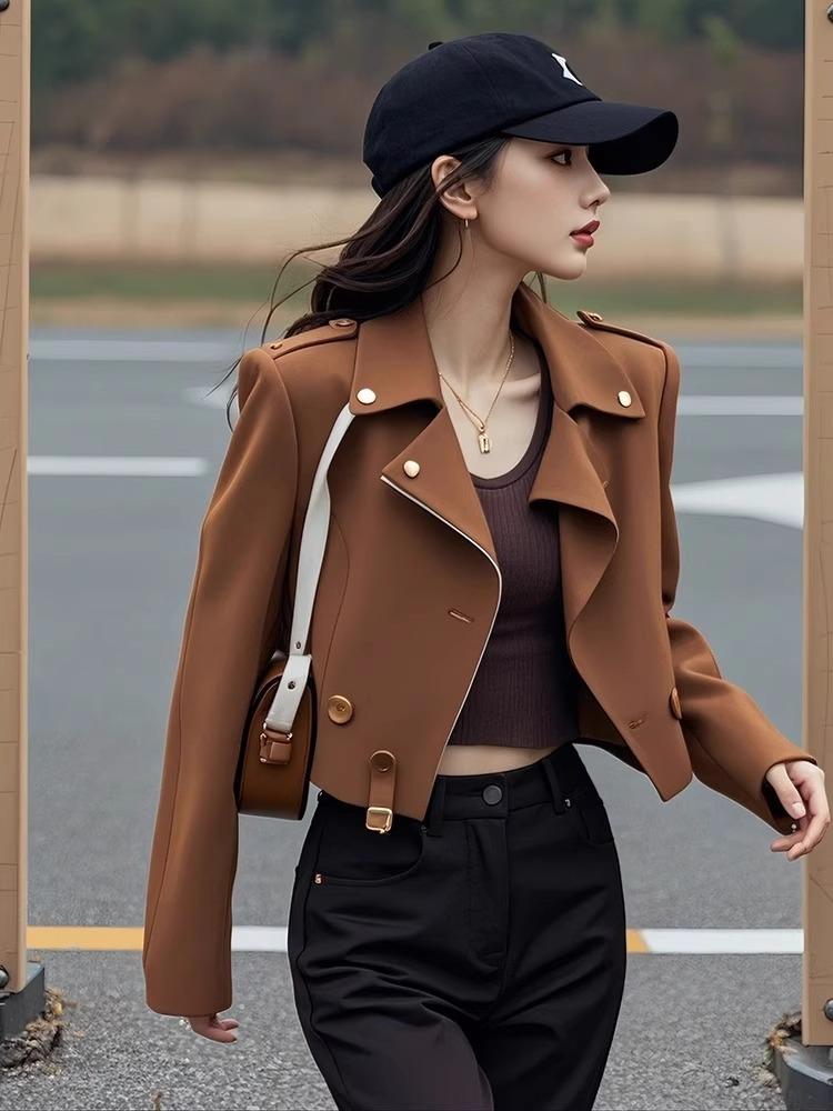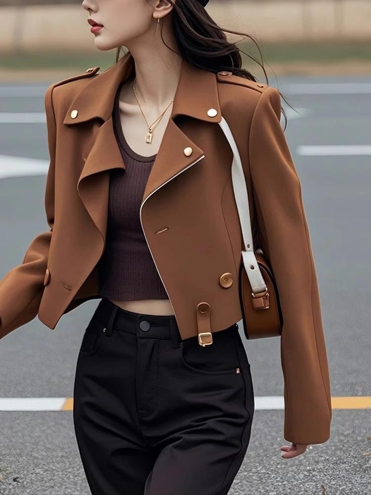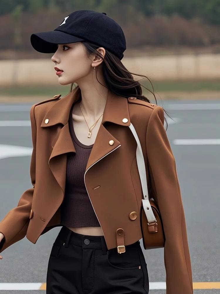 Abrigo corto marrón de alta calidad con diseño de diosa del temperamento para mujer, otoño 2024, nuevo estilo, pequeño, único y súper bonito.
