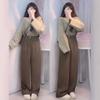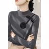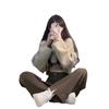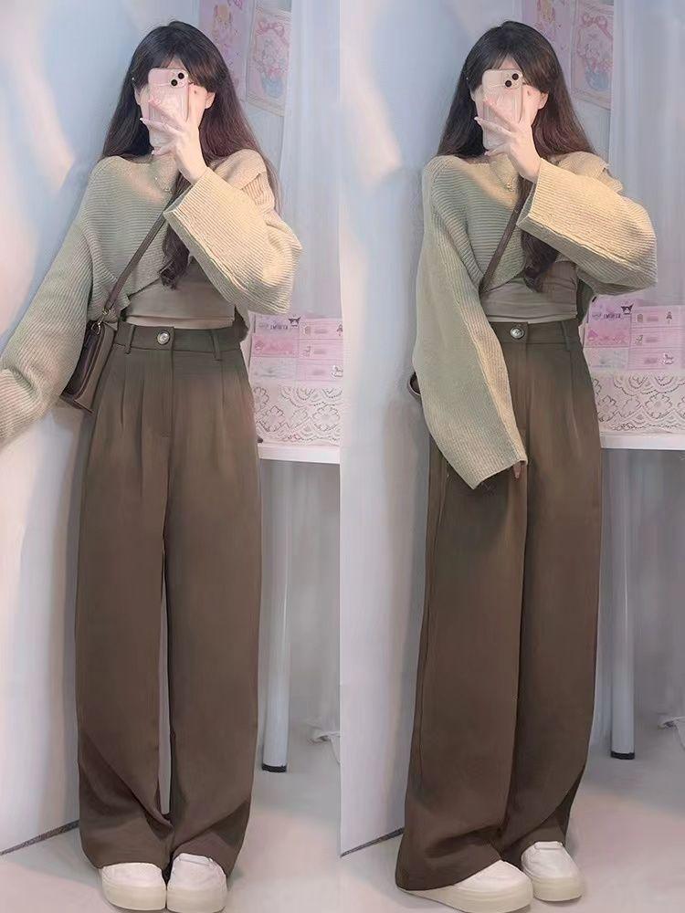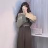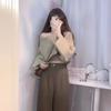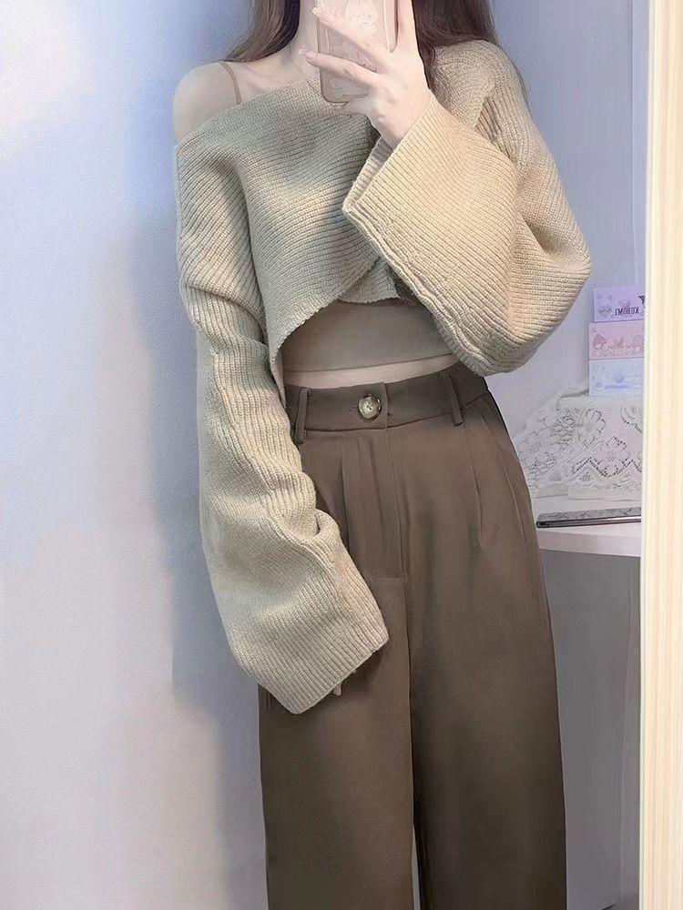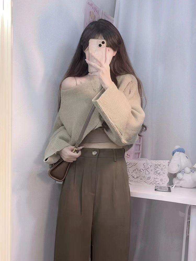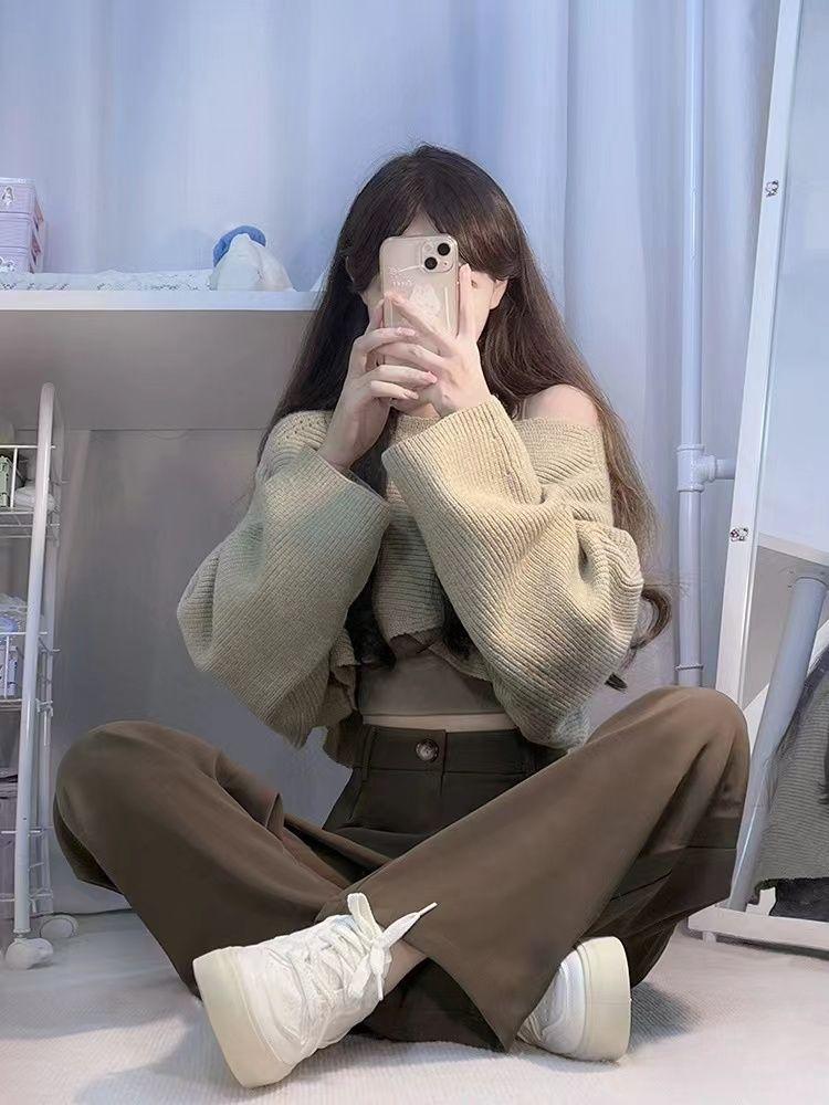 Suéter Corto Suave y Encerado de Otoño e Invierno para Mujer Nuevo Caqui Cuello Diseño Irregular de Color Sólido Top de Moda