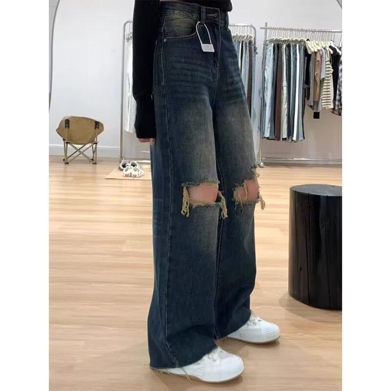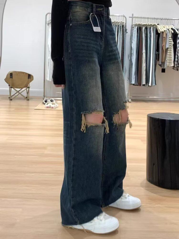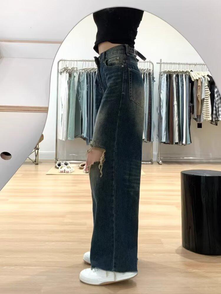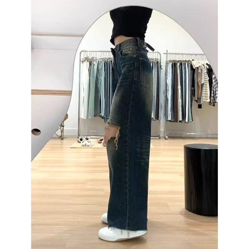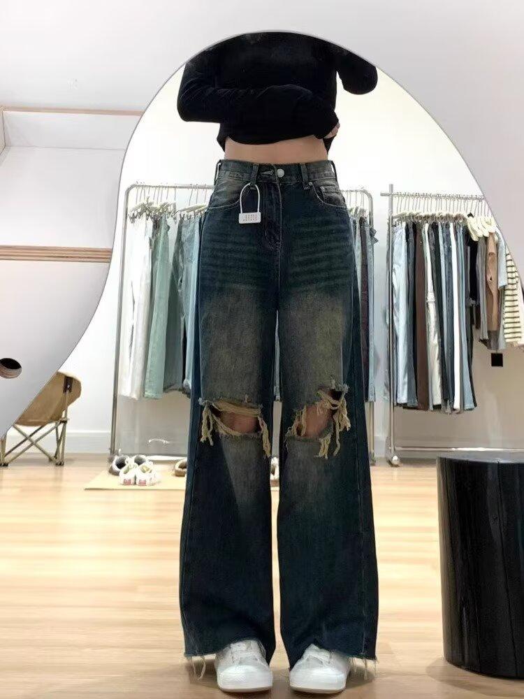 Jeans Rotos Americanos Retro para Mujer Alta Verano Nuevo Deshilachados Sueltos Rectos Pierna Ancha Largo hasta el Piso