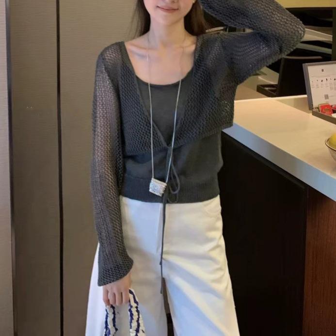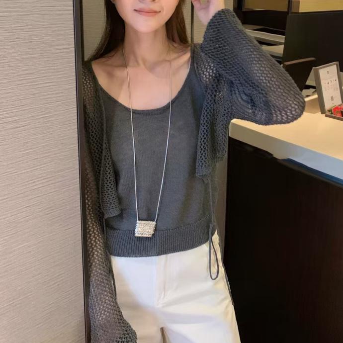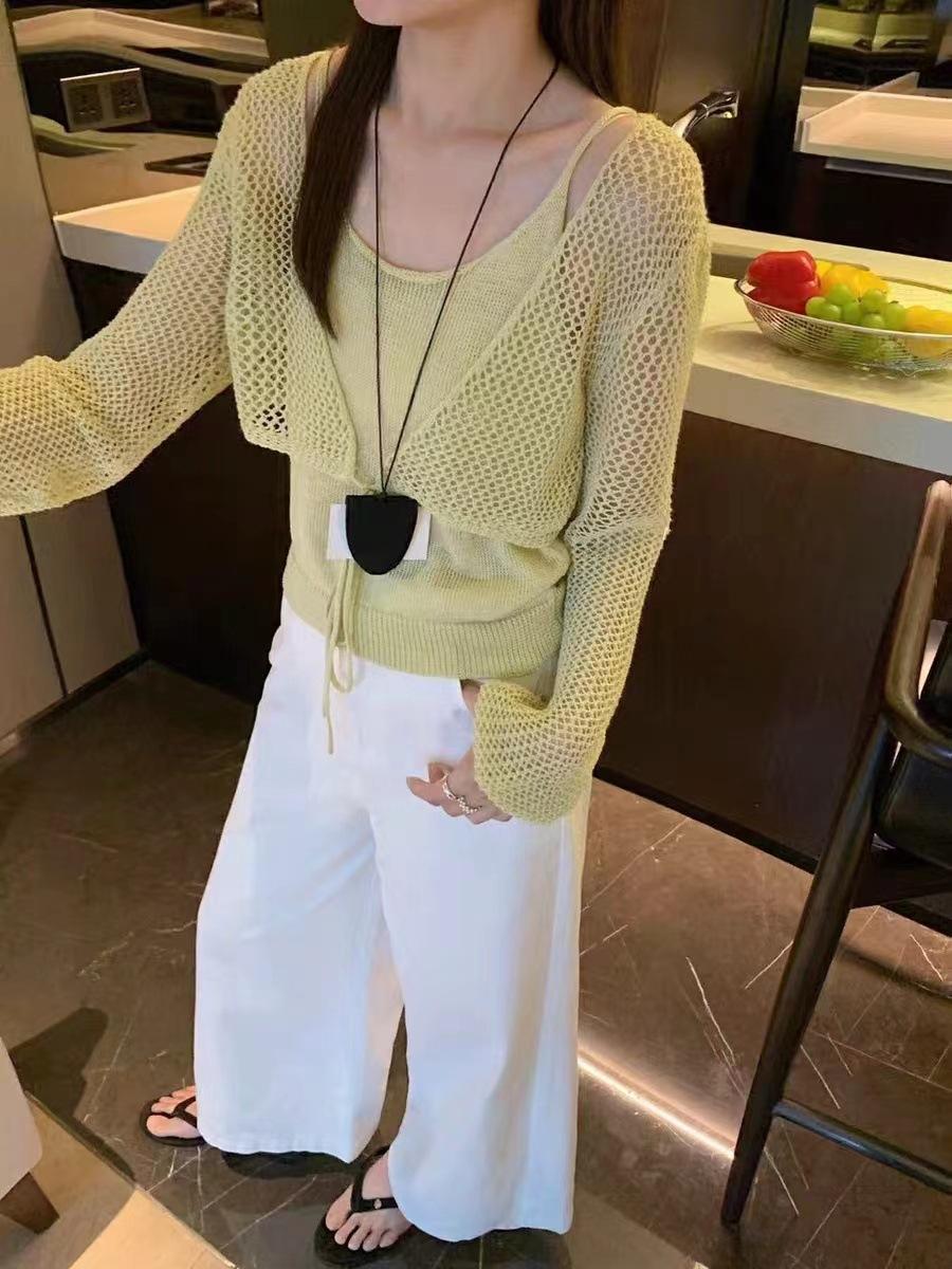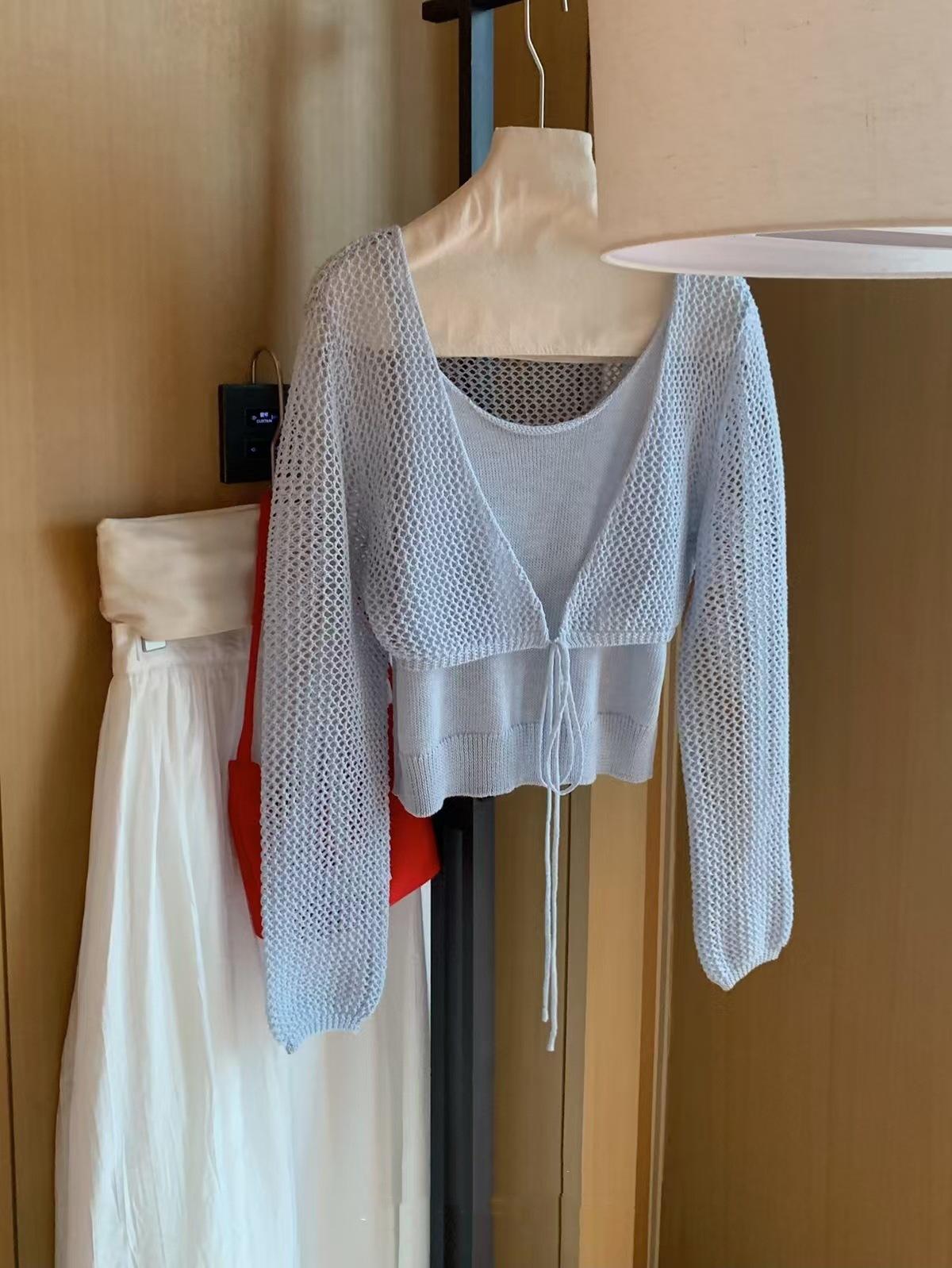 Chaleco de punto hueco de seda de hielo Conjunto de dos piezas Traje de protección solar para mujer Primavera y verano Chaqueta fina transpirable