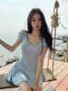 Vestido de verano de manga corta con cuello cuadrado y cintura abullonada de princesa para mujer, versión coreana de INS, estilo viento suave y dulce