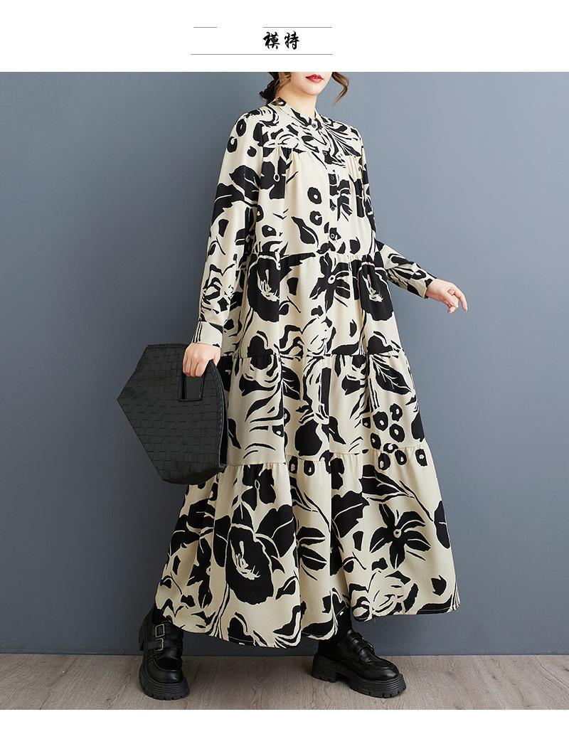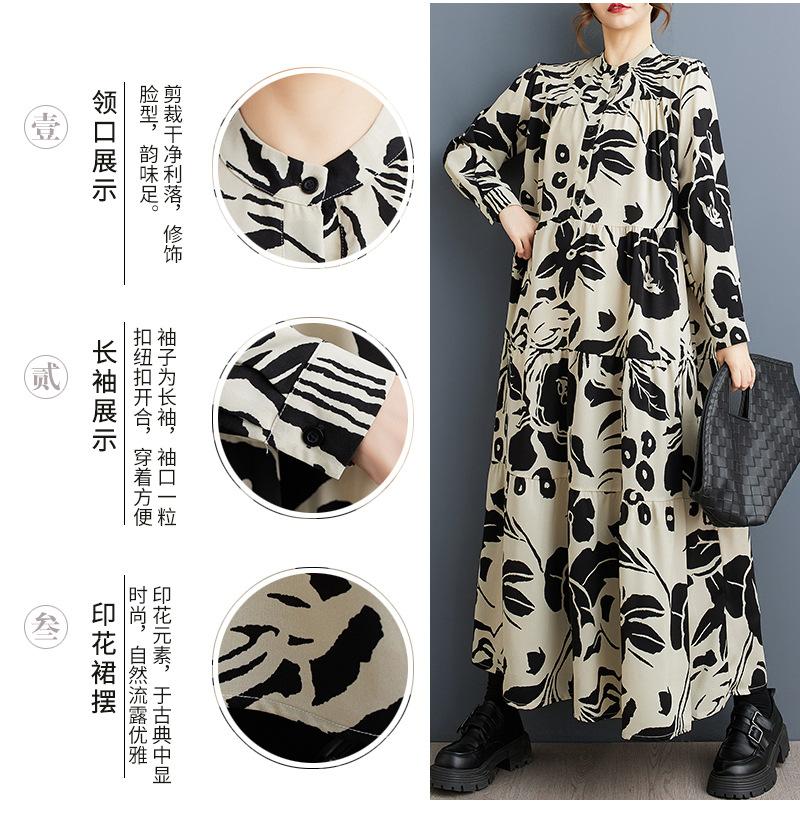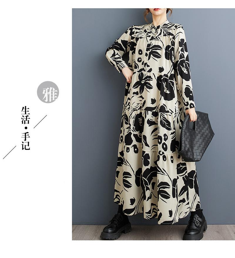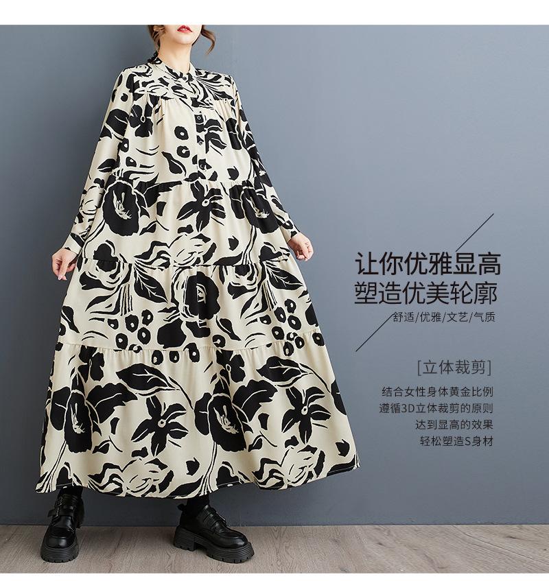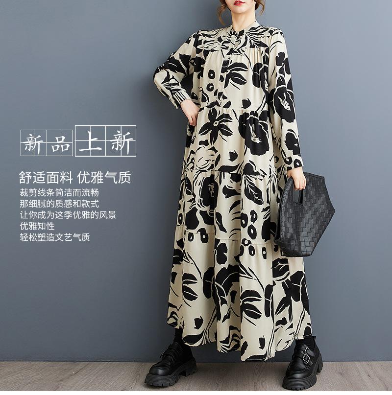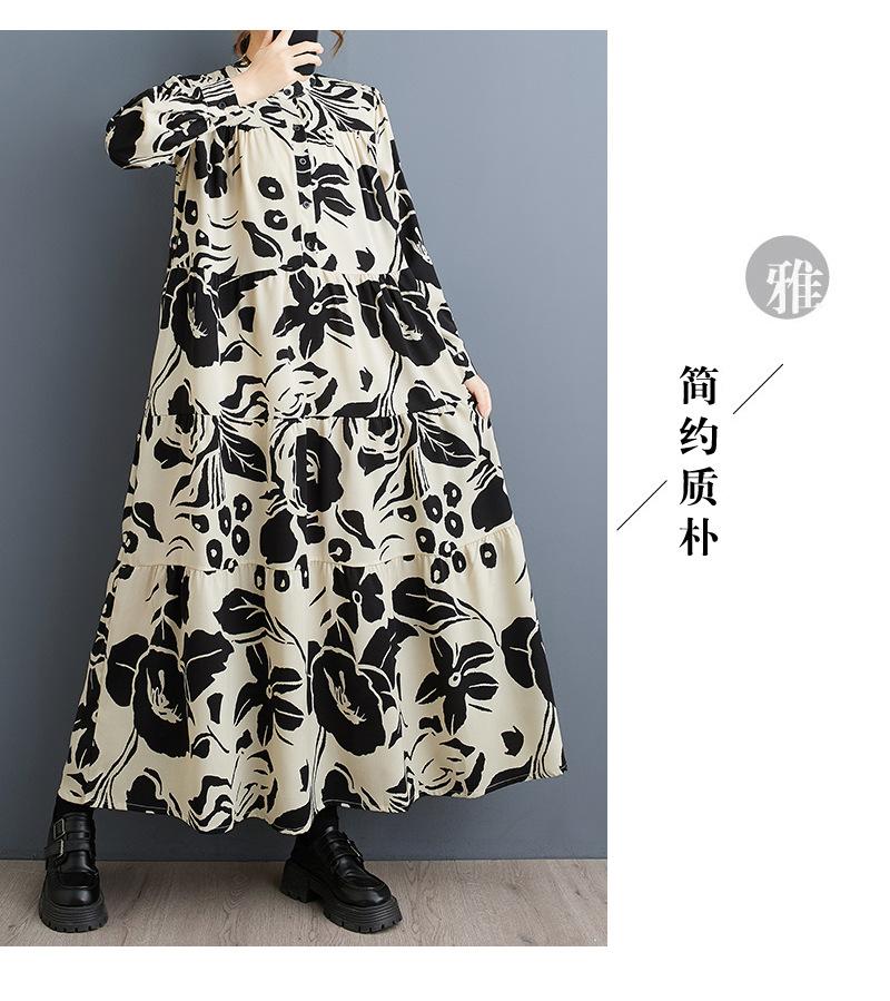 Primavera y Otoño 2025 Nuevo Talla Grande Cuello Redondo Manga Larga Suelto Amplio Vuelo Vestido de Comercio Exterior para Madres de Mediana Edad y Mayores