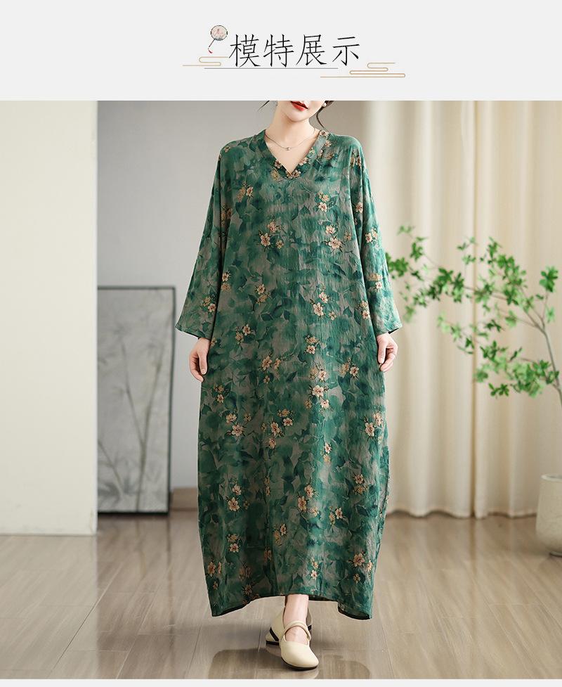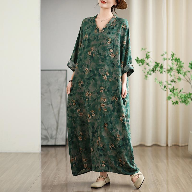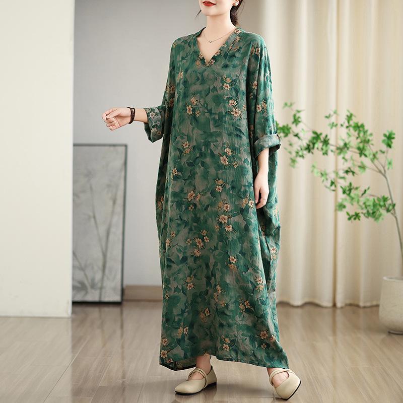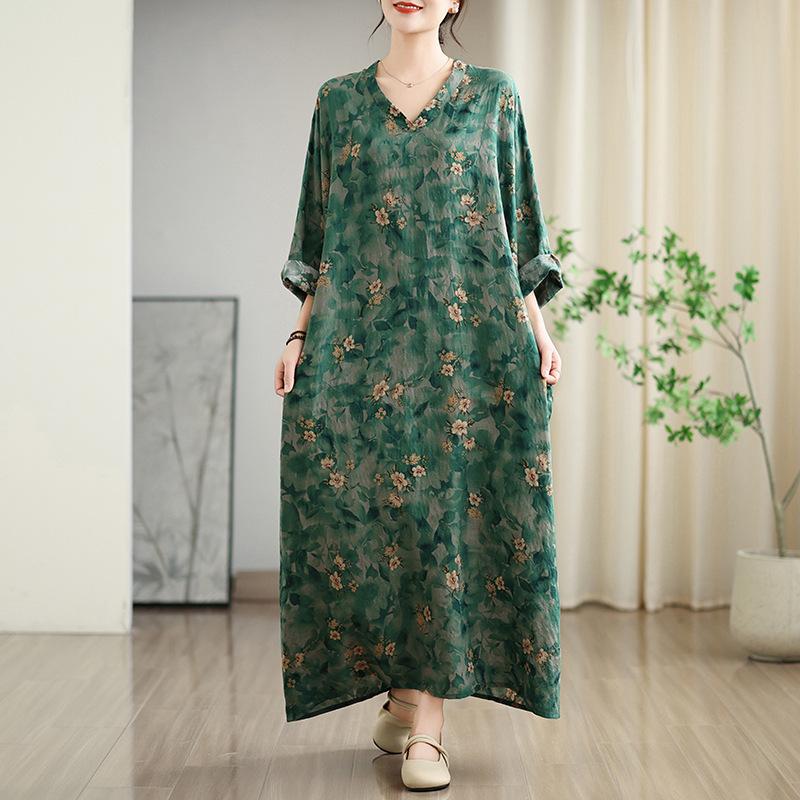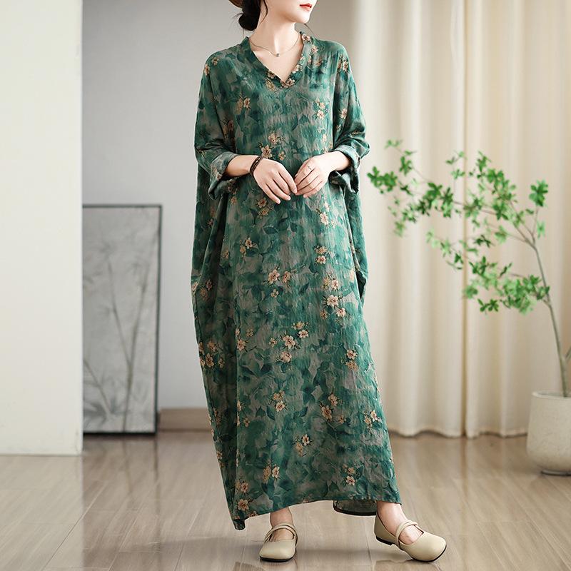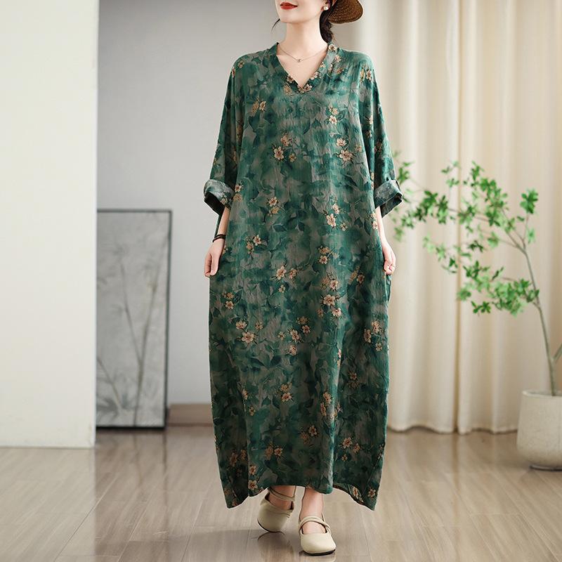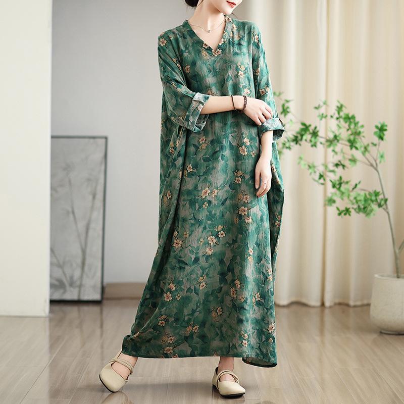 Vestido de algodón y lino con cuello en V, estilo retro, estilo festivo, de viaje, con falda larga y color, de principios de primavera de 2025.