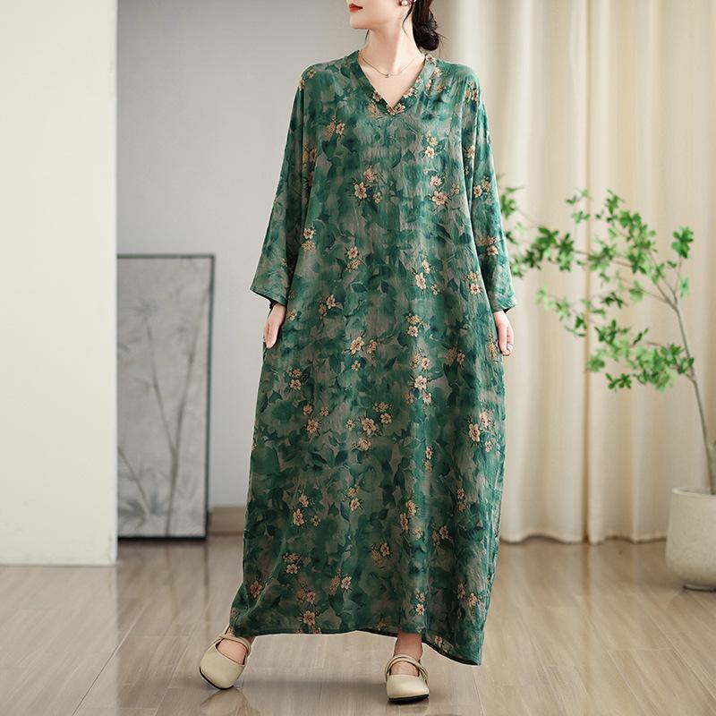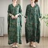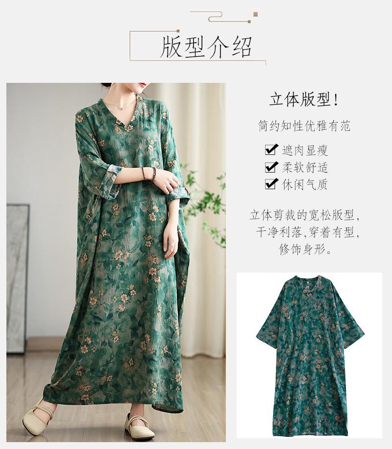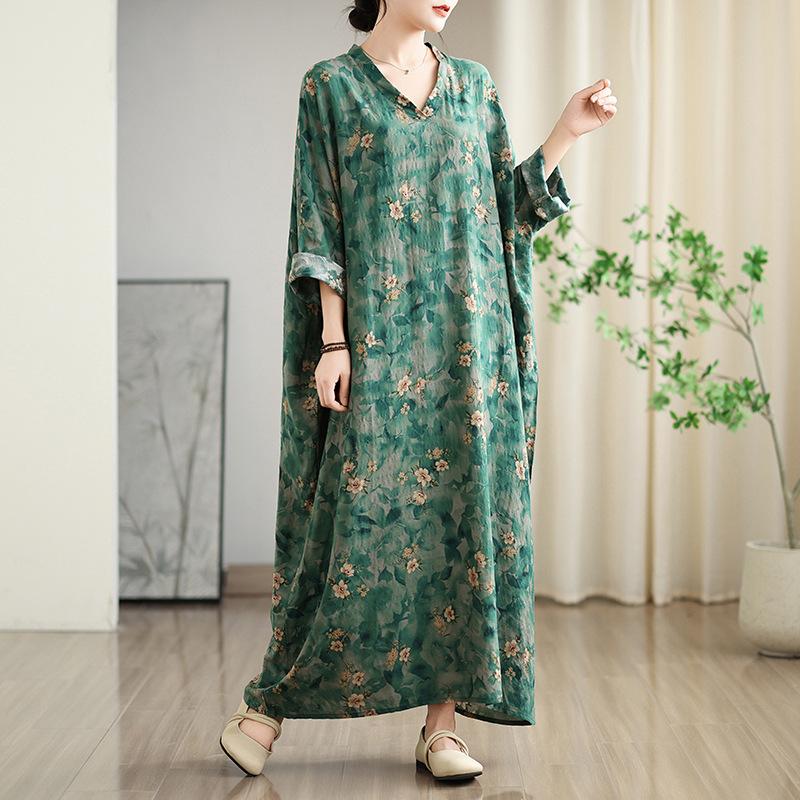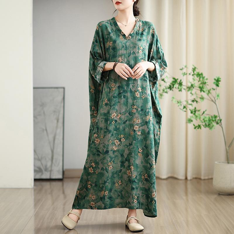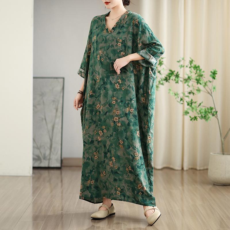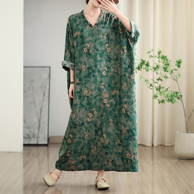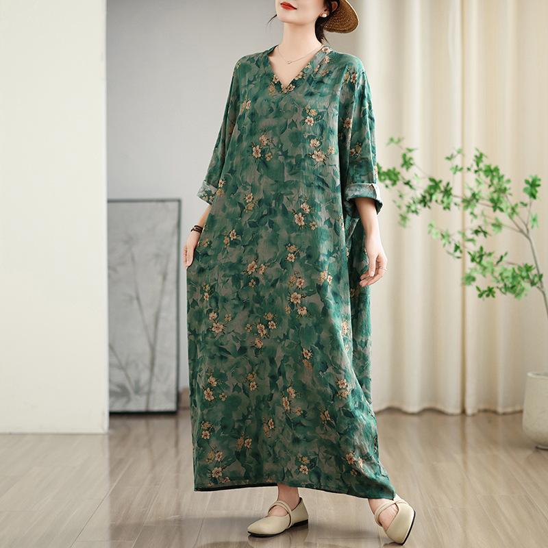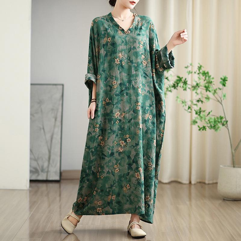 Vestido de algodón y lino con cuello en V, estilo retro, estilo festivo, de viaje, con falda larga y color, de principios de primavera de 2025.