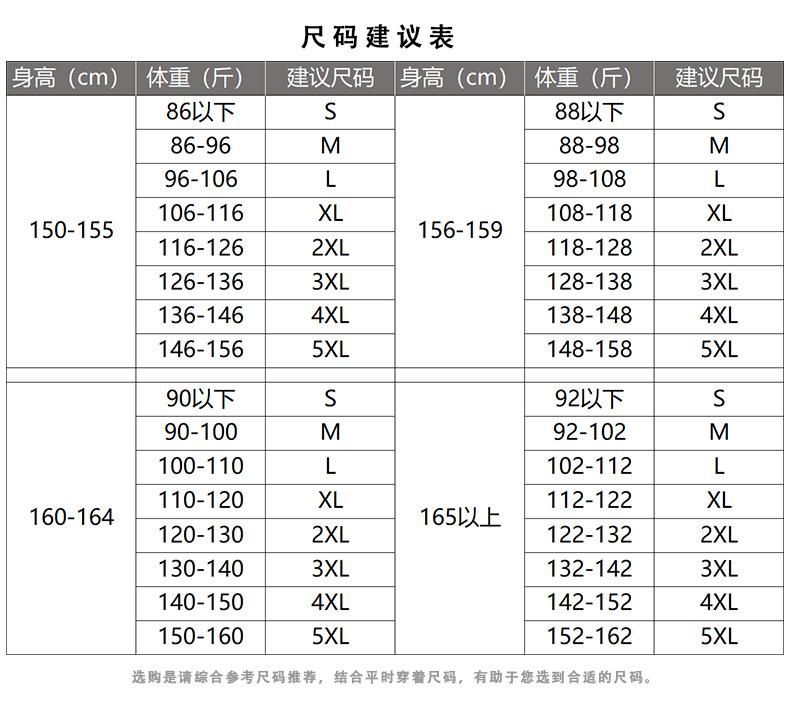 S below 86, M 43-48kg, L 48-53kg, Xl 53-58kg, 2xl 58-63kg, 3xl 63-68kg, 4xl 68-73kg, 5XL 146-156