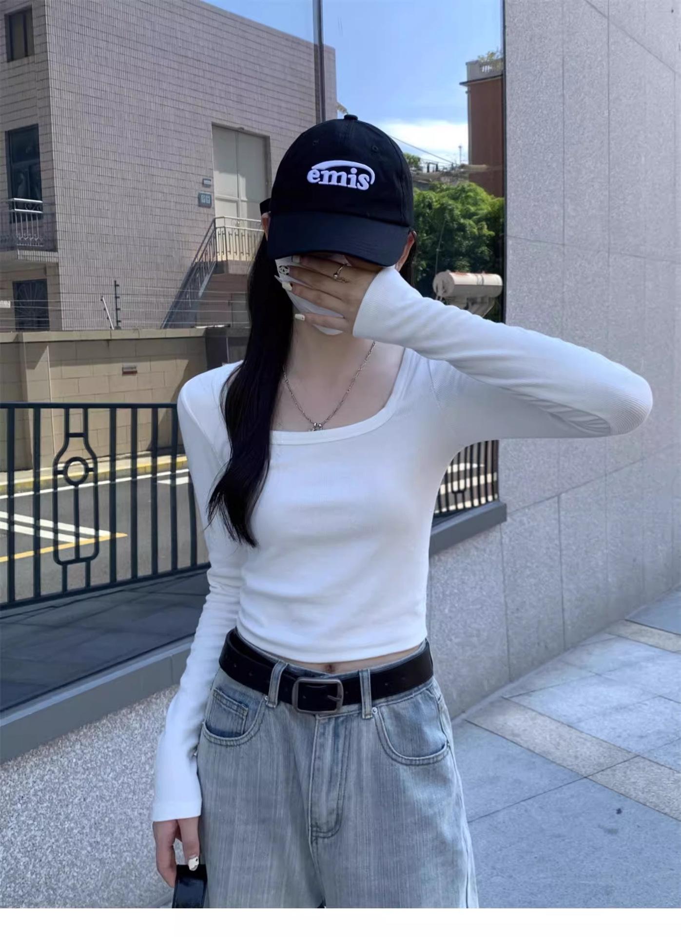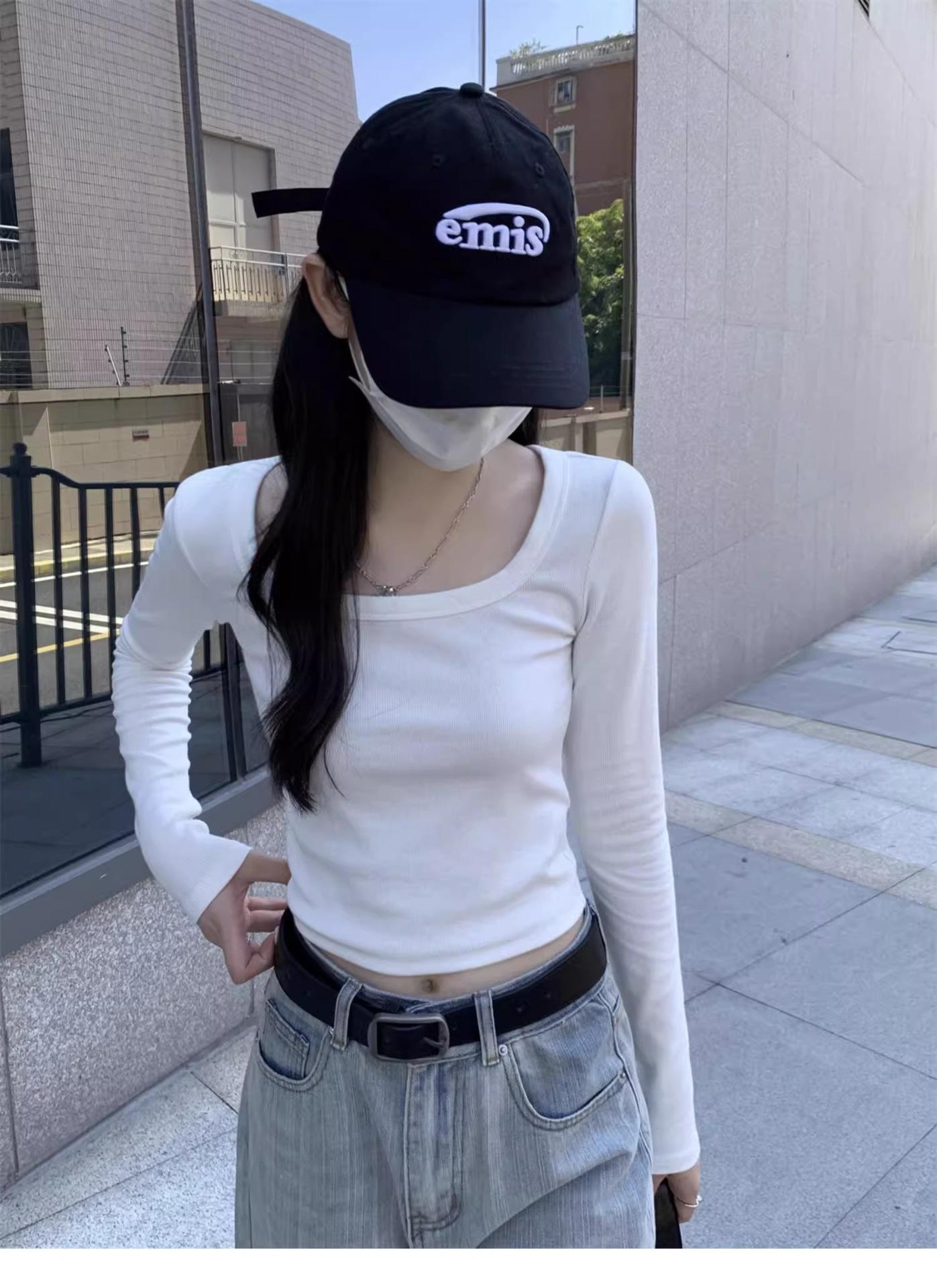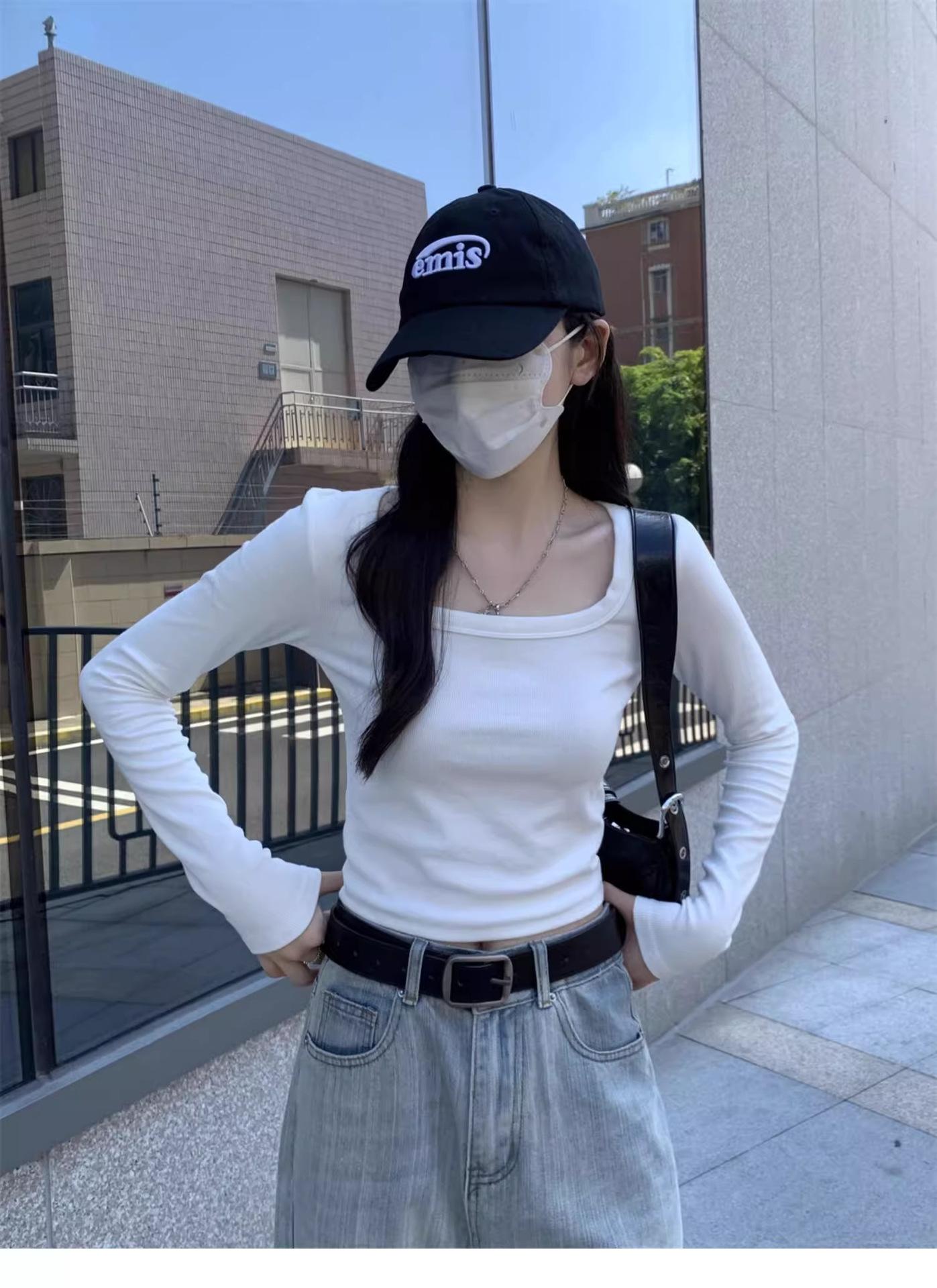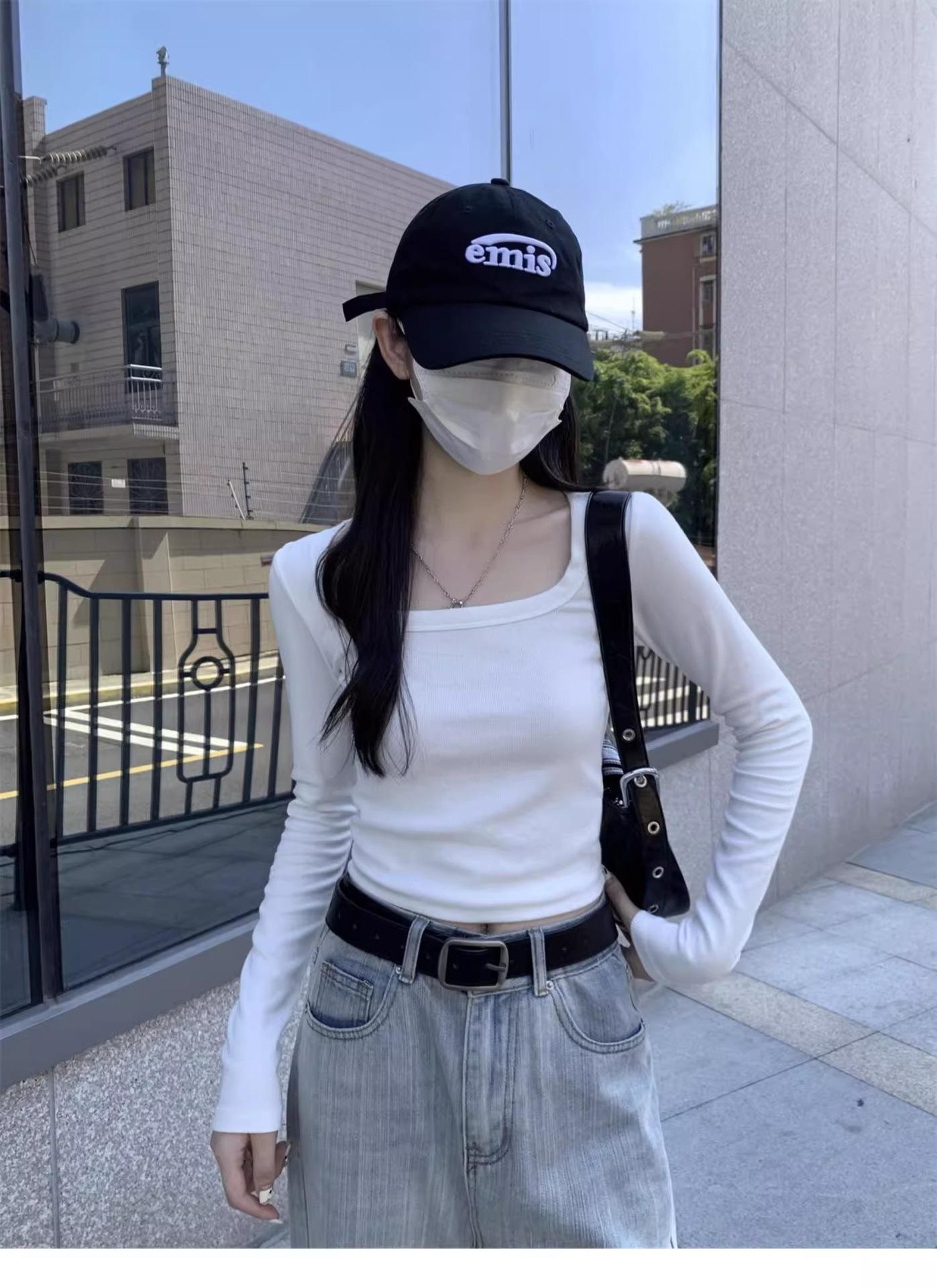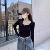 Camiseta de manga larga con cuello cuadrado y hombros descubiertos para otoño, estilo Spice Girls Pure Desire Niche Ins, ajustada y adelgazante.