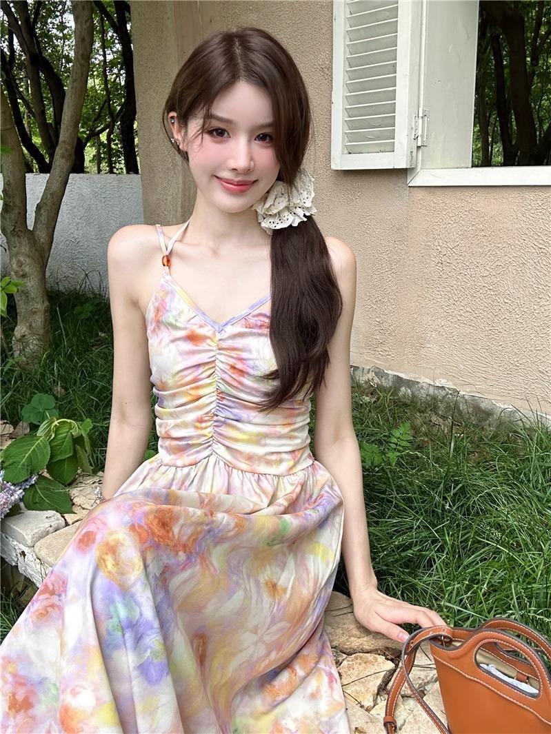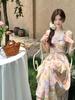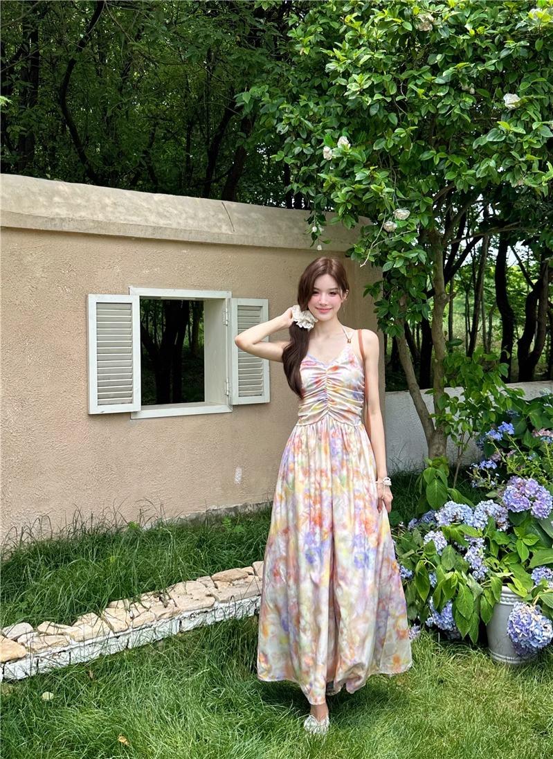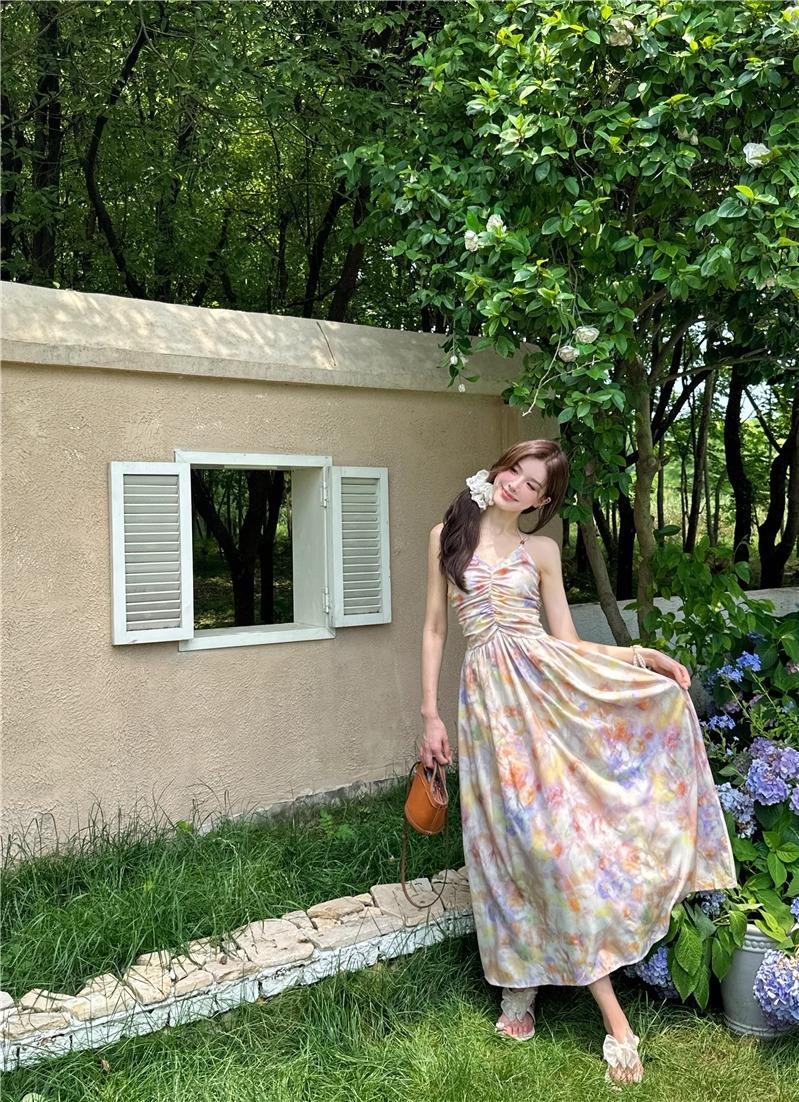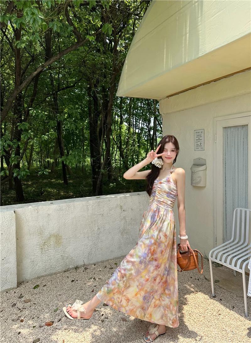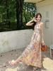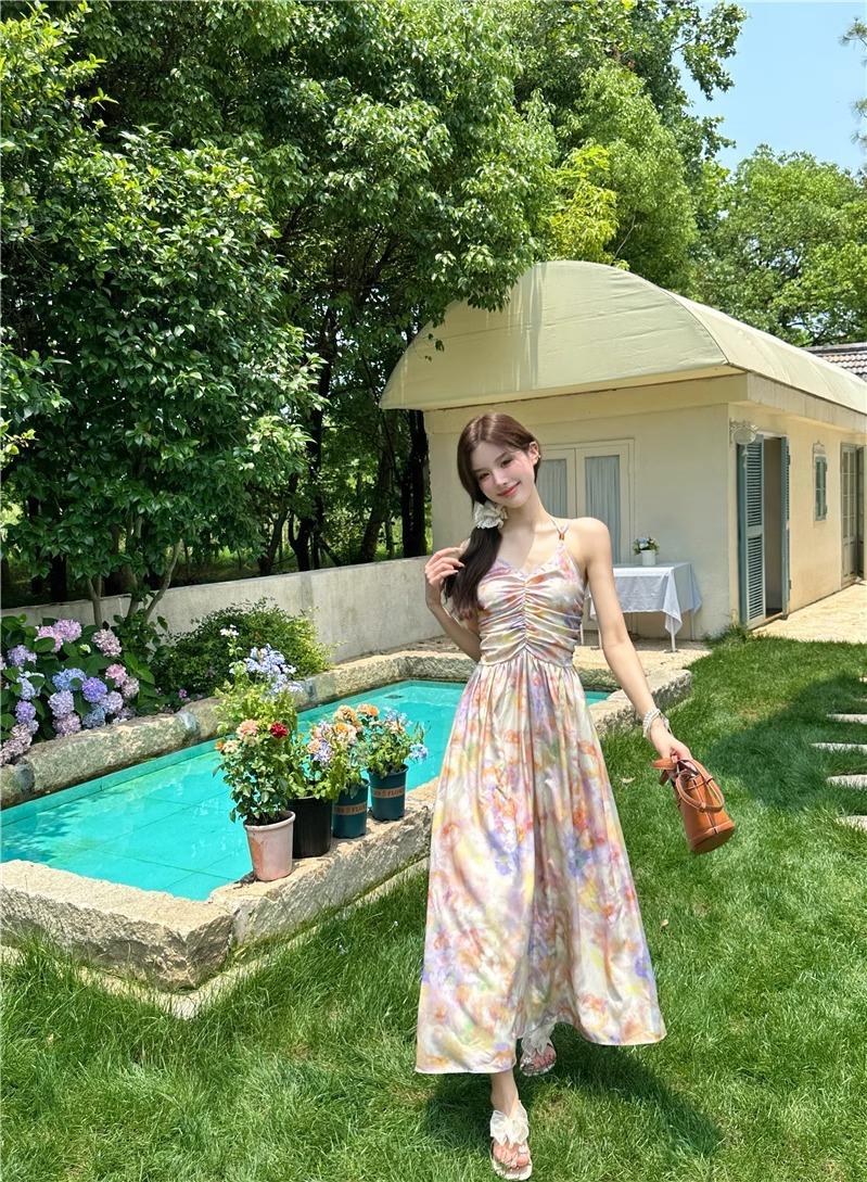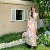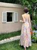 Vestido de verano para mujer, elegante, con espalda descubierta y cintura larga, estilo vacaciones, con cuello colgante y estampado floral, pintura al óleo retro francesa