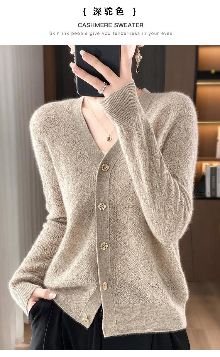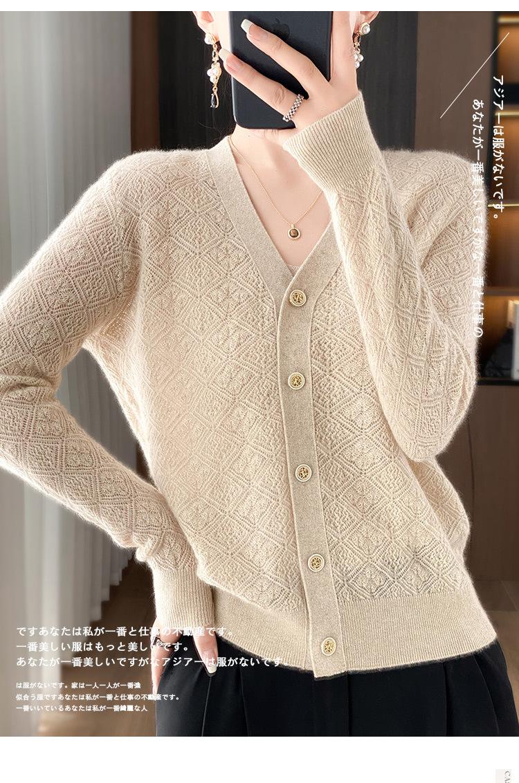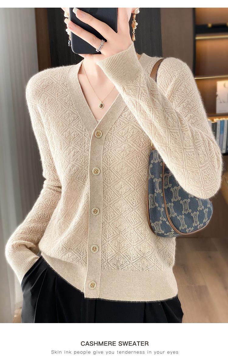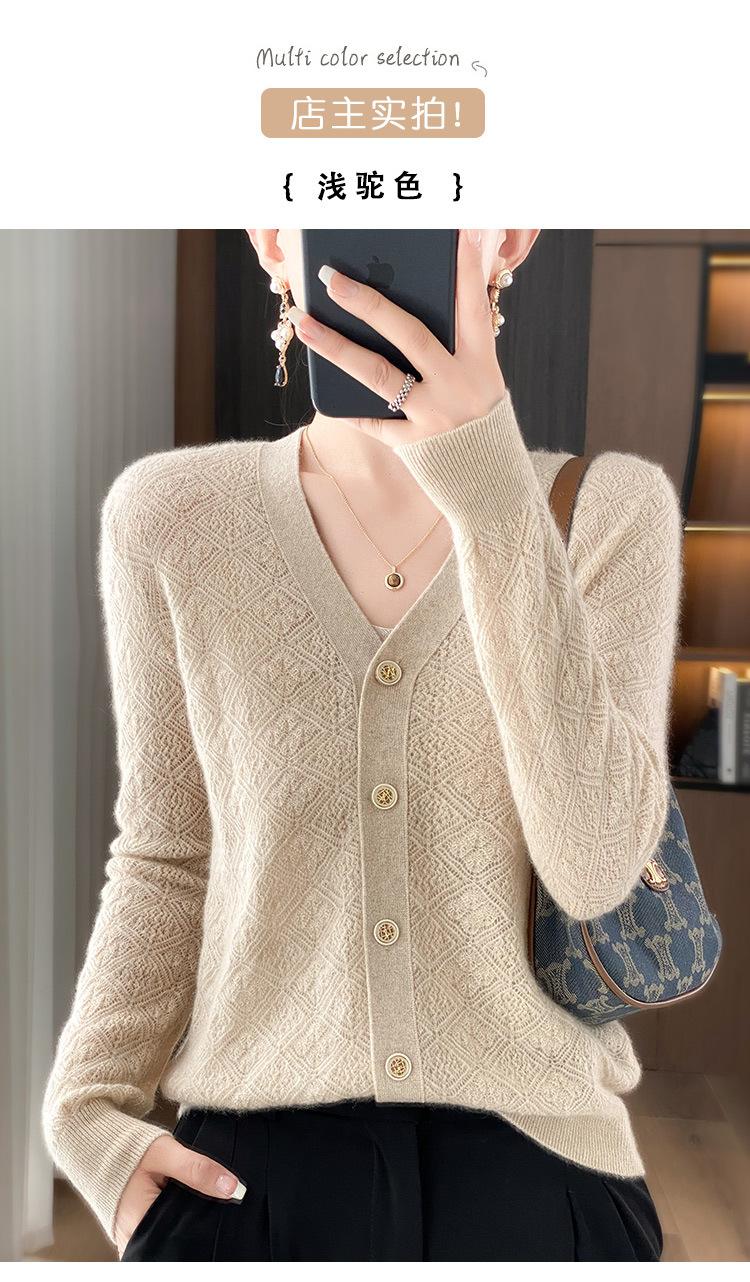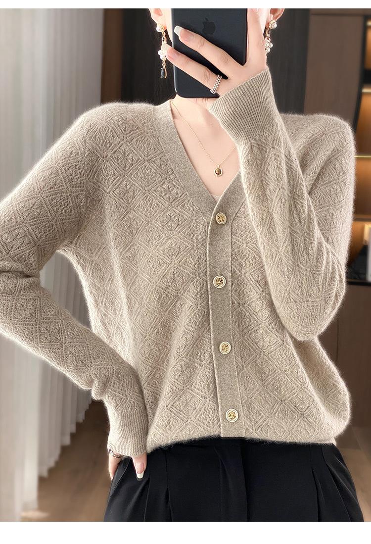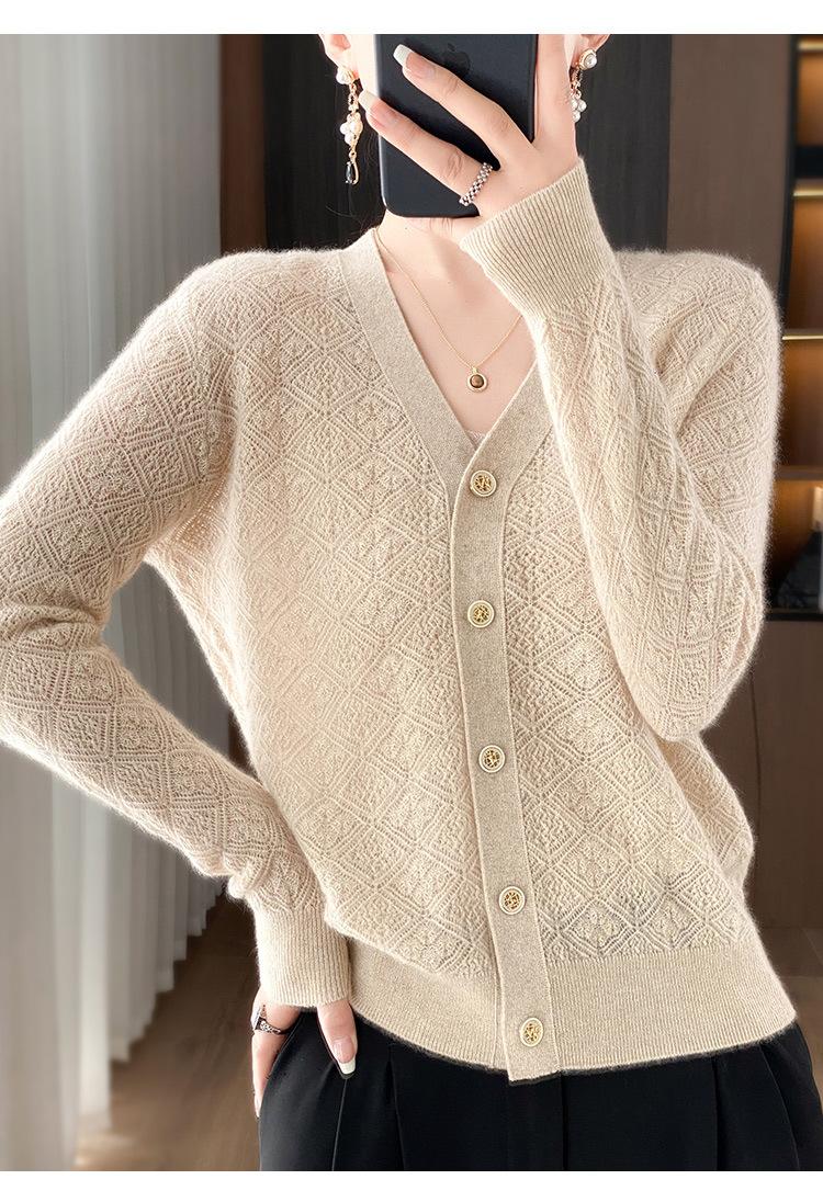 Cárdigan de lana calado con cuello en V para mujer, chaqueta informal holgada de punto de alta gama que combina con todo, primavera