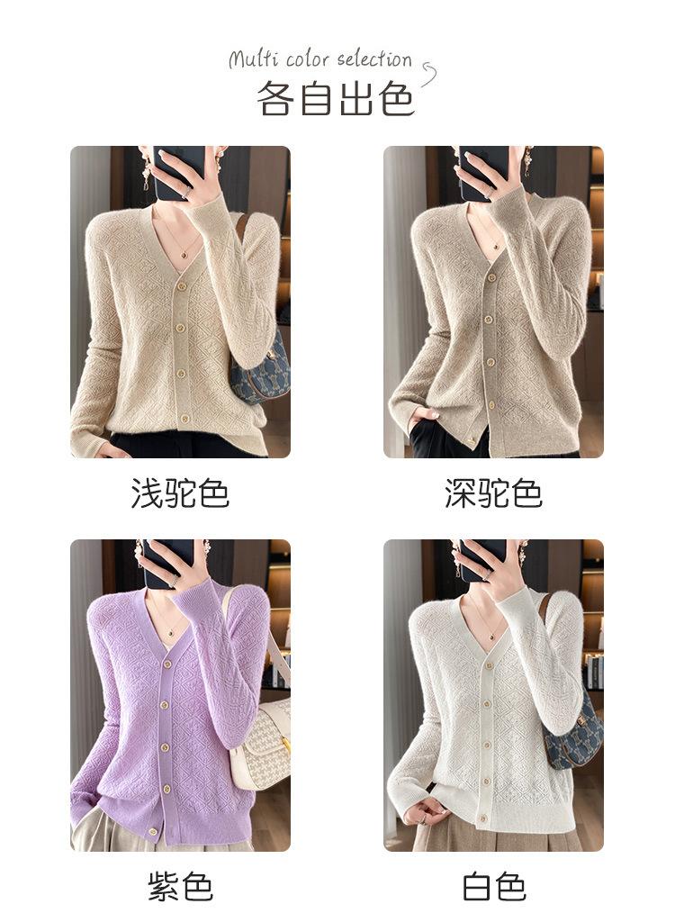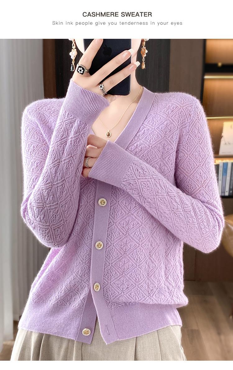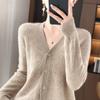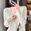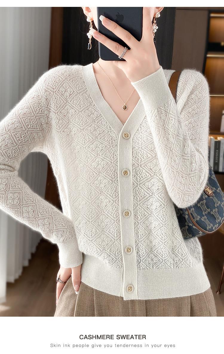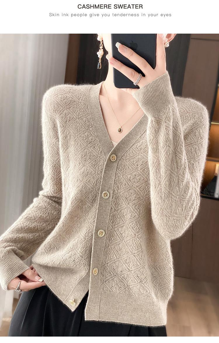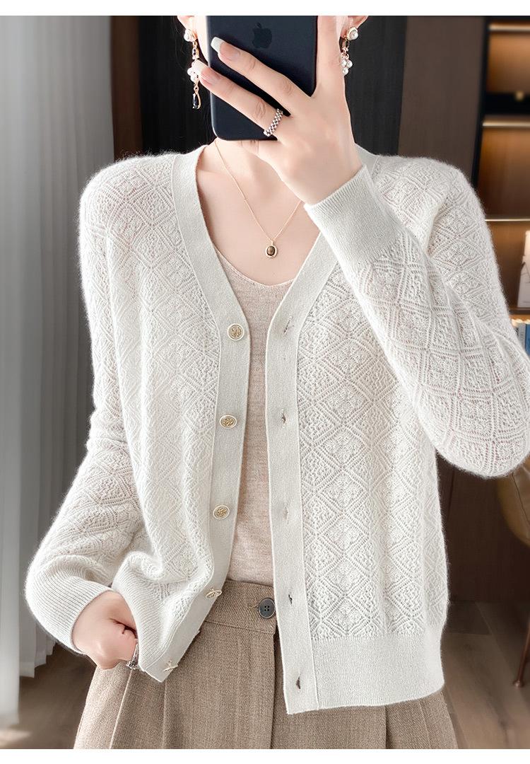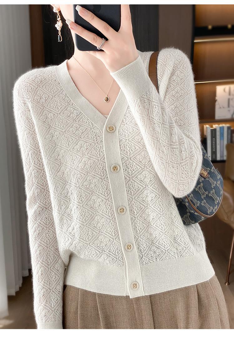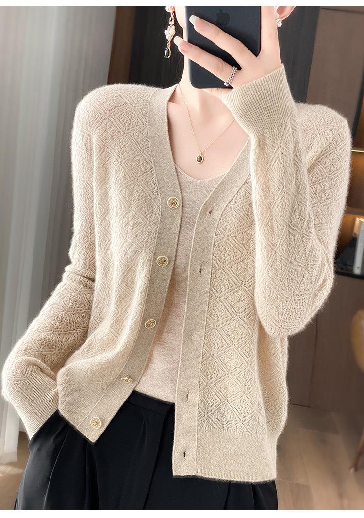 Cárdigan de lana calado con cuello en V para mujer, chaqueta informal holgada de punto de alta gama que combina con todo, primavera