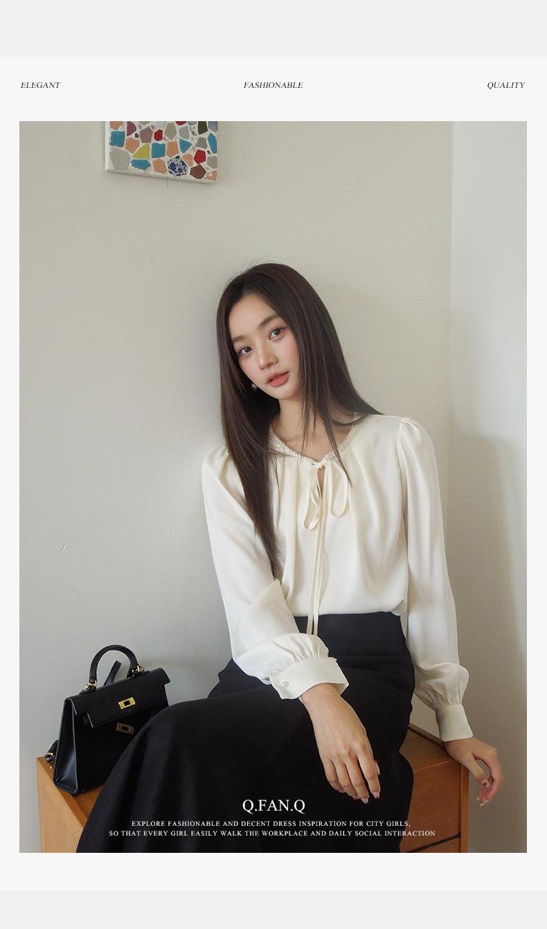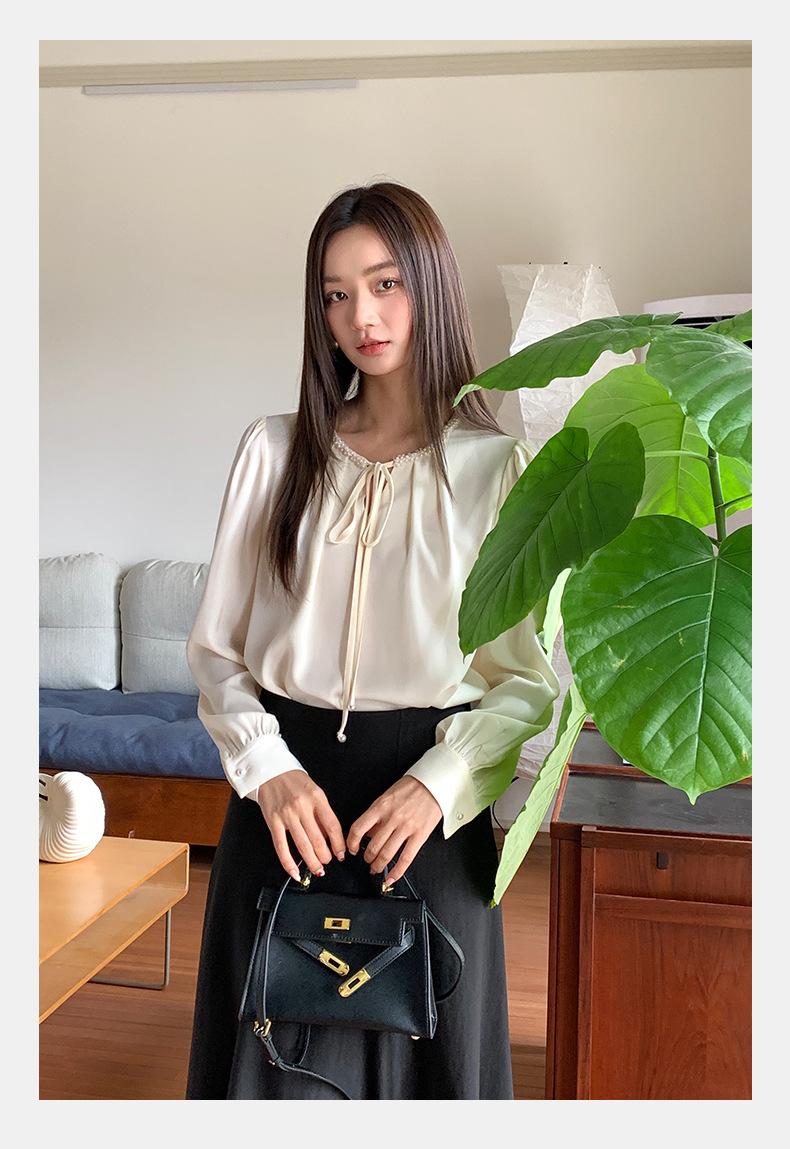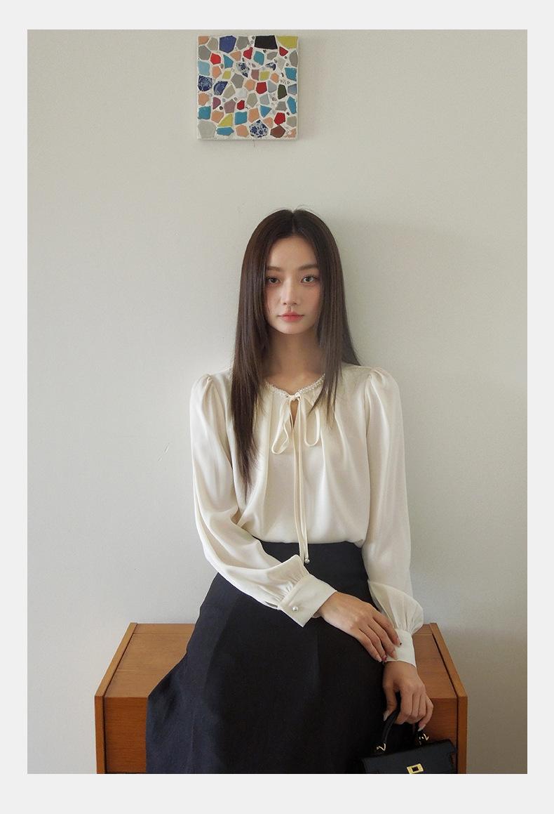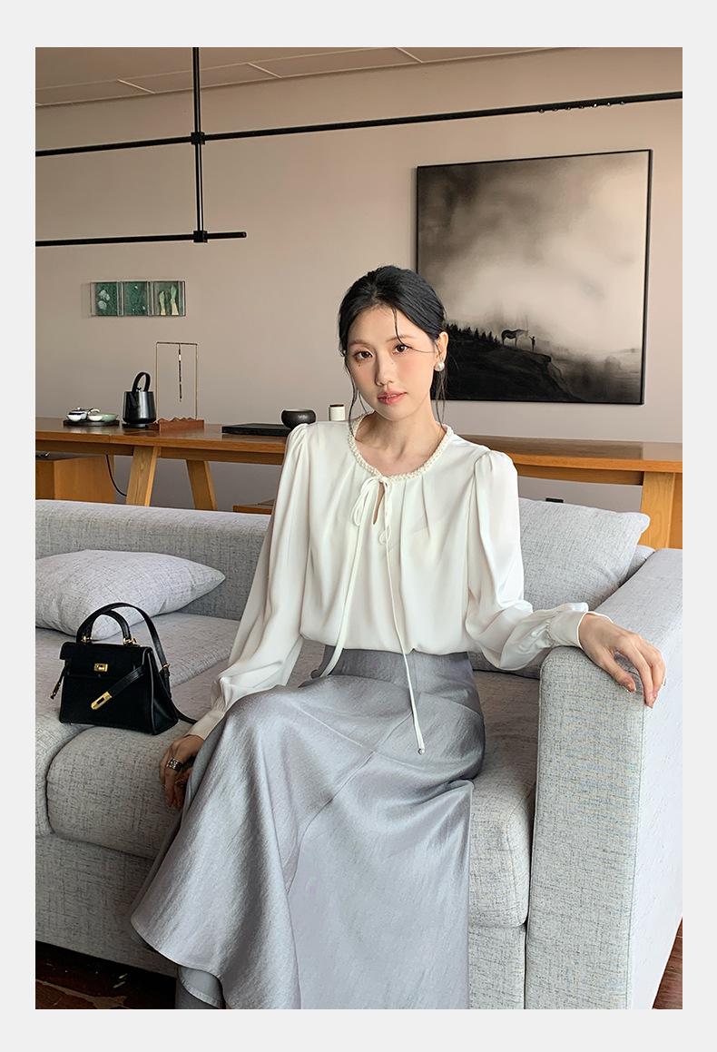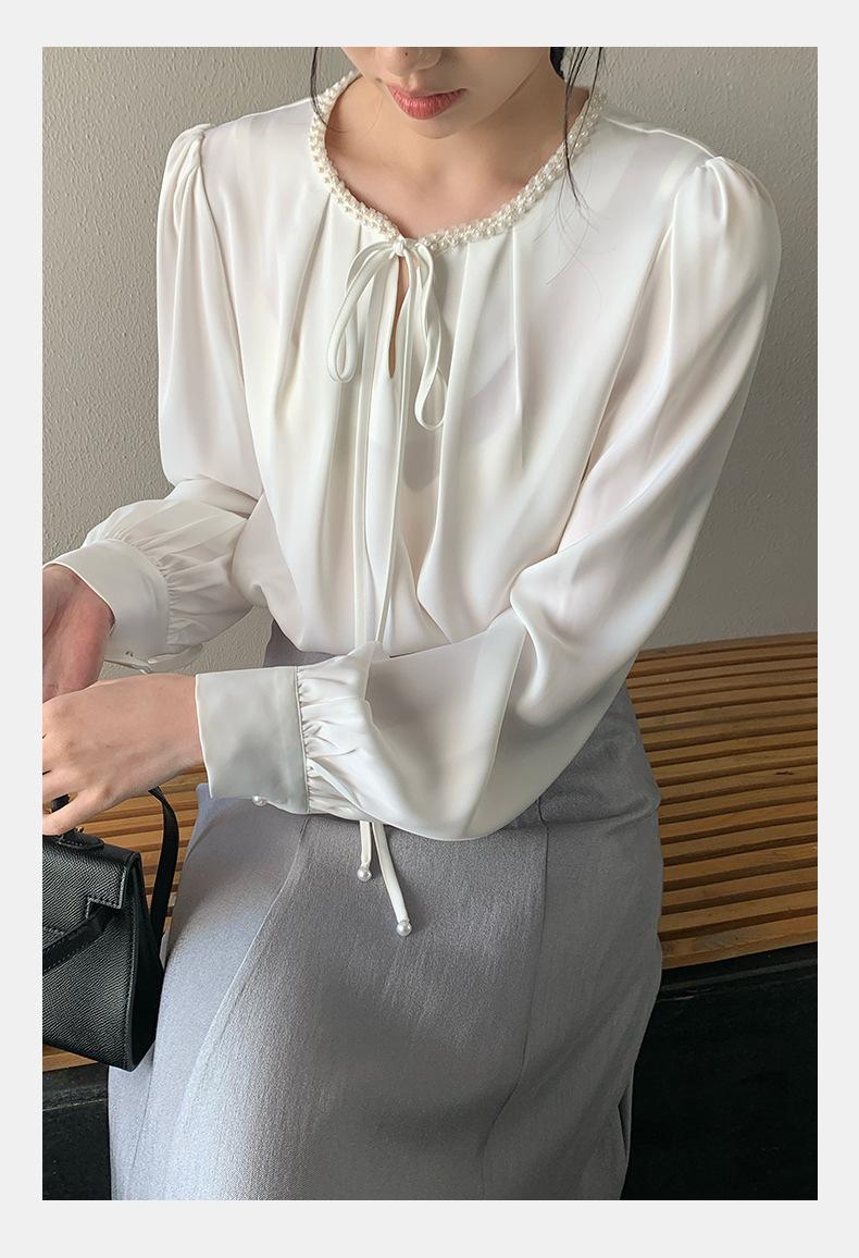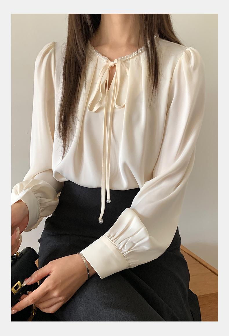 Camisa elegante de estilo francés con cuello redondo, cuentas y cordones para mujer, manga larga, diseño sencillo y combinable, 82973