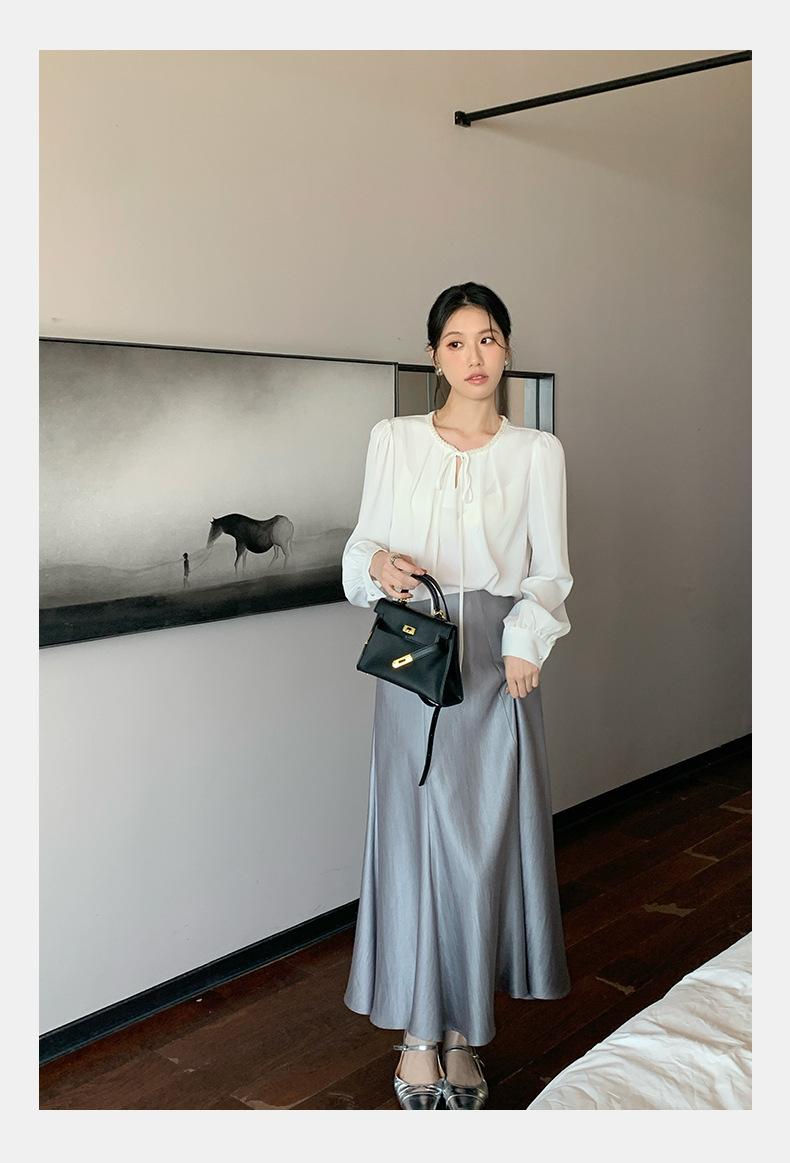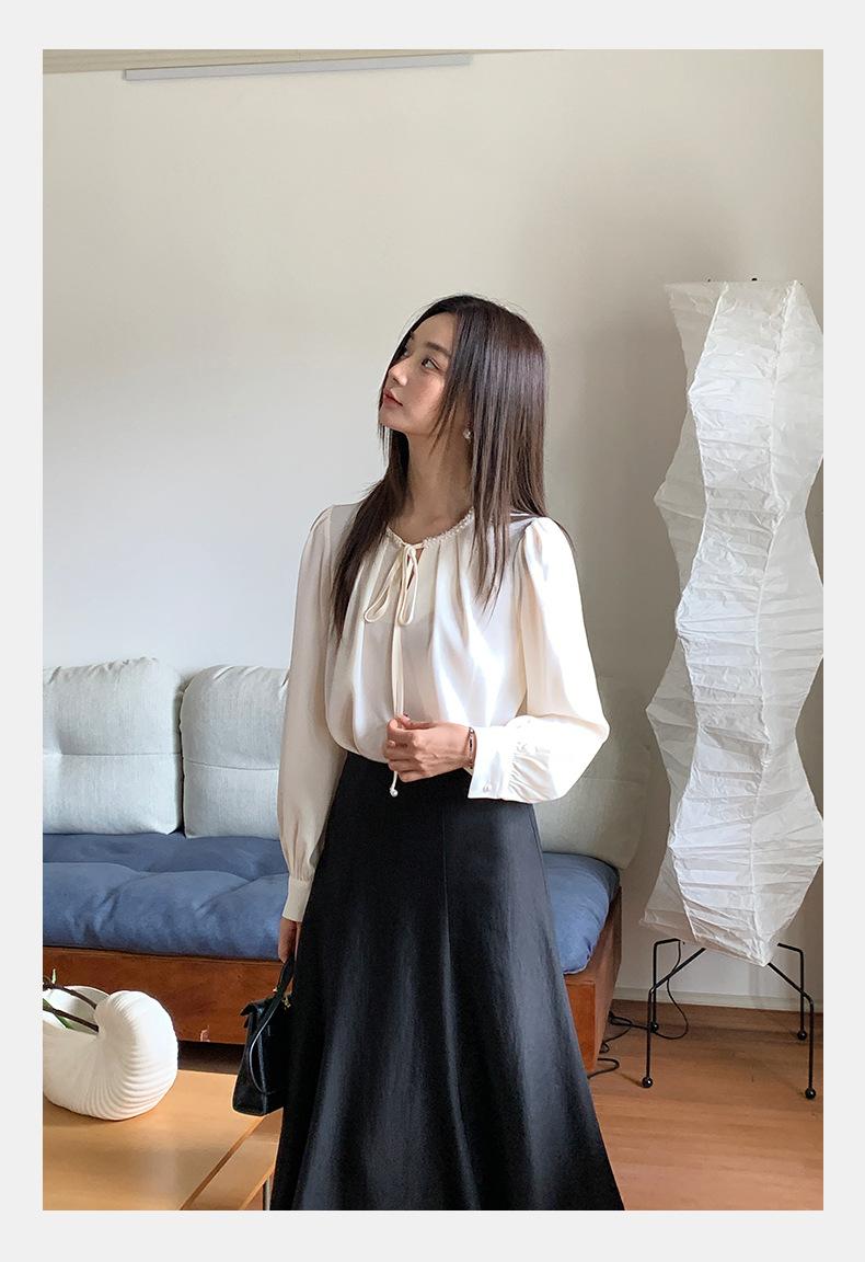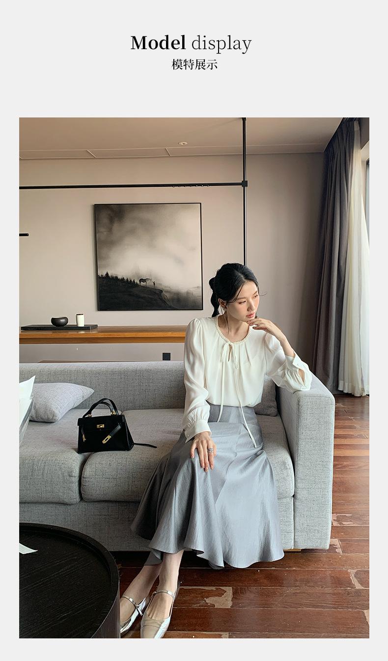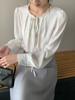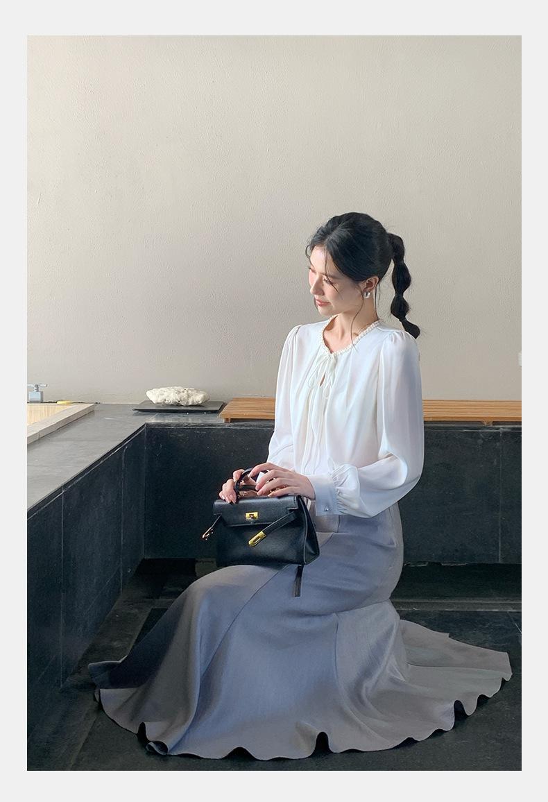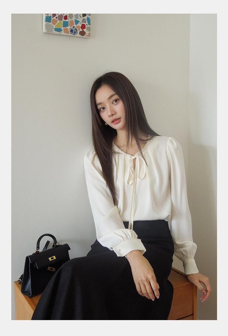 Camisa elegante de estilo francés con cuello redondo, cuentas y cordones para mujer, manga larga, diseño sencillo y combinable, 82973