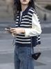 Chaleco de Lana Peinada para Mujer 100% Lana Pura Cuello Polo Rayado Estilo Occidental Camiseta Base de Cachemira Suéter Tejido Avispa