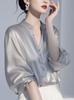 Camisa de cuello en V antiedad de lujo ligera de alta calidad de estilo coreano para mujer, nueva llegada de primavera 2025, estilo occidental, hermosa blusa gris de nicho