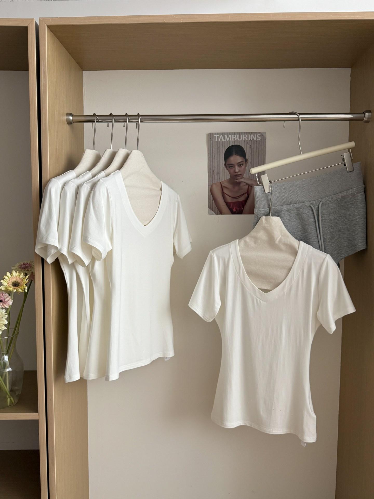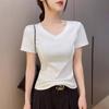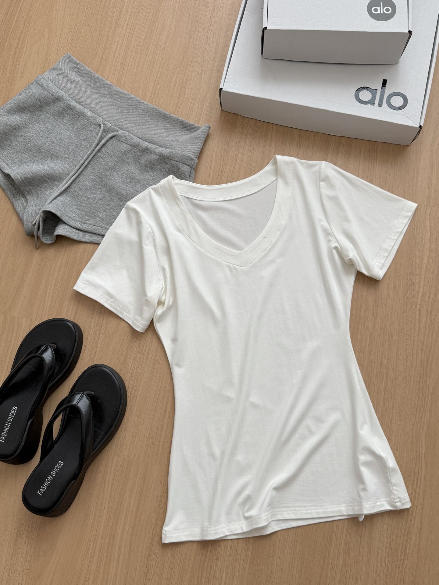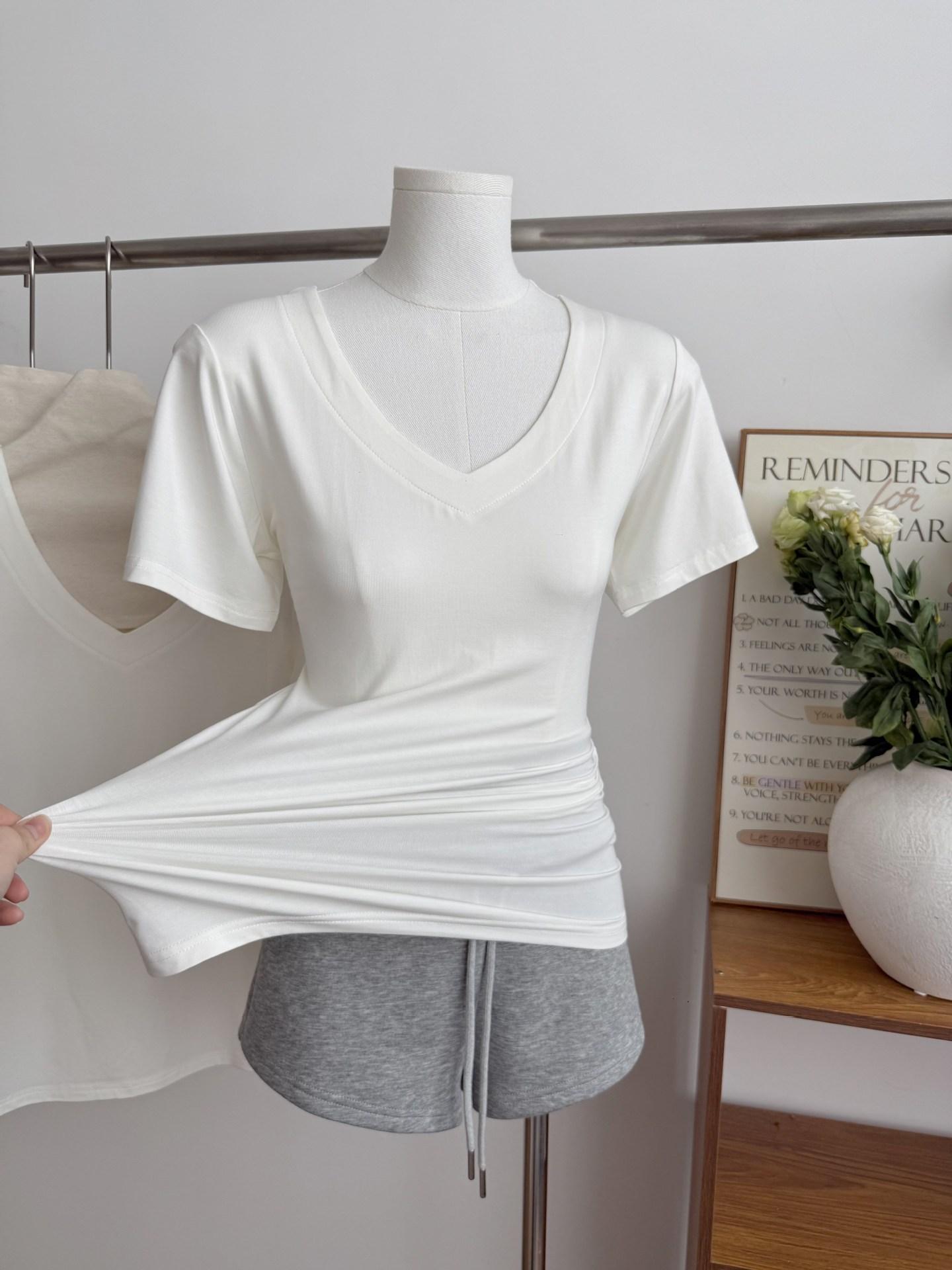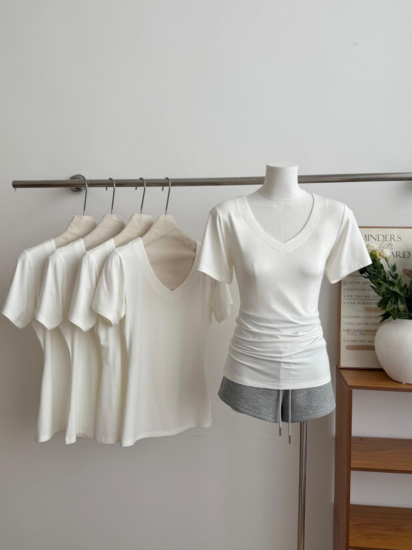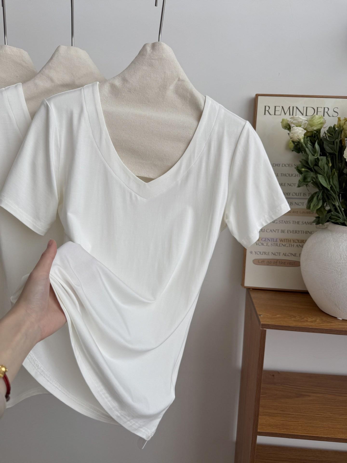 Camiseta básica de verano para mujer, de manga corta, versátil, con escote en V puro y cintura ajustada que adelgaza los hombros delanteros.