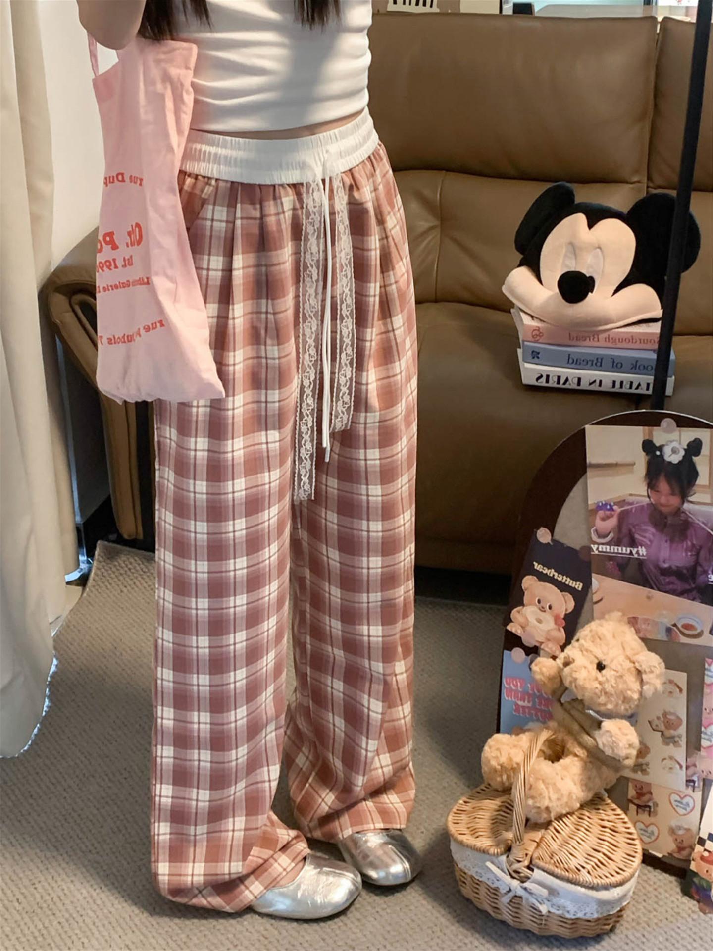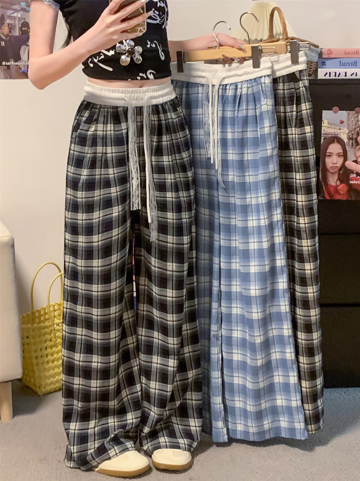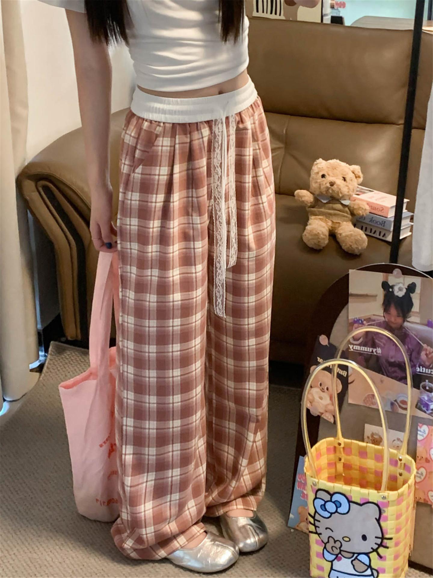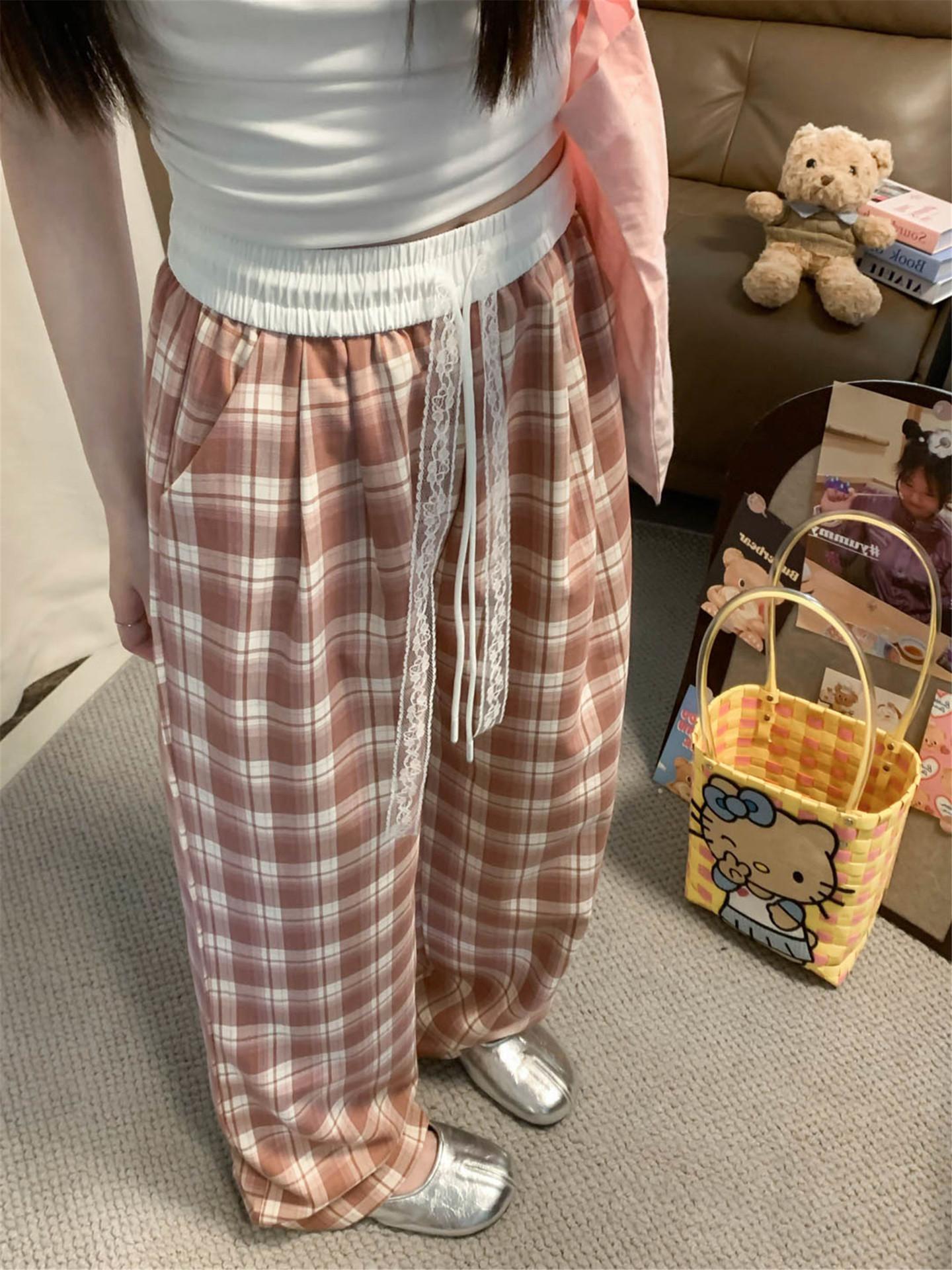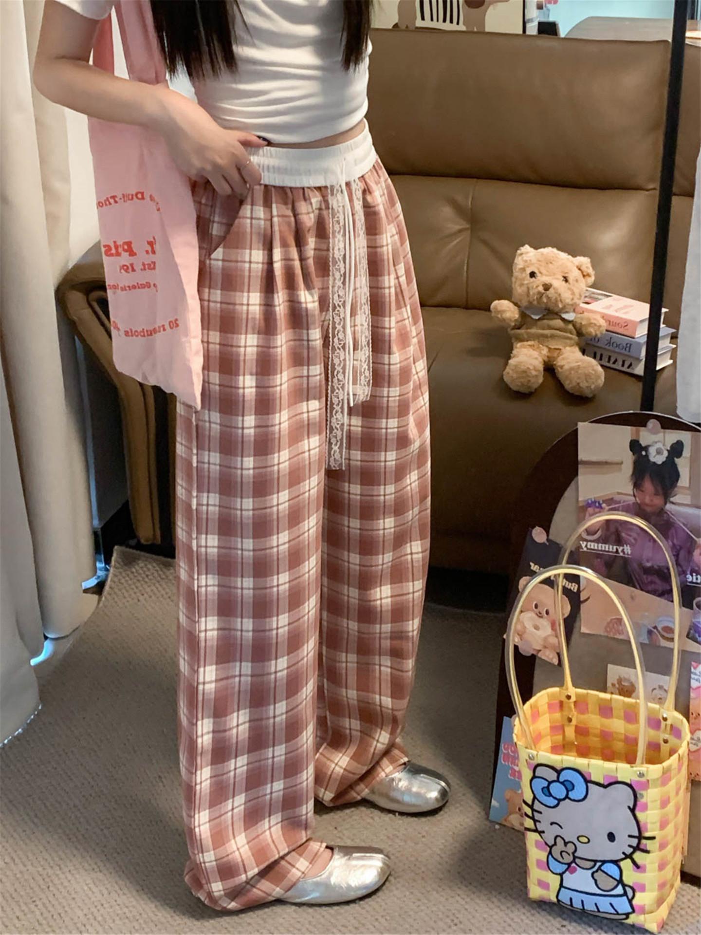 Pantalones Casuales Patchwork Estilo Holgazán para Mujer 2025 Primavera Nuevo Cintura Alta Sueltos Cordón Encaje Pierna Ancha Pantalones Largos