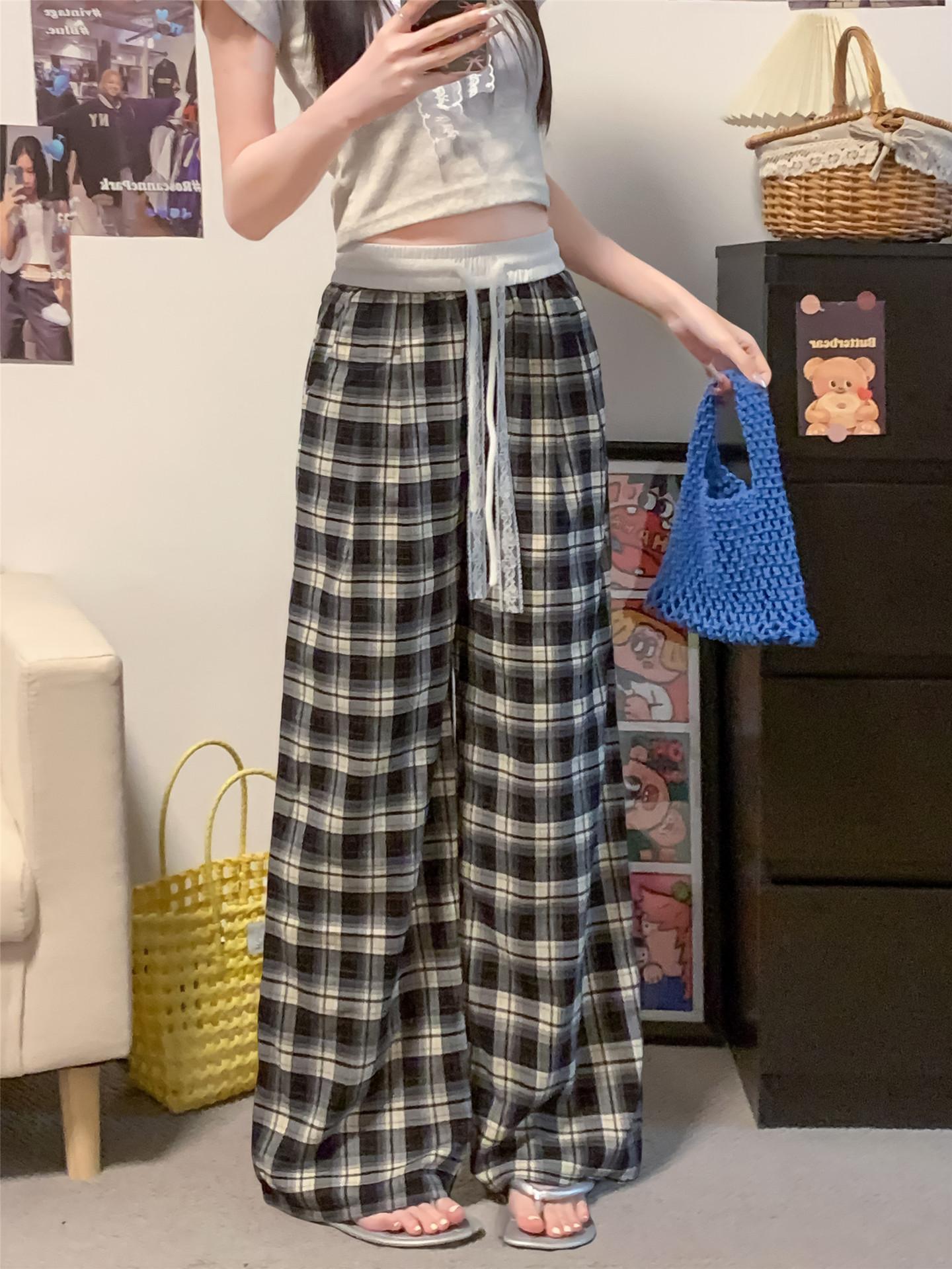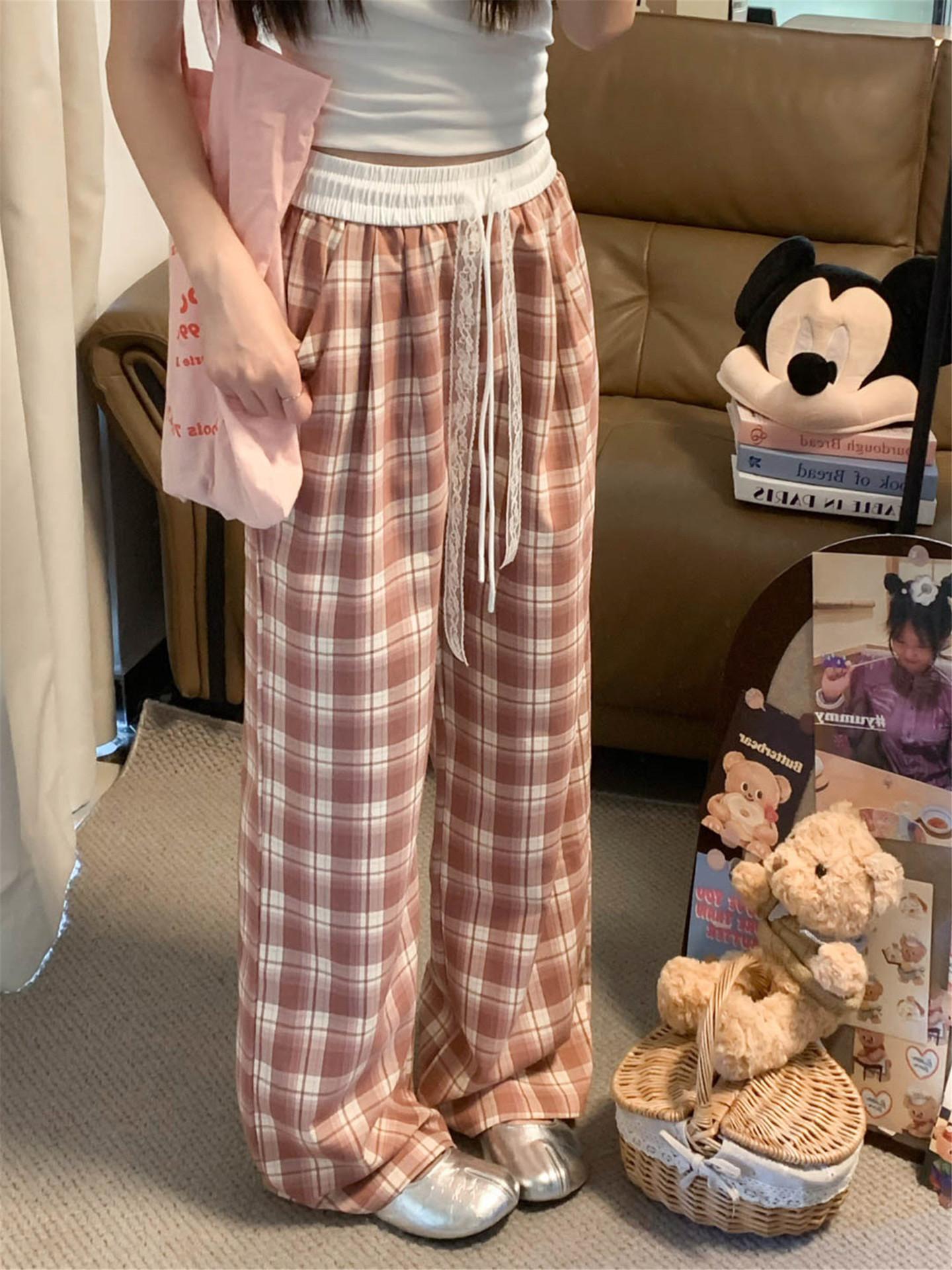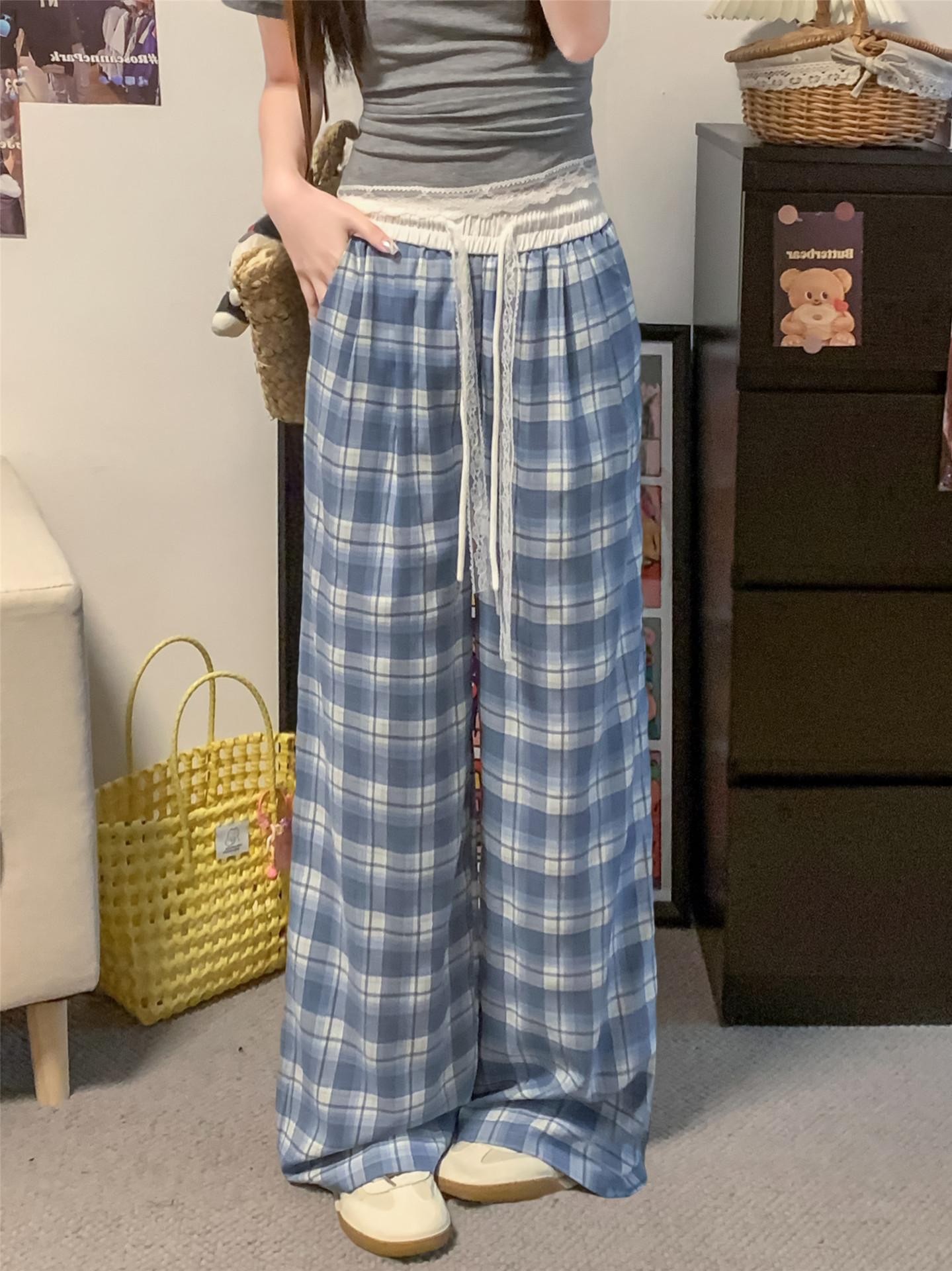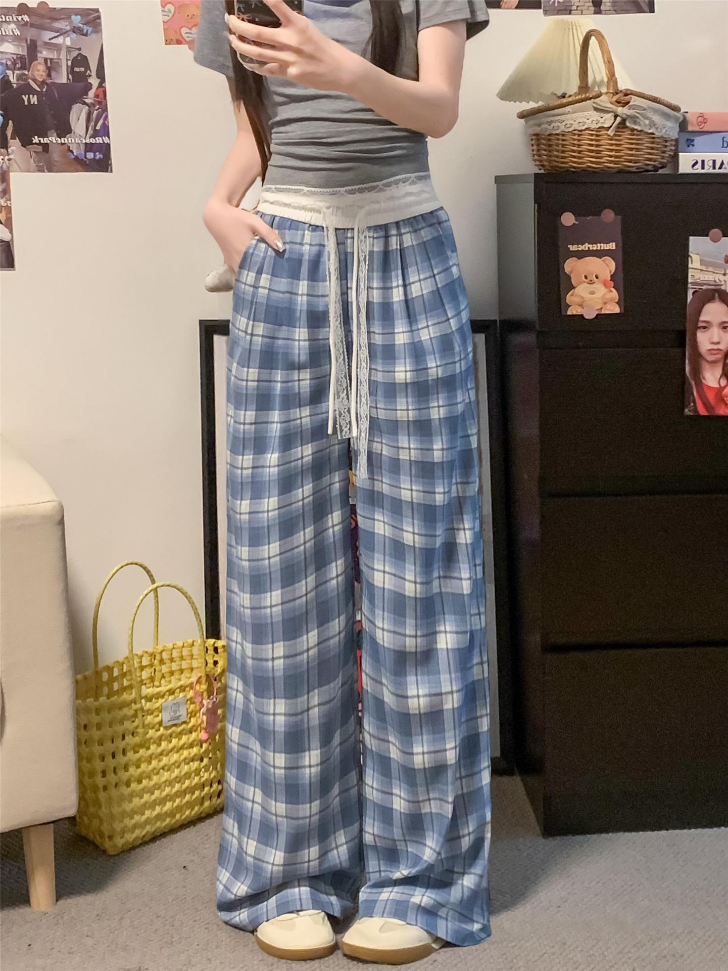 Pantalones Casuales Patchwork Estilo Holgazán para Mujer 2025 Primavera Nuevo Cintura Alta Sueltos Cordón Encaje Pierna Ancha Pantalones Largos