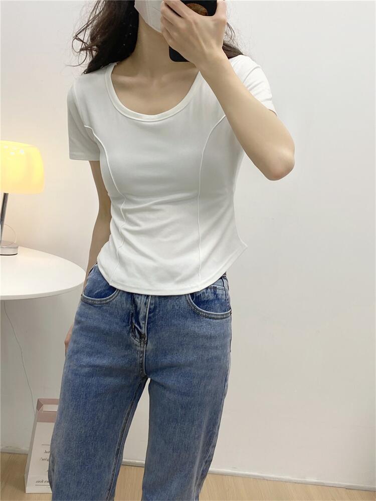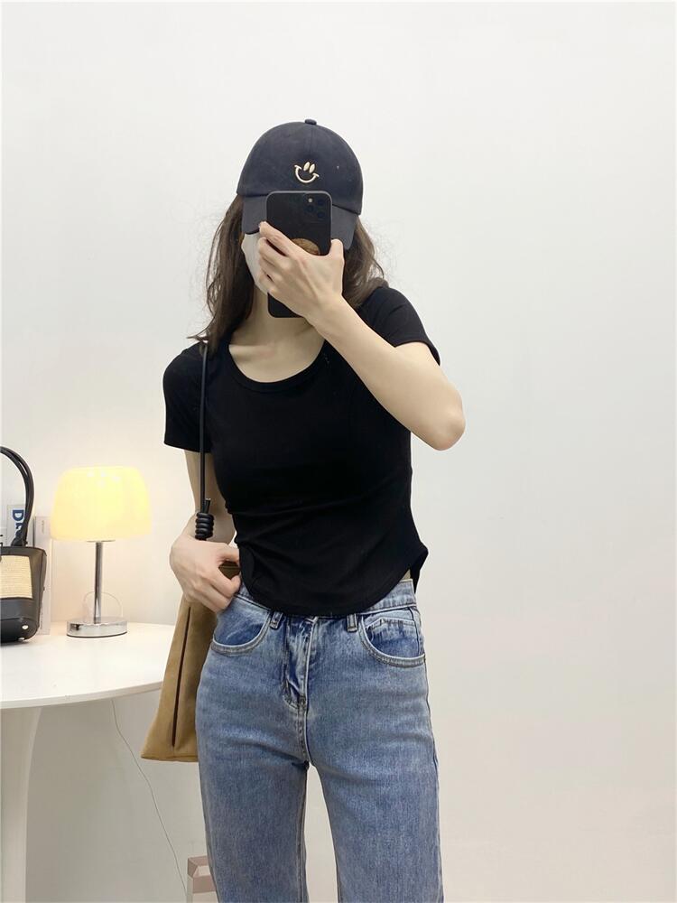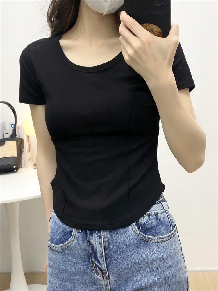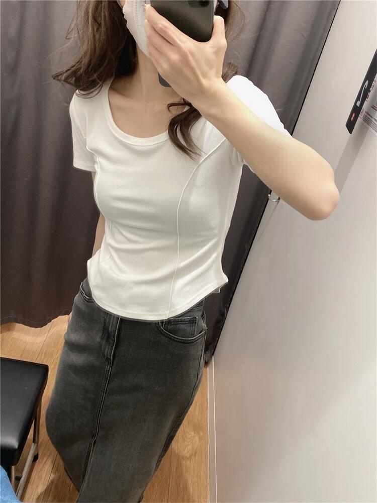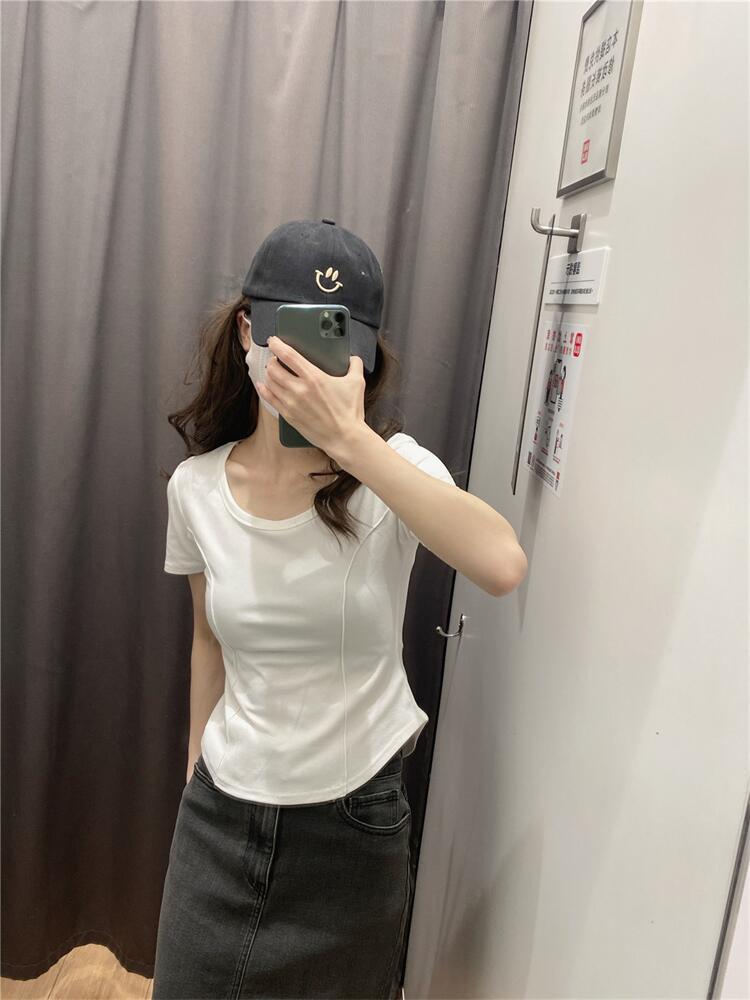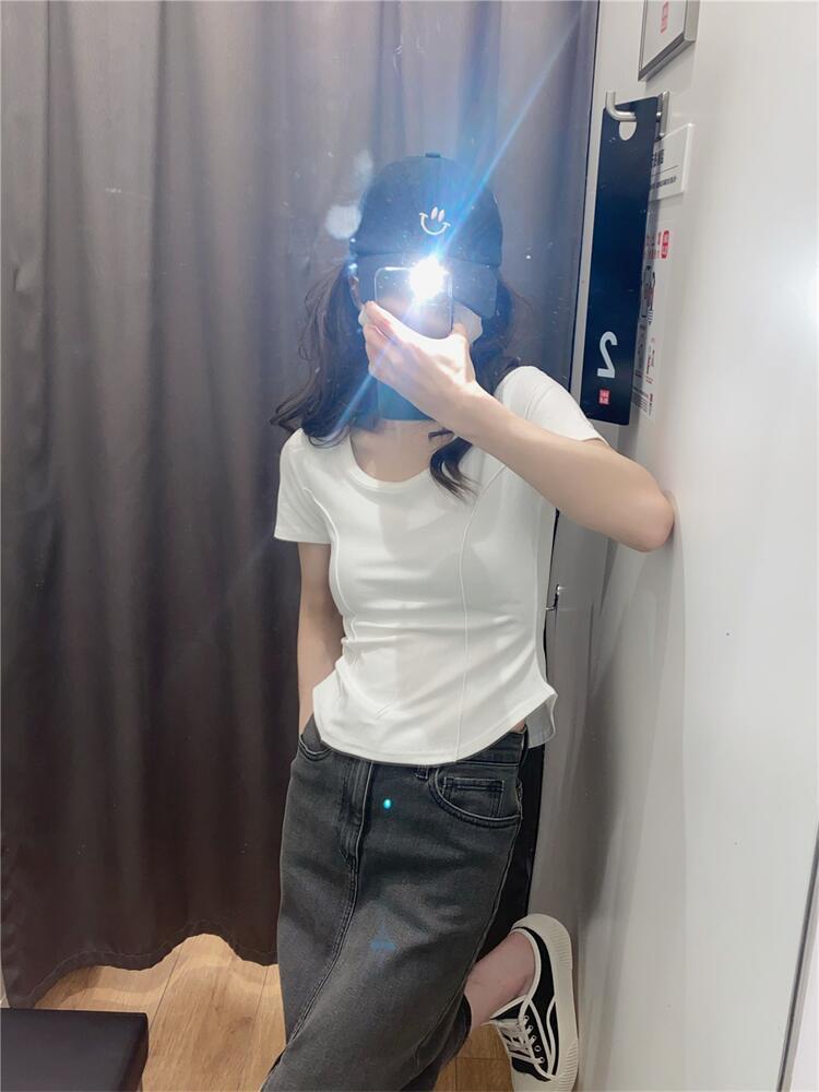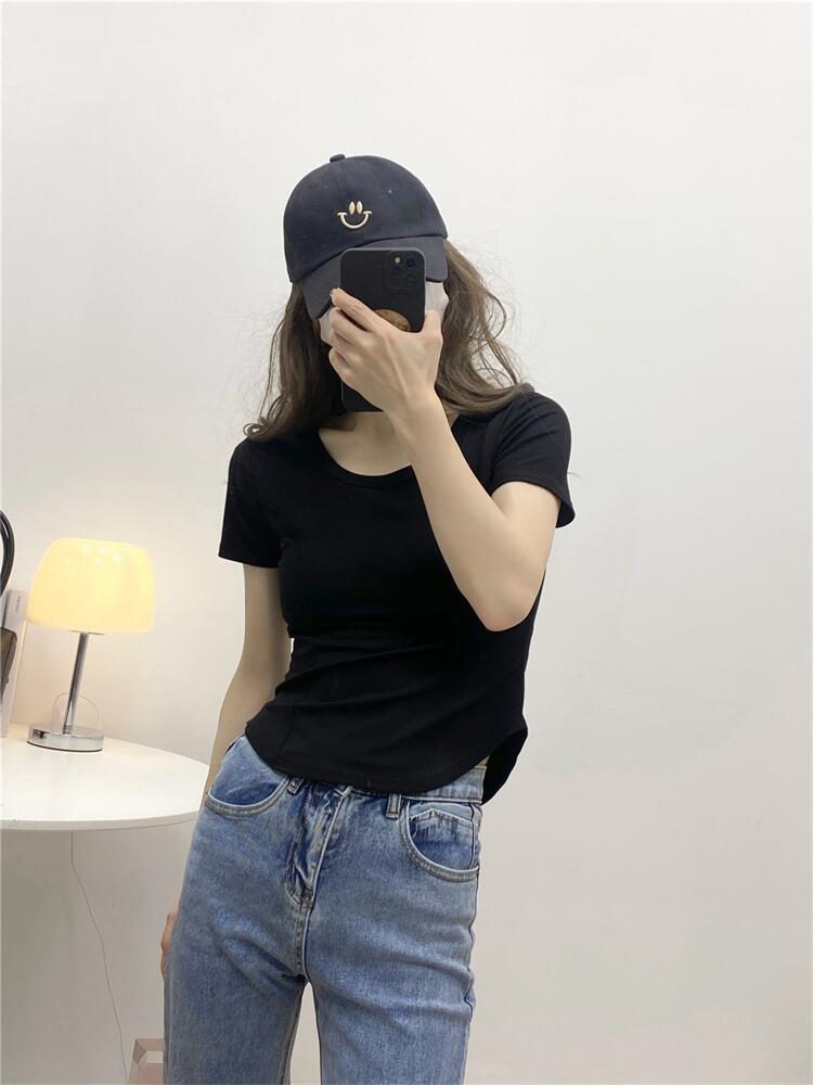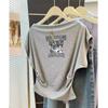 Camiseta de Manga Corta con Hombro Derecho Descubierto para Mujer Verano 2025 Nuevo Algodón Puro Ajustada Camisa Europea Diseño Nicho Top