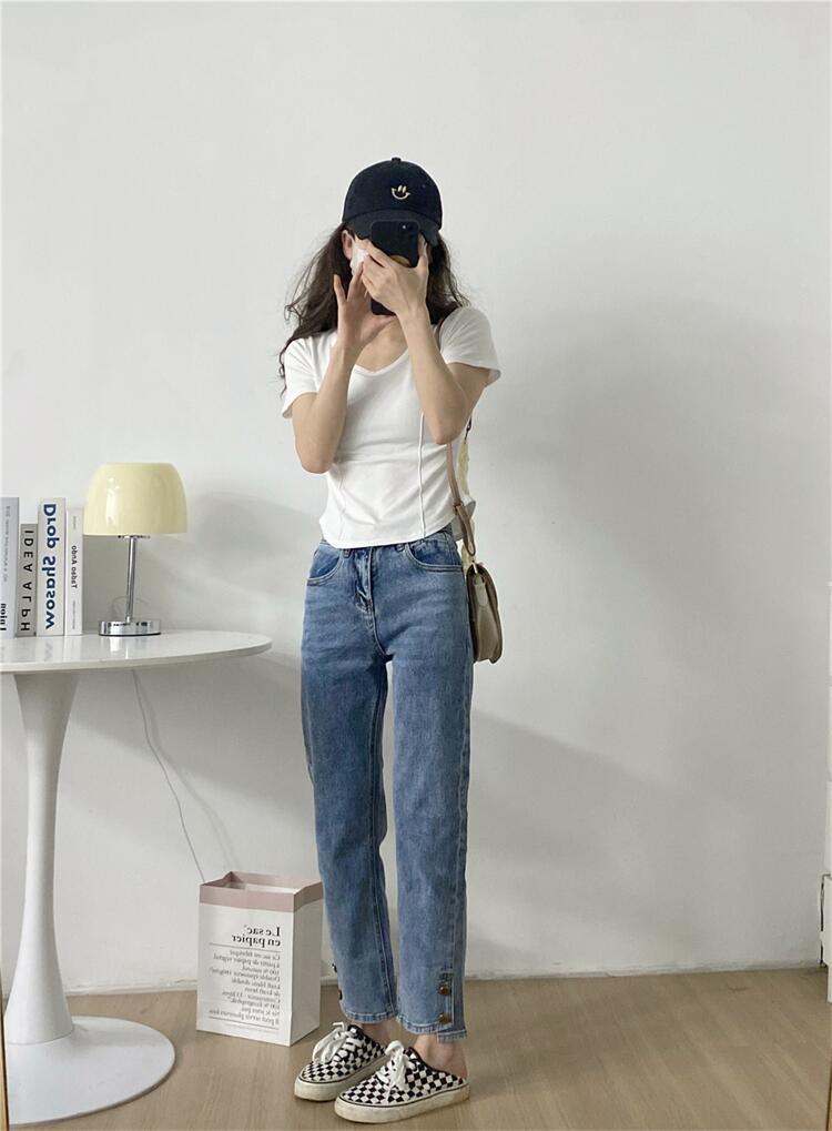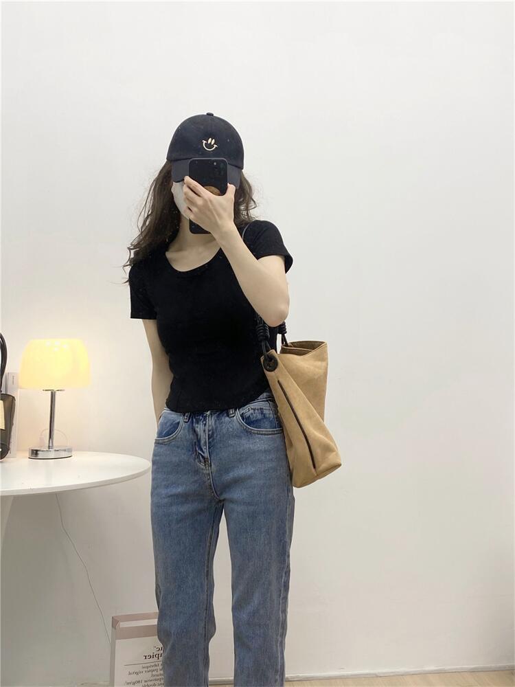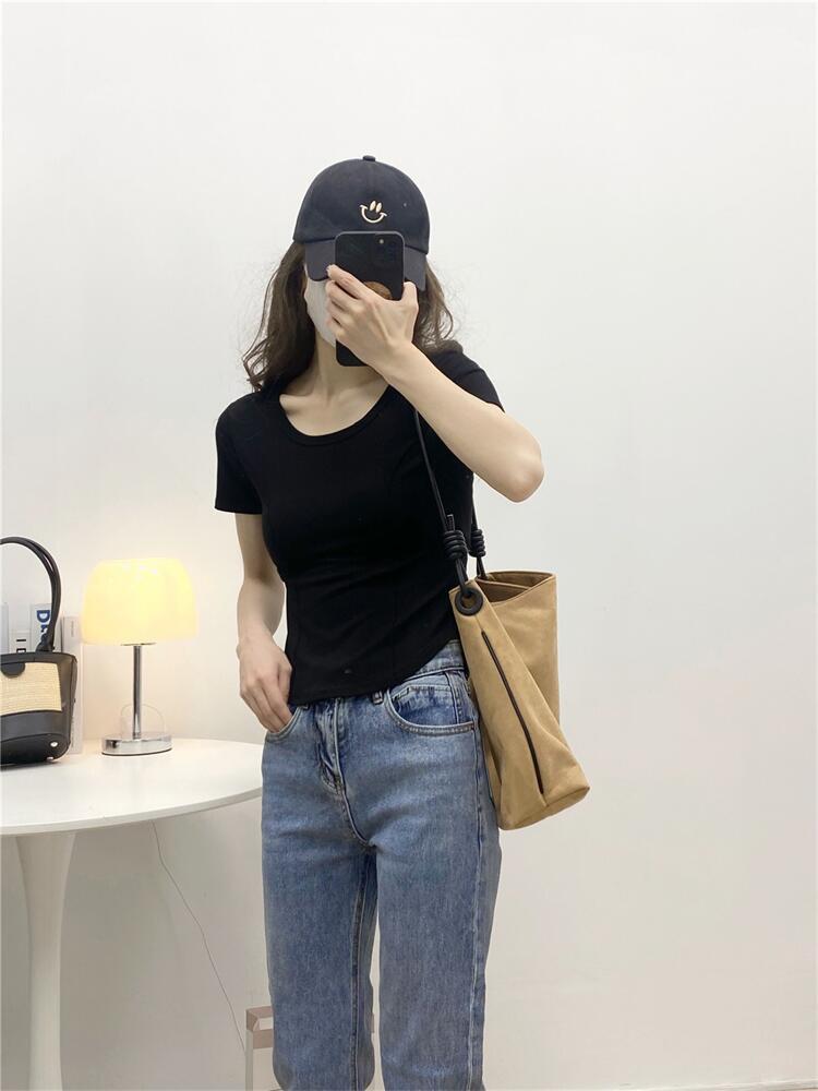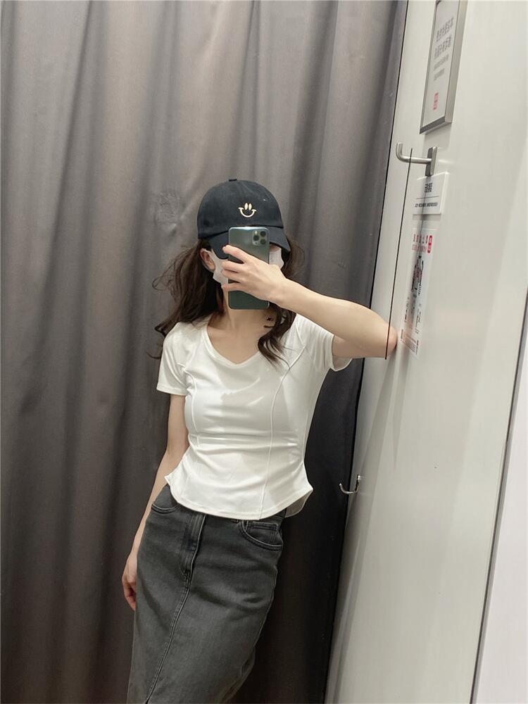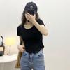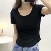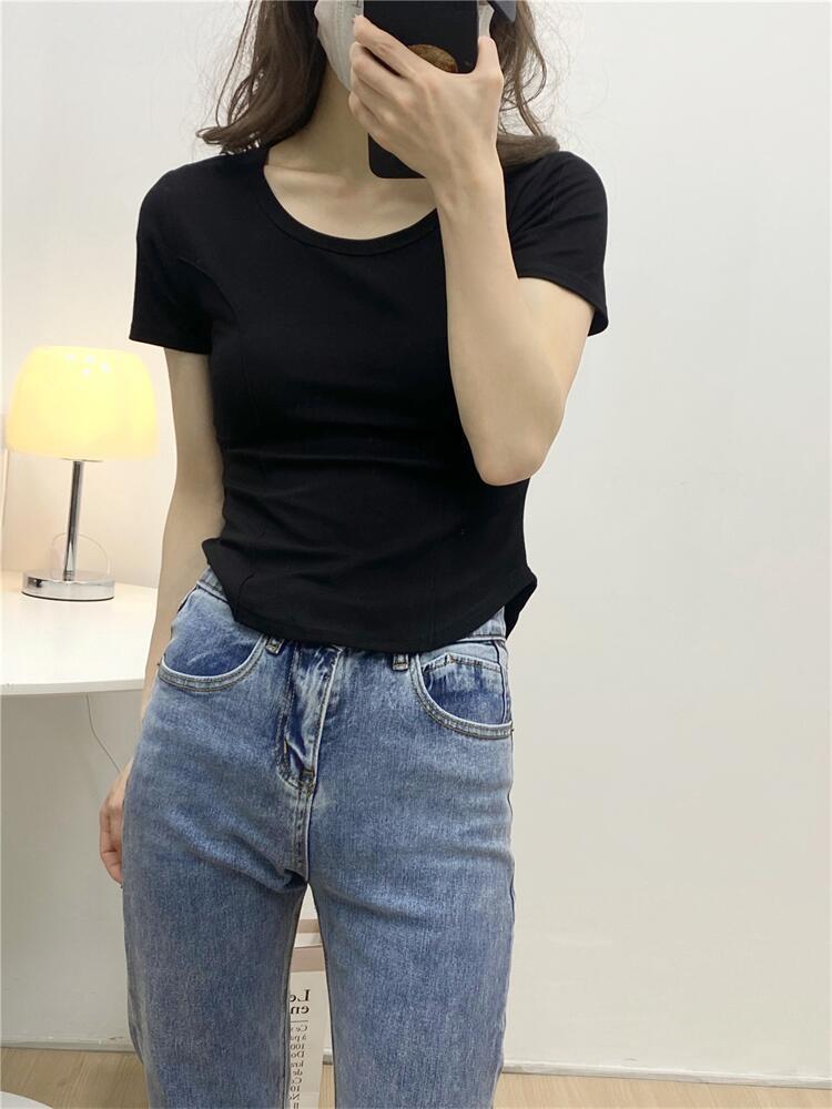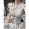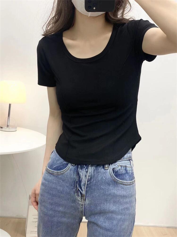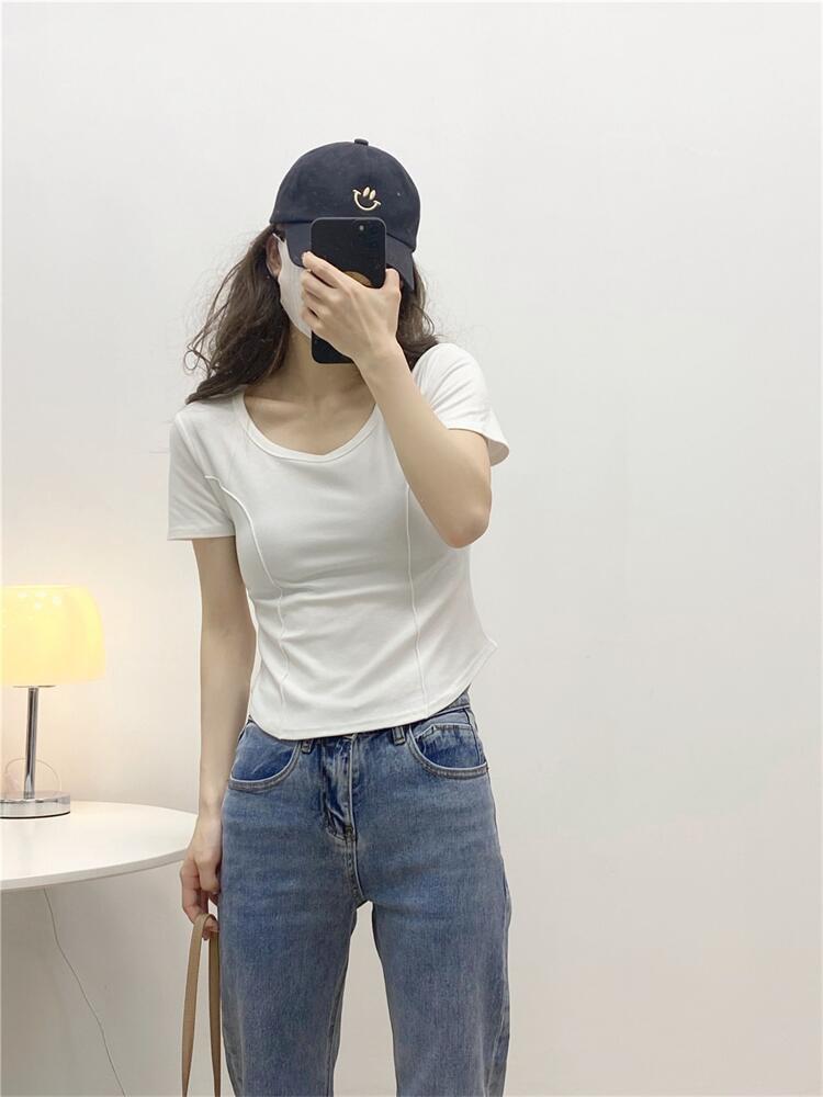 Camiseta de Manga Corta con Hombro Derecho Descubierto para Mujer Verano 2025 Nuevo Algodón Puro Ajustada Camisa Europea Diseño Nicho Top