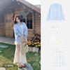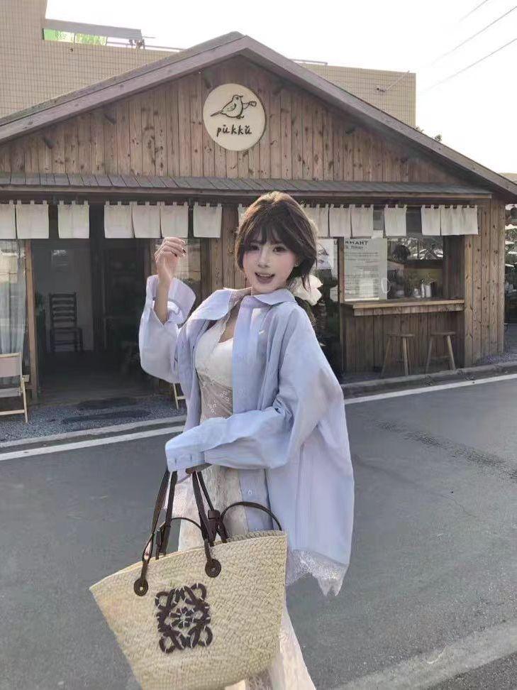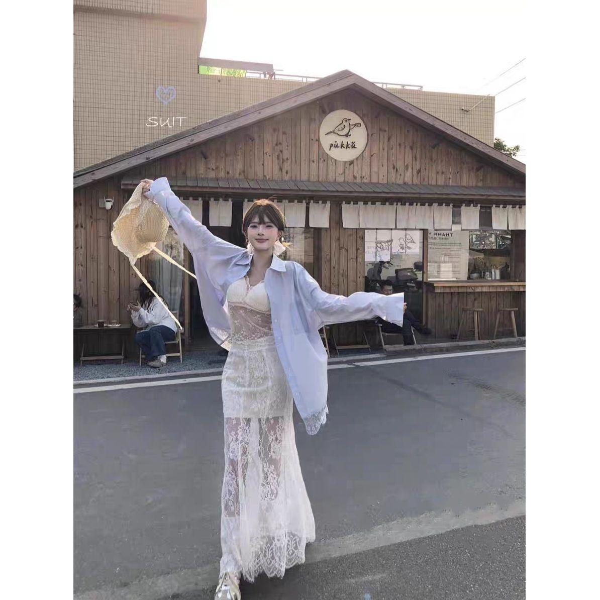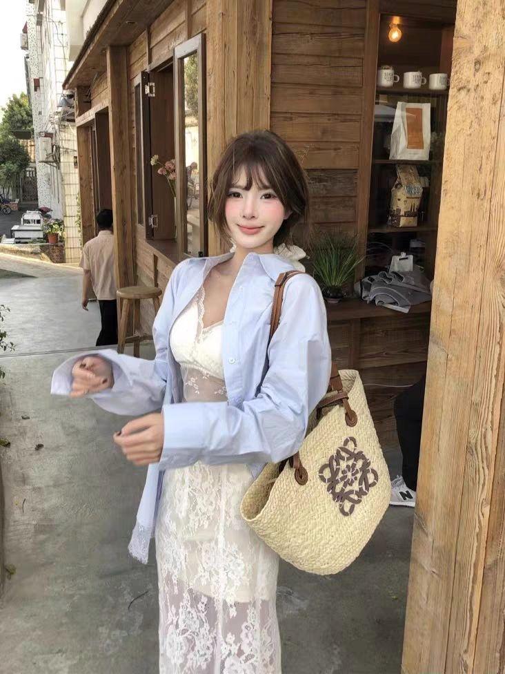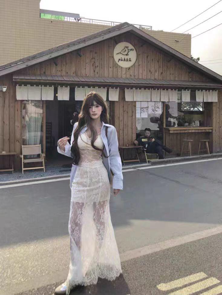 Blue shirt + lace skirt