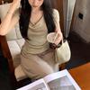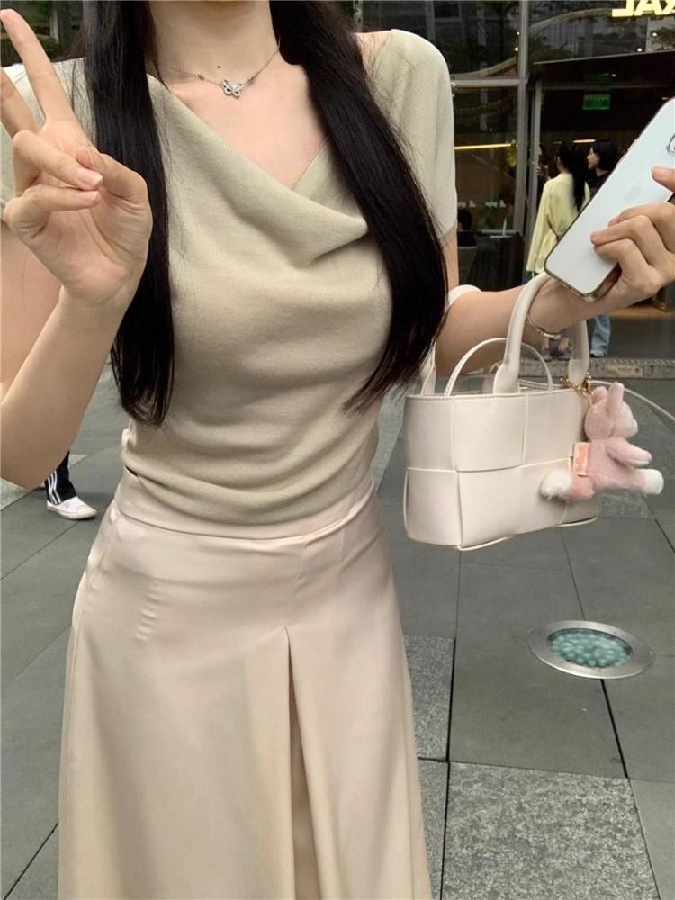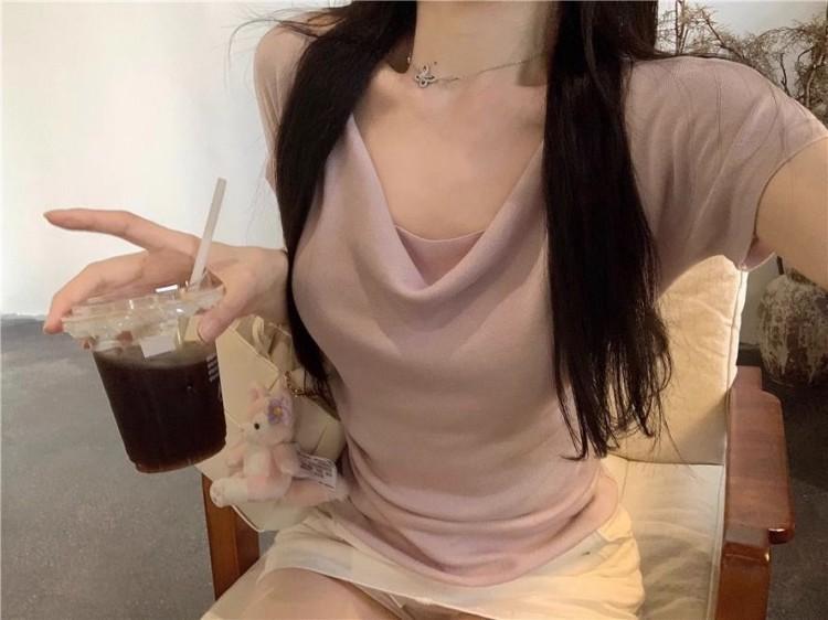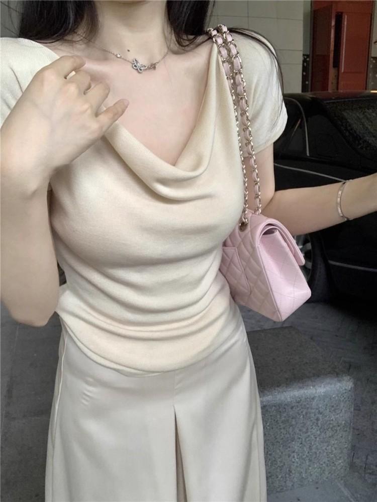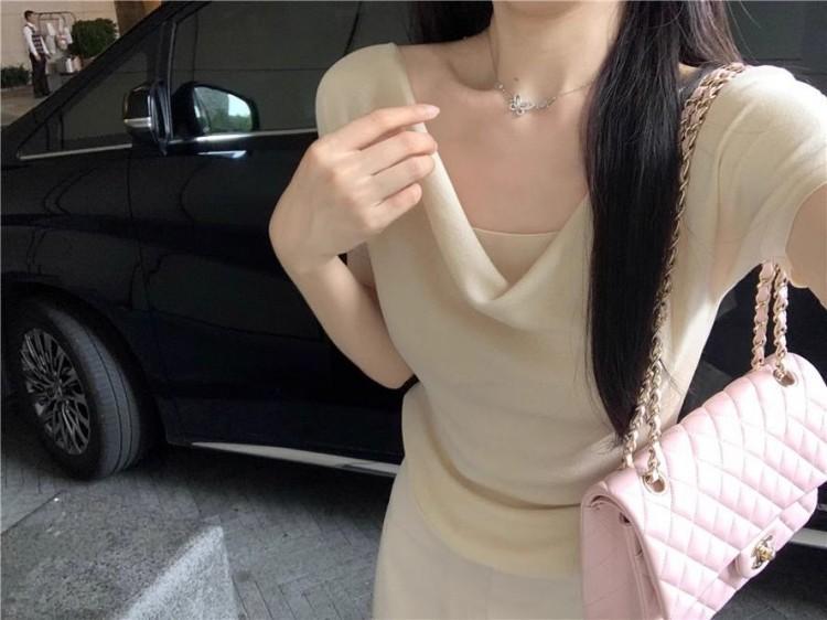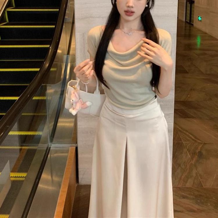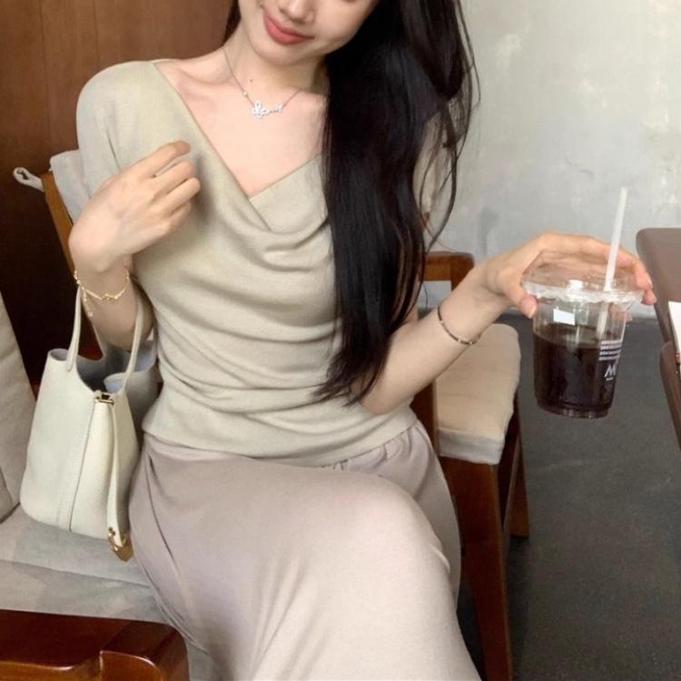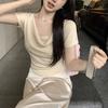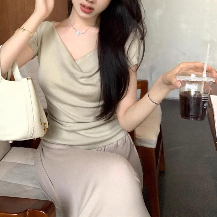 Camiseta de manga corta con cuello halter y hombros descubiertos de alta gama para mujer, top corto adelgazante con cintura de nicho de temperamento de verano 2025 para chica sexy