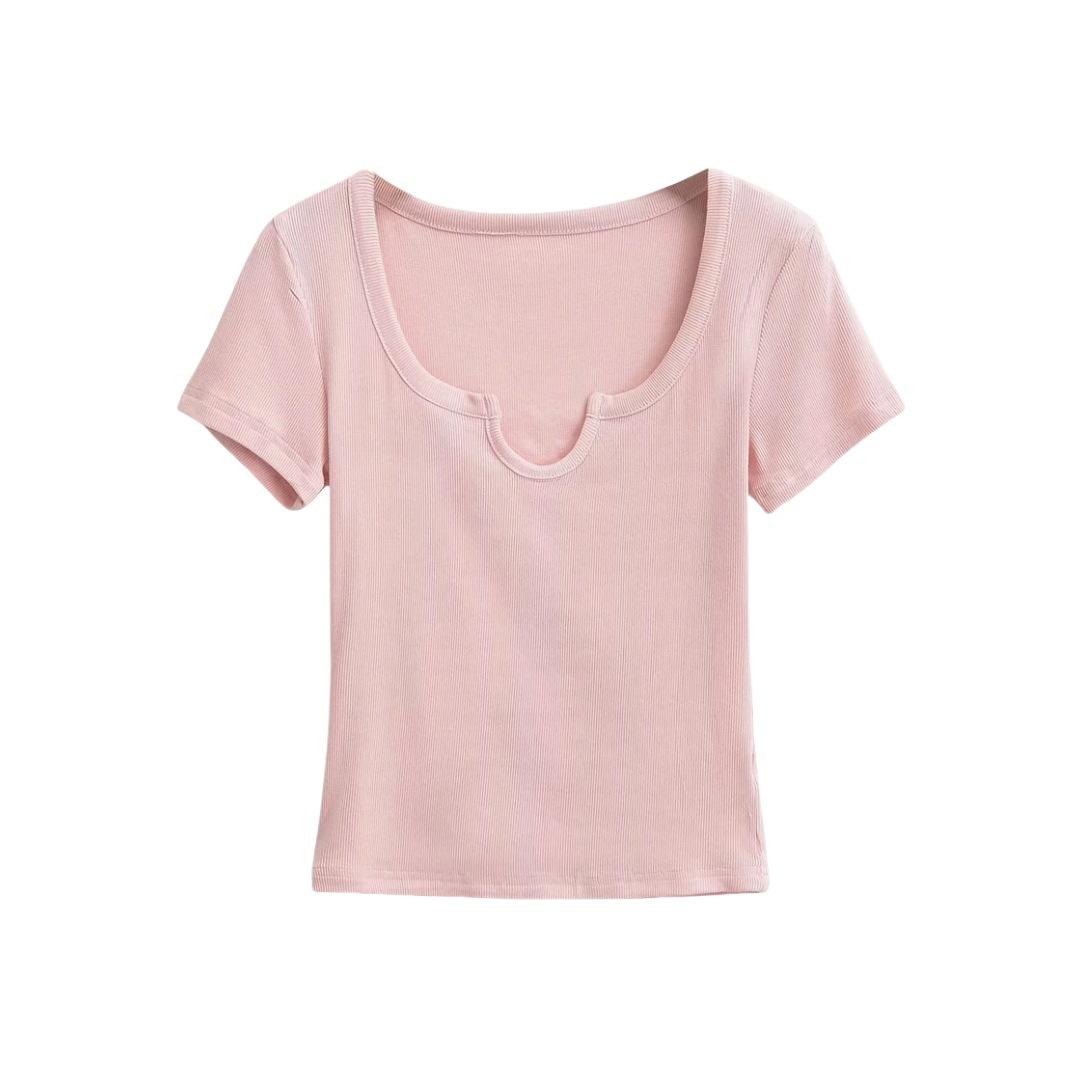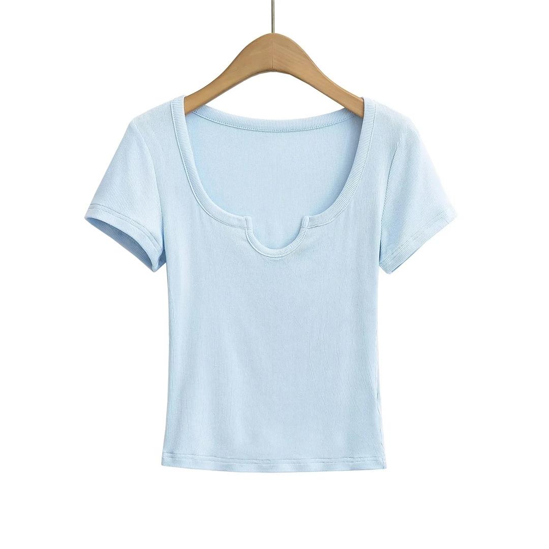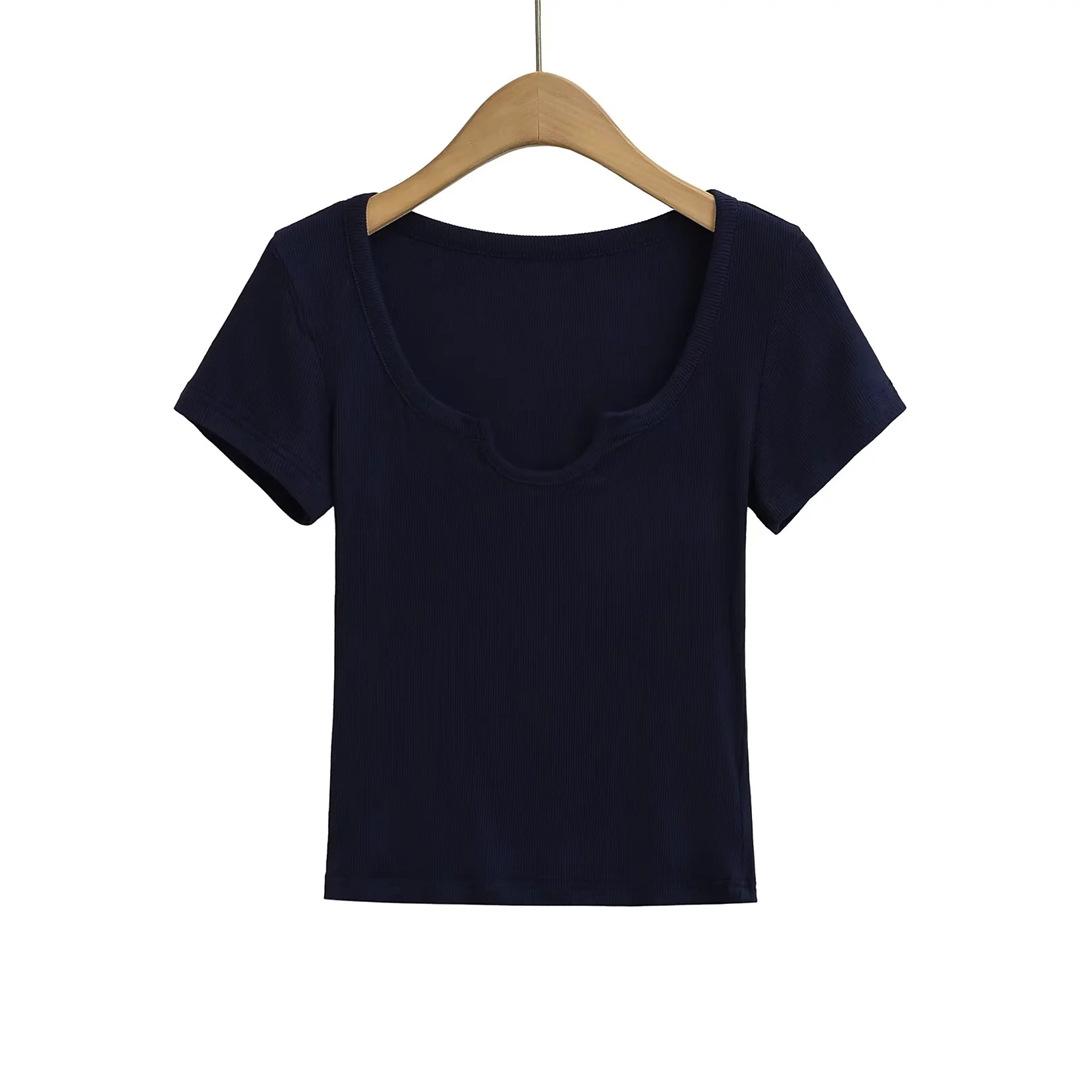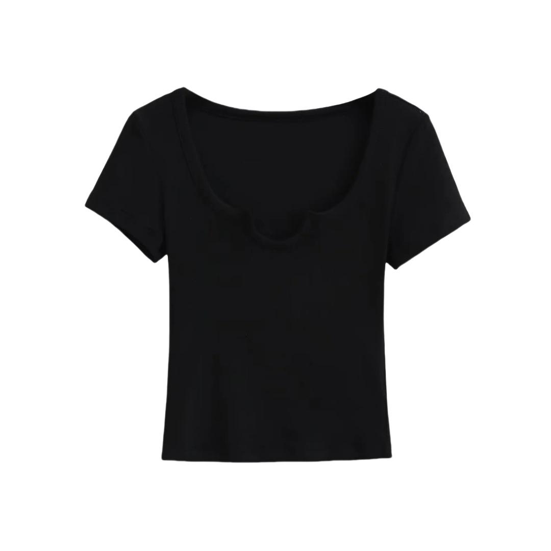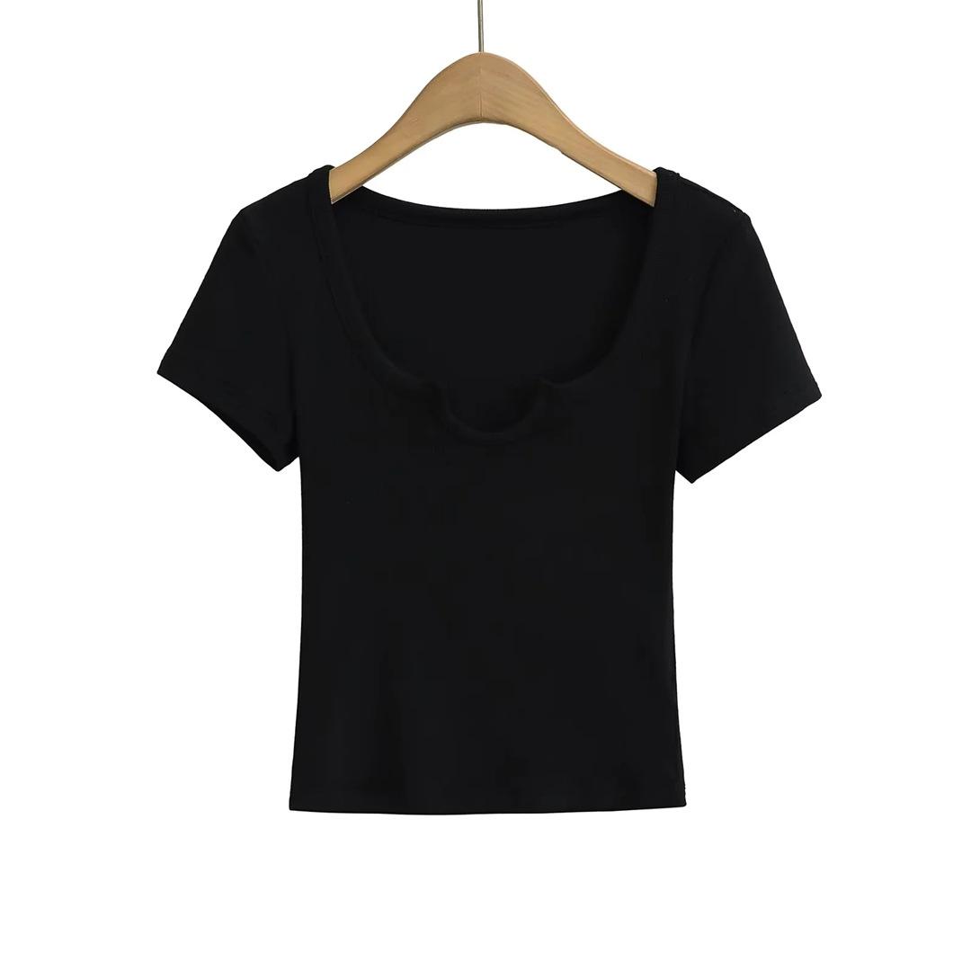 Camiseta Americana Estilo Chica Caliente con Hilo Grande de Cuello U Profundo de Manga Corta para Mujer Deseo Puro Sexy Corte Bajo Ajustada Cintura Alta Corta