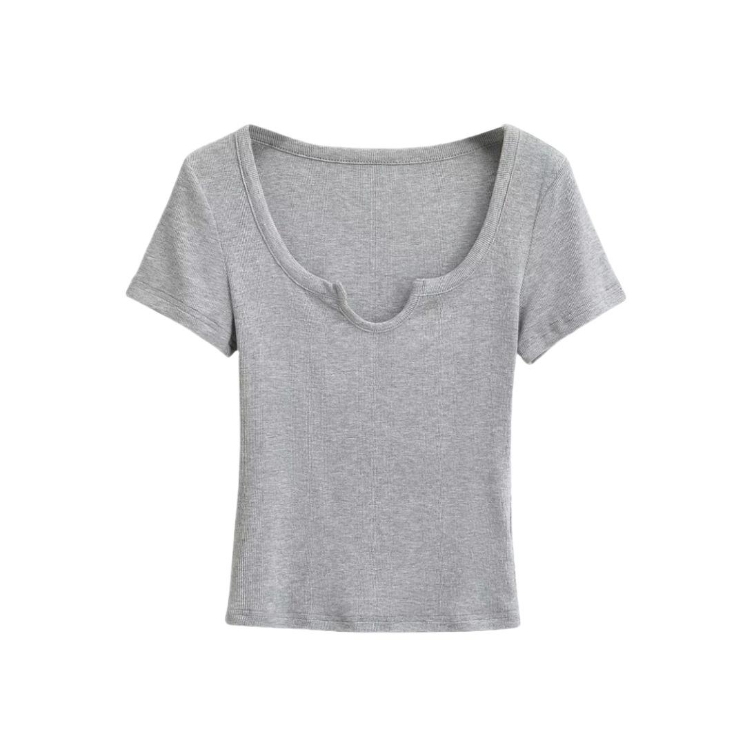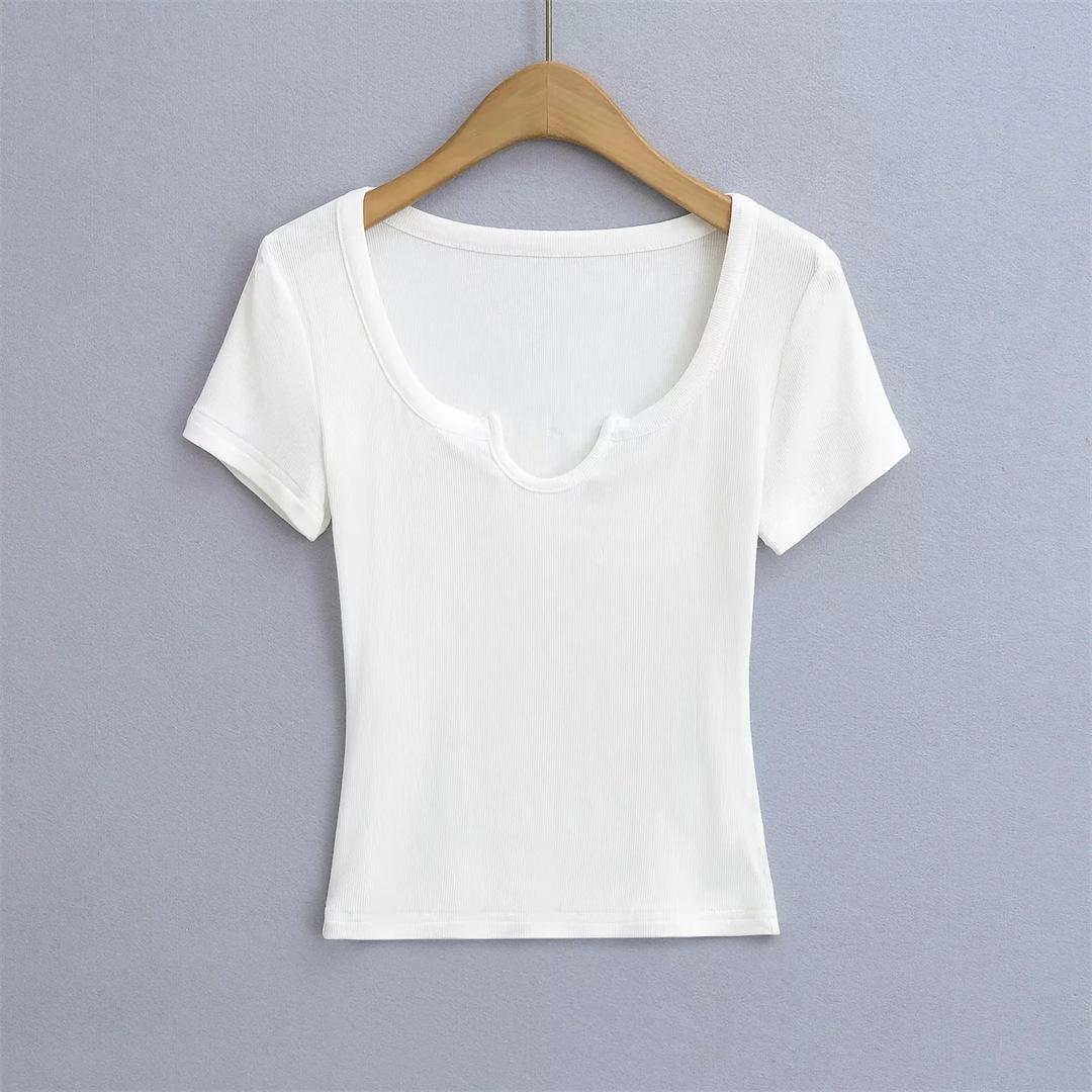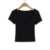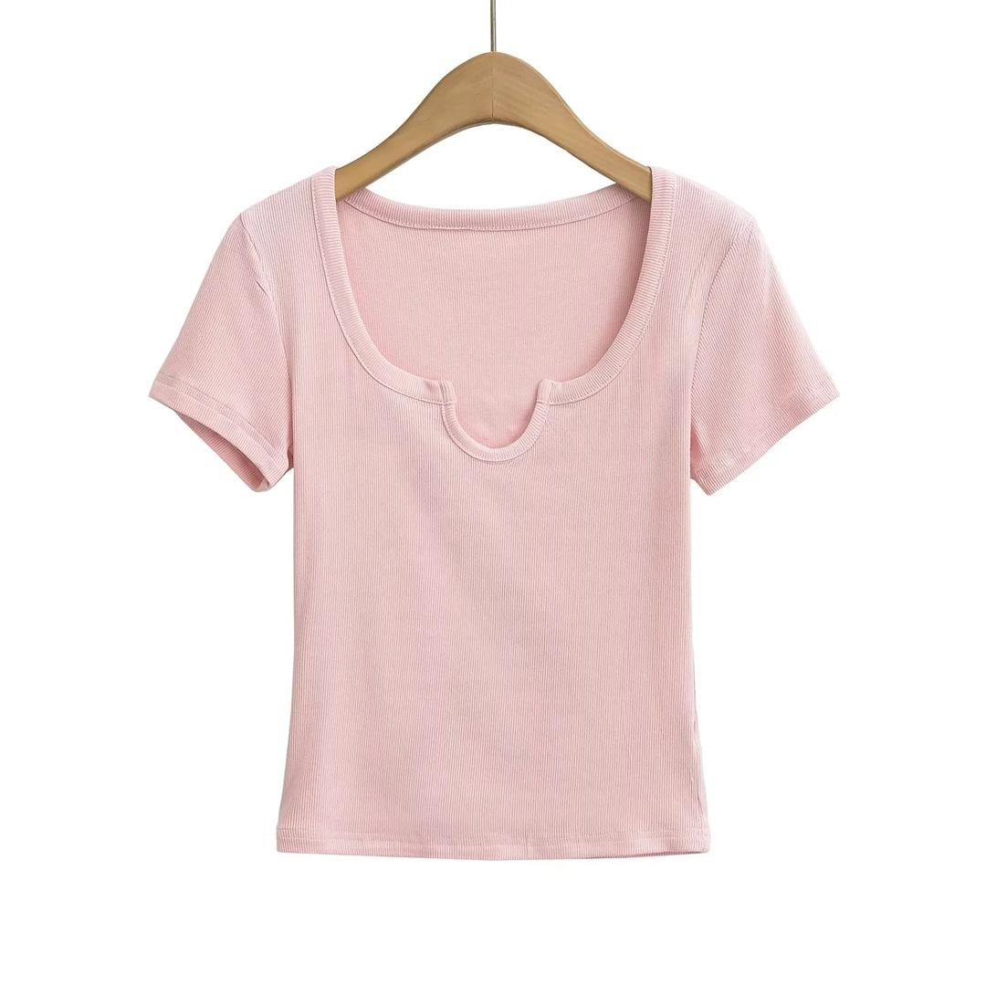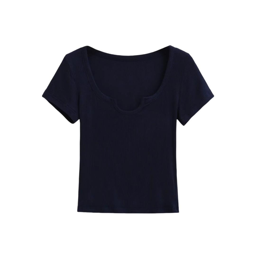Camiseta Americana Estilo Chica Caliente con Hilo Grande de Cuello U Profundo de Manga Corta para Mujer Deseo Puro Sexy Corte Bajo Ajustada Cintura Alta Corta