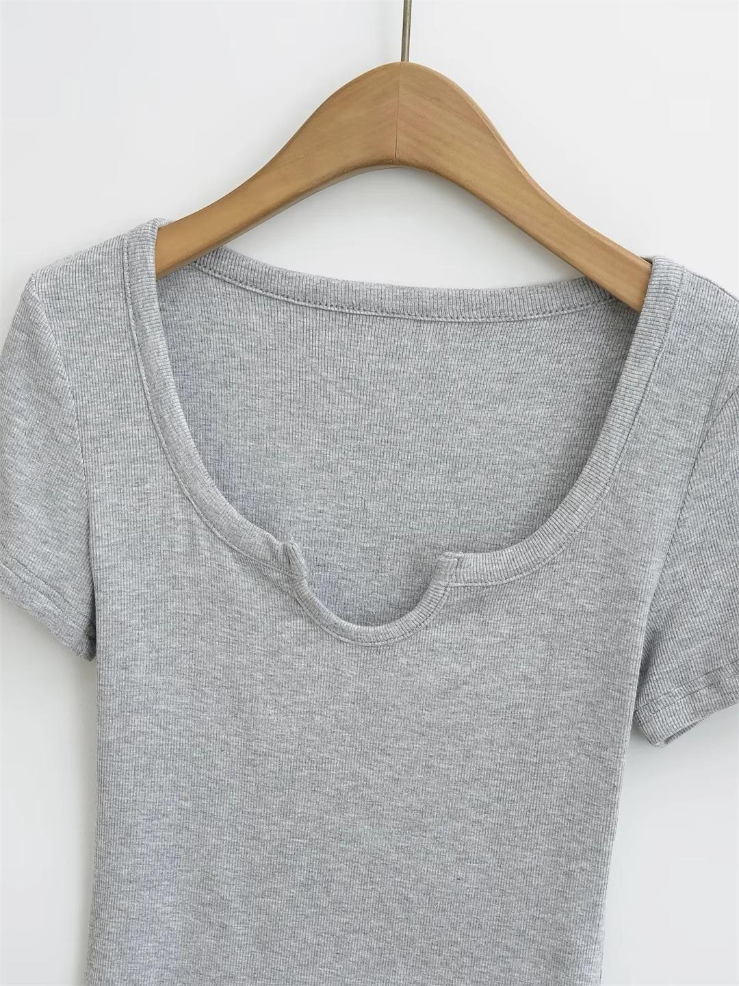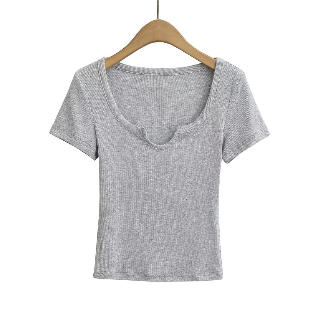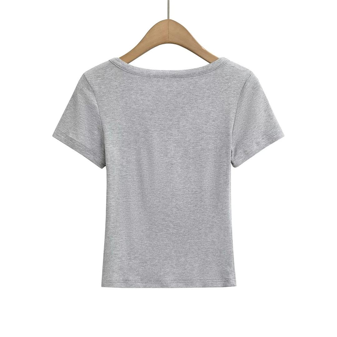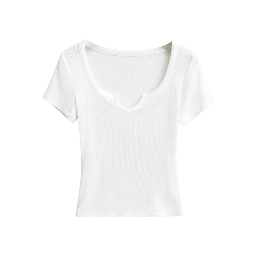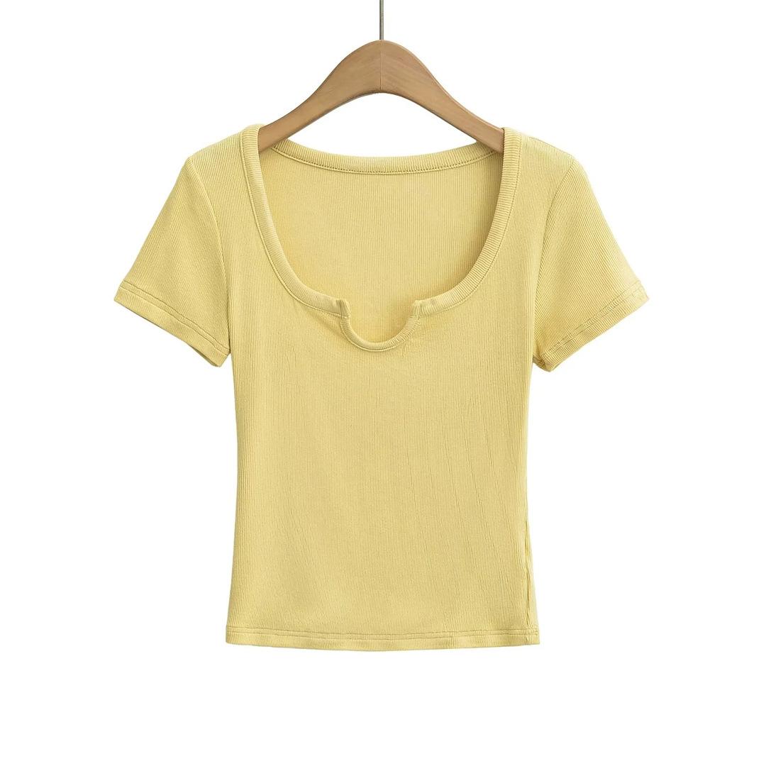 Camiseta Americana Estilo Chica Caliente con Hilo Grande de Cuello U Profundo de Manga Corta para Mujer Deseo Puro Sexy Corte Bajo Ajustada Cintura Alta Corta
