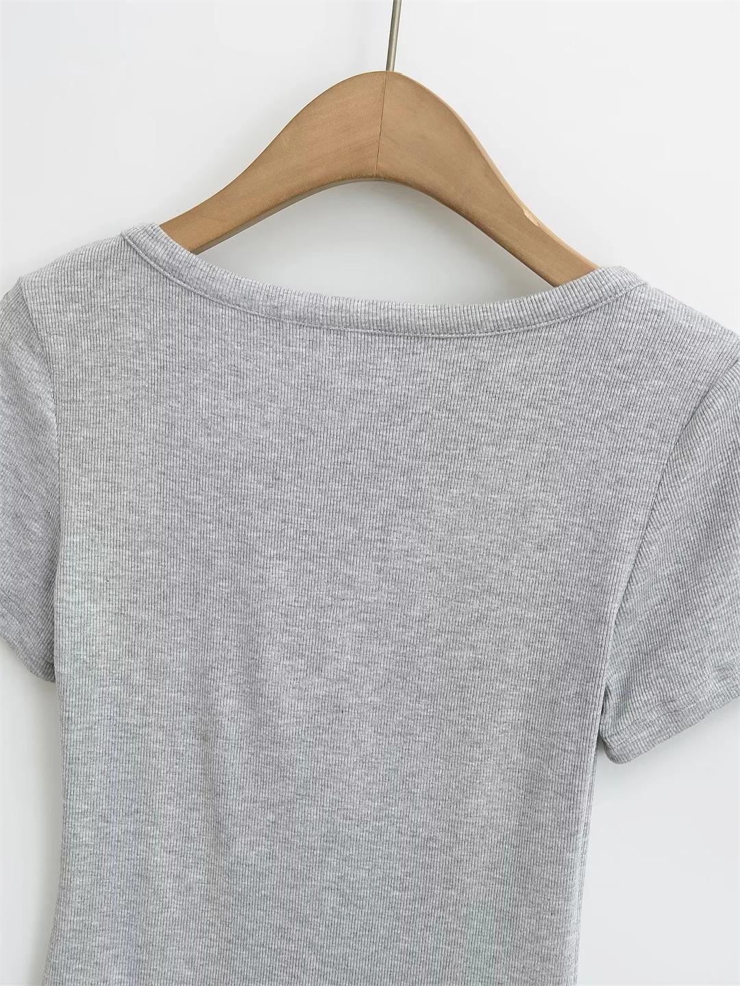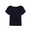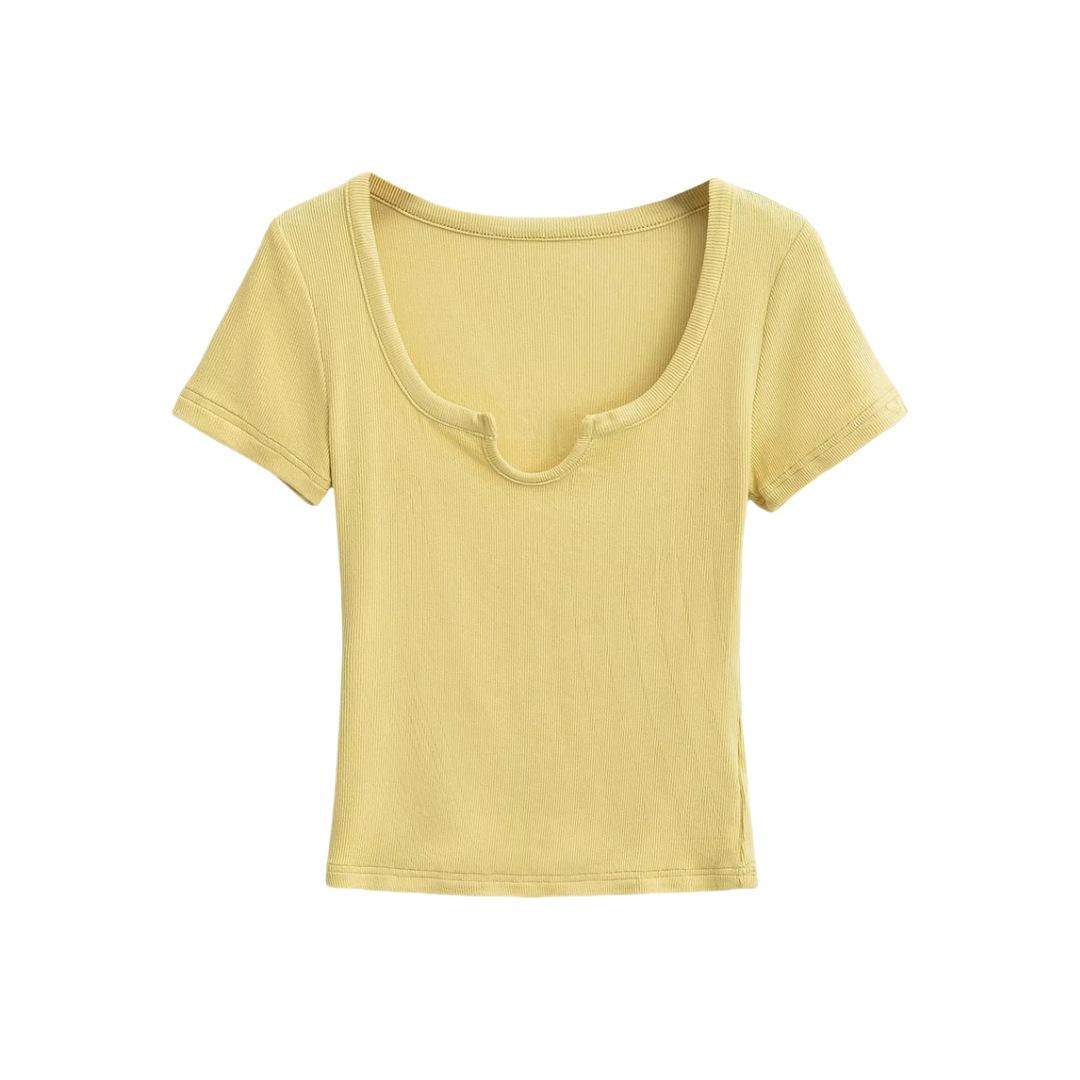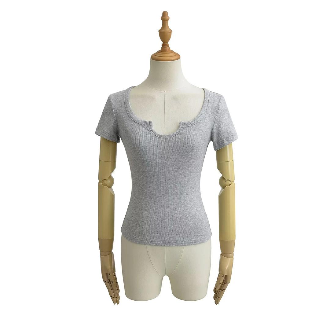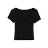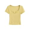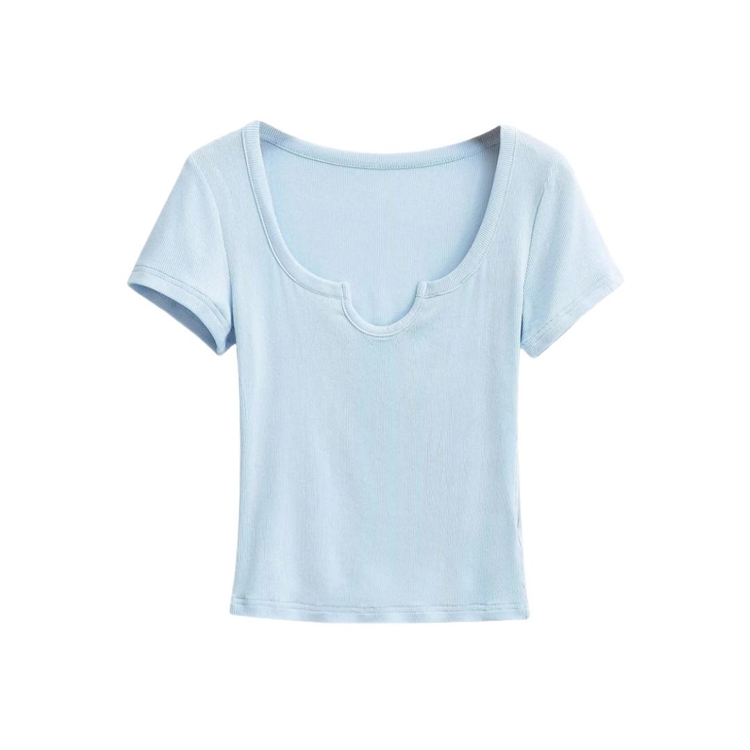 Camiseta Americana Estilo Chica Caliente con Hilo Grande de Cuello U Profundo de Manga Corta para Mujer Deseo Puro Sexy Corte Bajo Ajustada Cintura Alta Corta