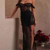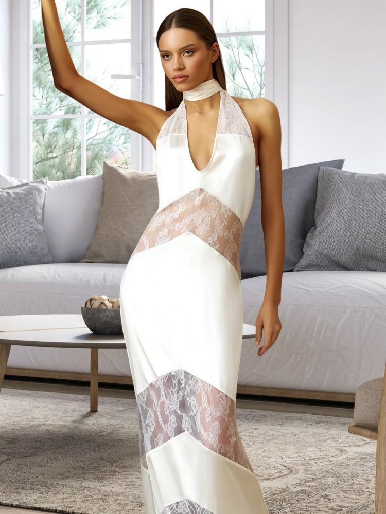 Vestido Sexy Descubierto con Perspectiva Calada para Mujer Primavera 2025 Nueva Moda Cuello en V Encaje Empalmado Vestido Largo