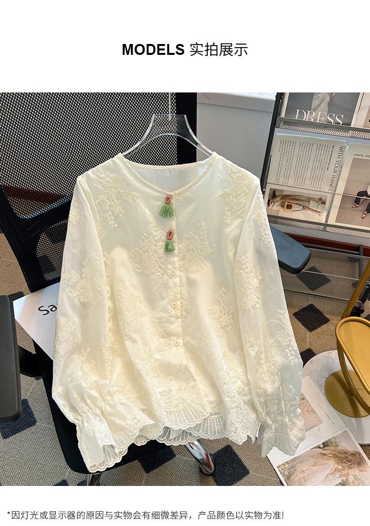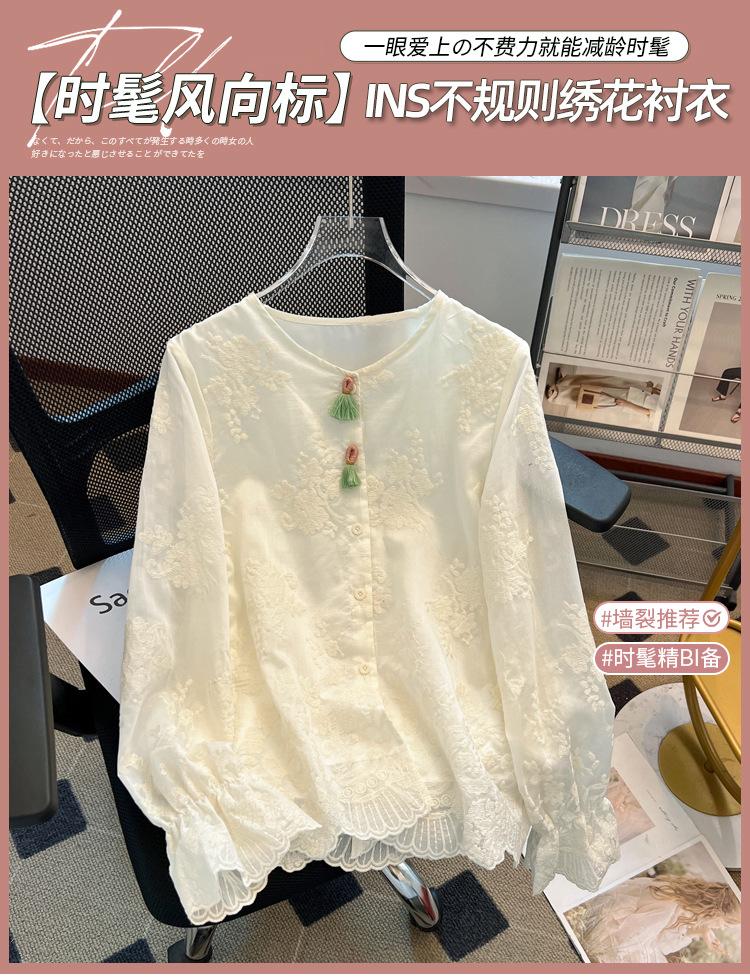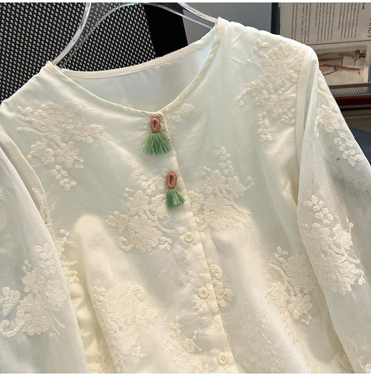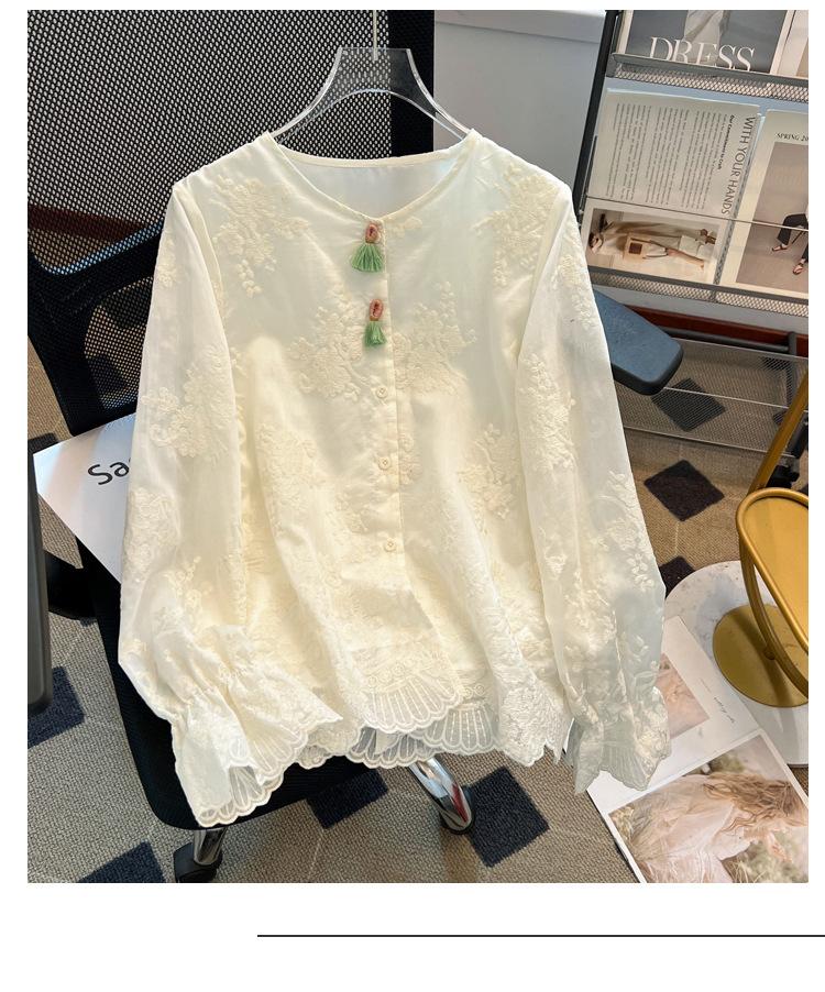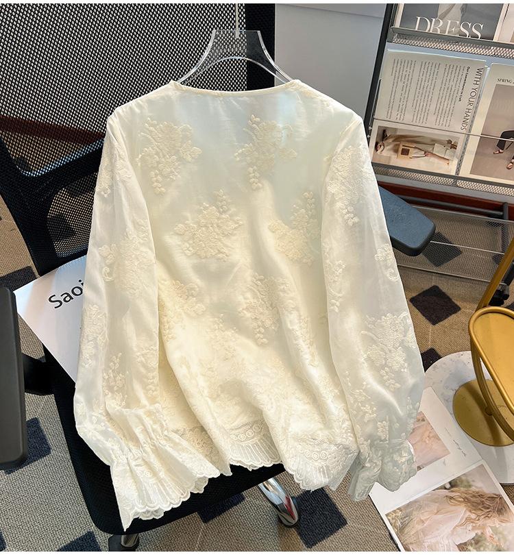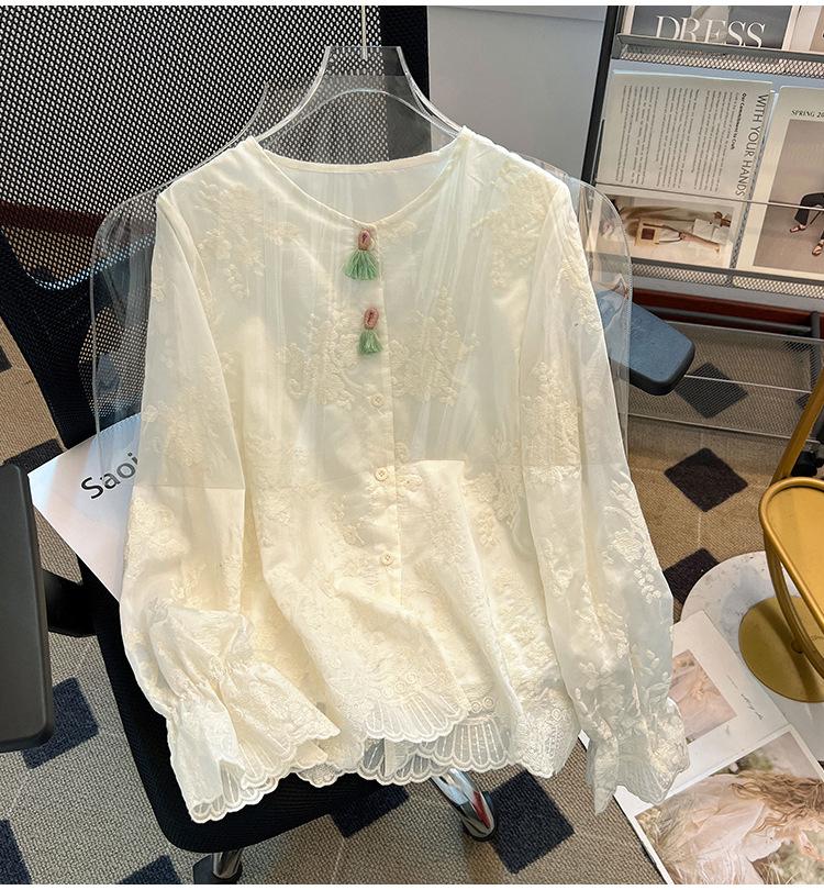 Camisa fina de manga larga con cuello redondo y encaje bordado en jacquard de estilo chino para mujer, estilo coreano, principios de primavera