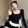 Principios de Otoño Estilo Deseo Puro Spice Girl Cuello Cuadrado Camiseta Base Sentido del Diseño Manga Larga Nicho Chic Ajustado Adelgazante Top Ins