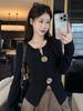 Camiseta de punto de manga larga con cuello en V y diseño de otoño e invierno, nueva camiseta vintage con botones y cordones, cintura estrecha y elegante.