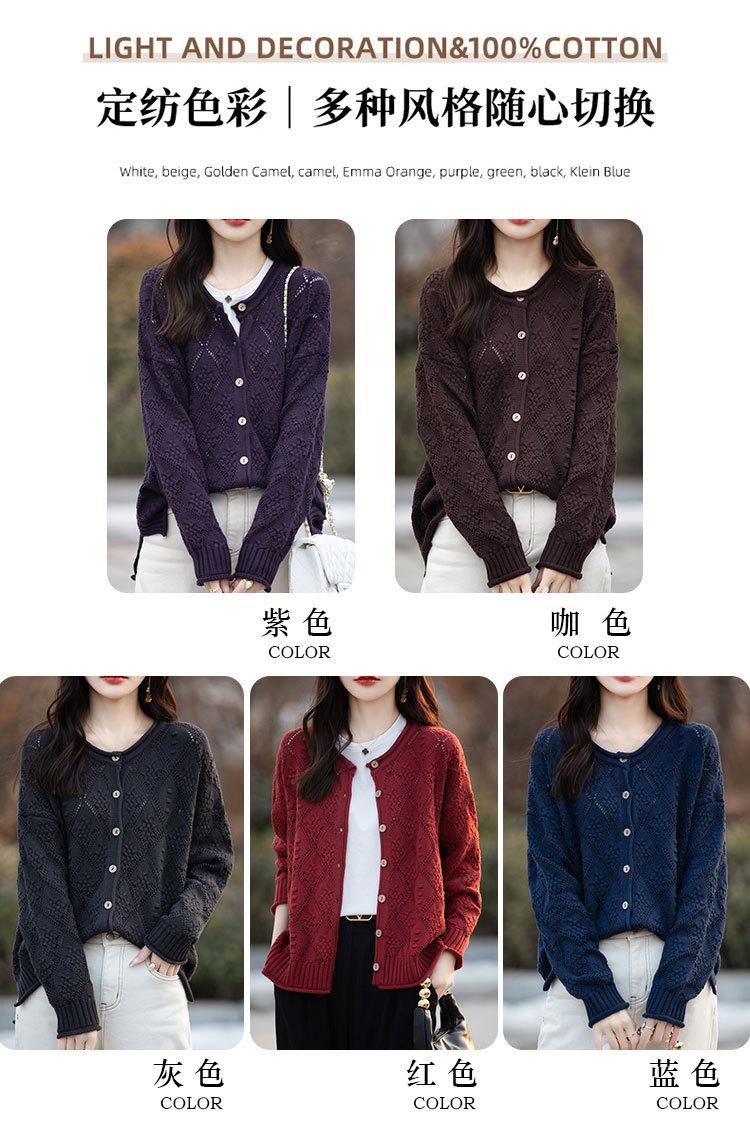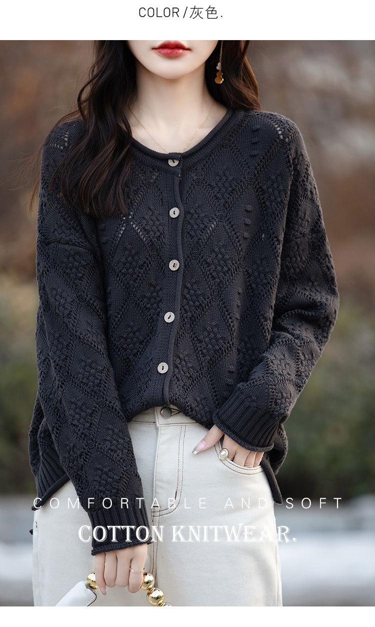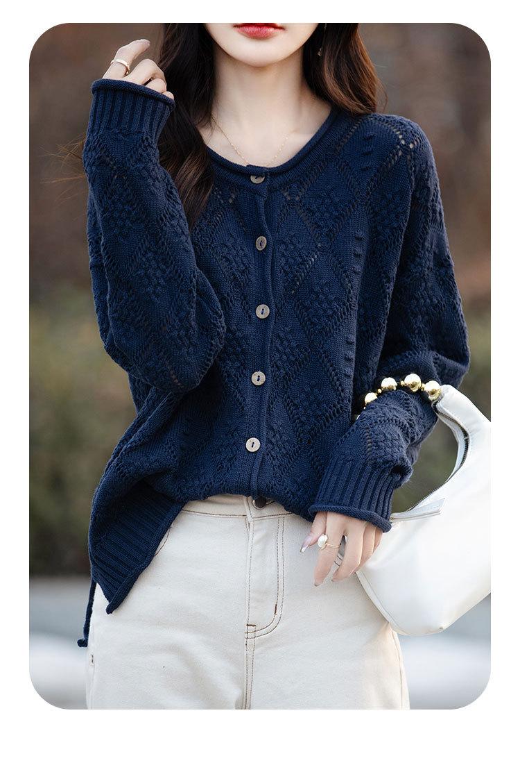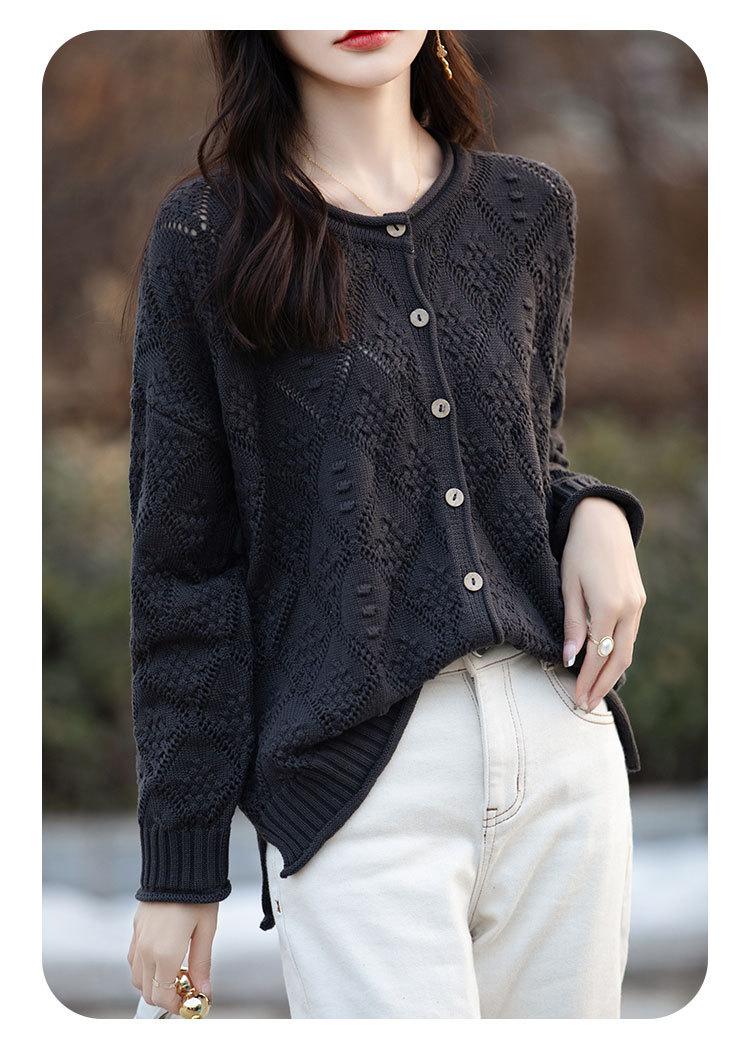 Cárdigan de Algodón de Primavera Calado Suéter Tejido Chaqueta para Mujer Artístico Combinable Casual Manga Larga Chaqueta Exterior