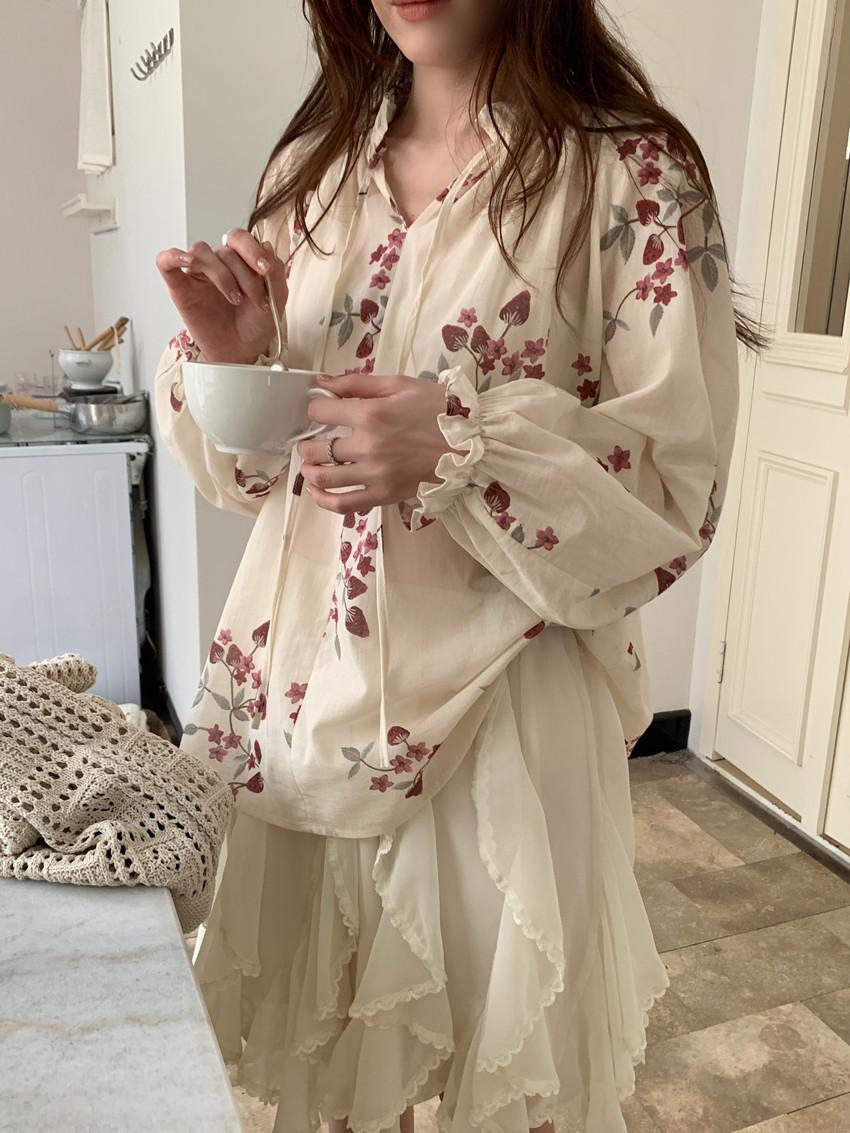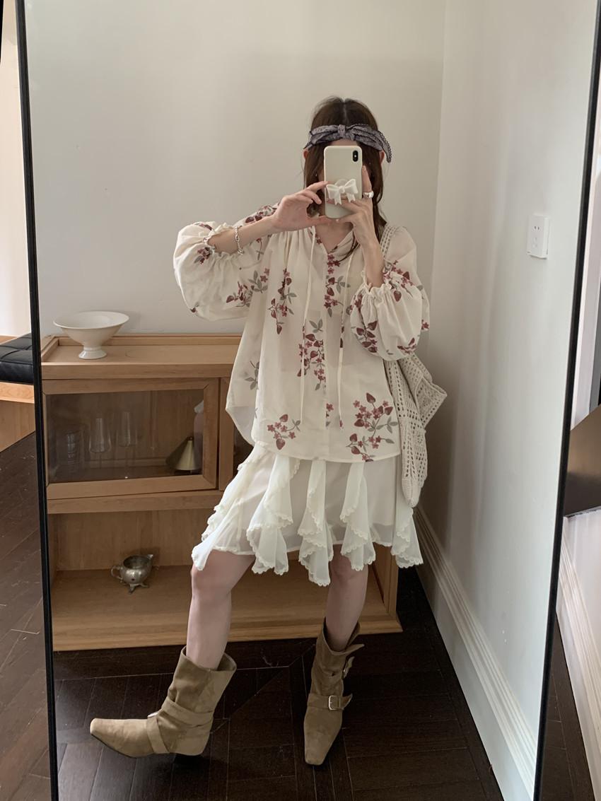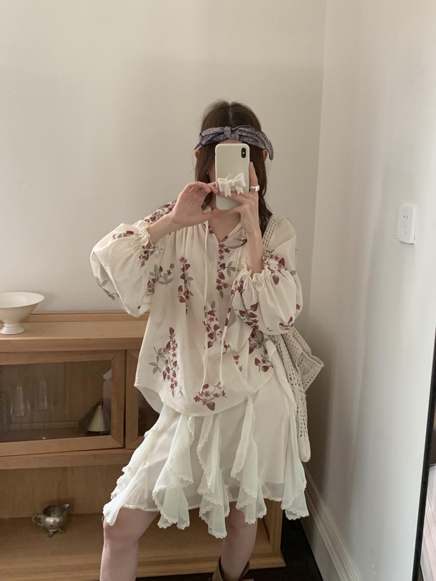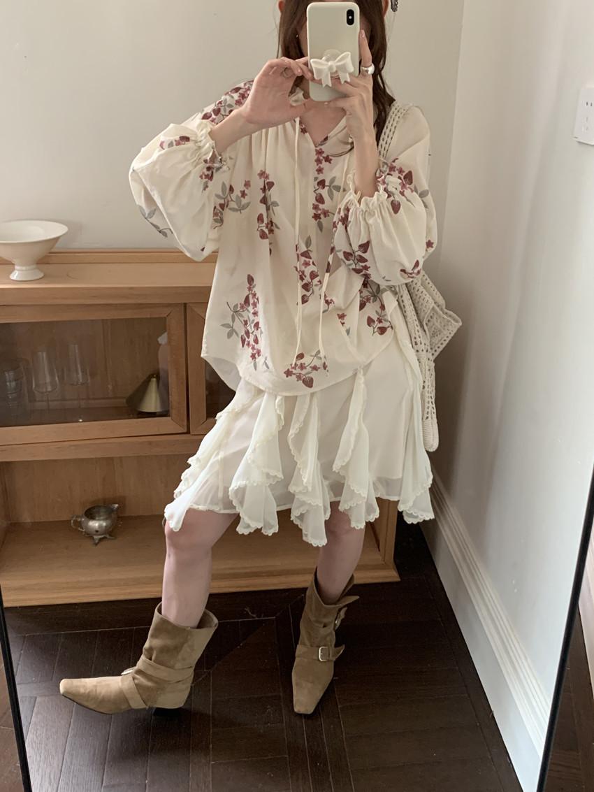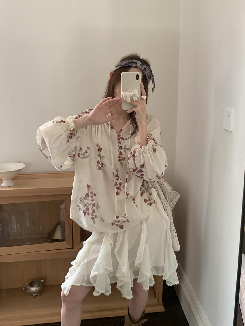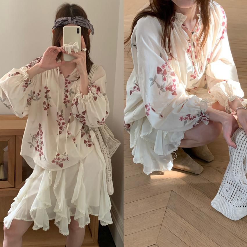 Foto Real de Traje de Dos Piezas de Estilo Retro, Camisa con Flores Estampadas + Falda de Encaje con Diseño Asimétrico