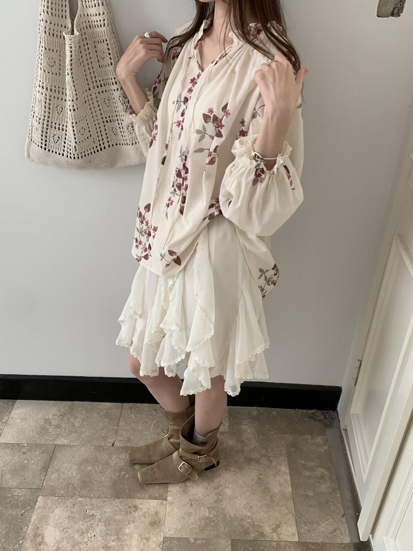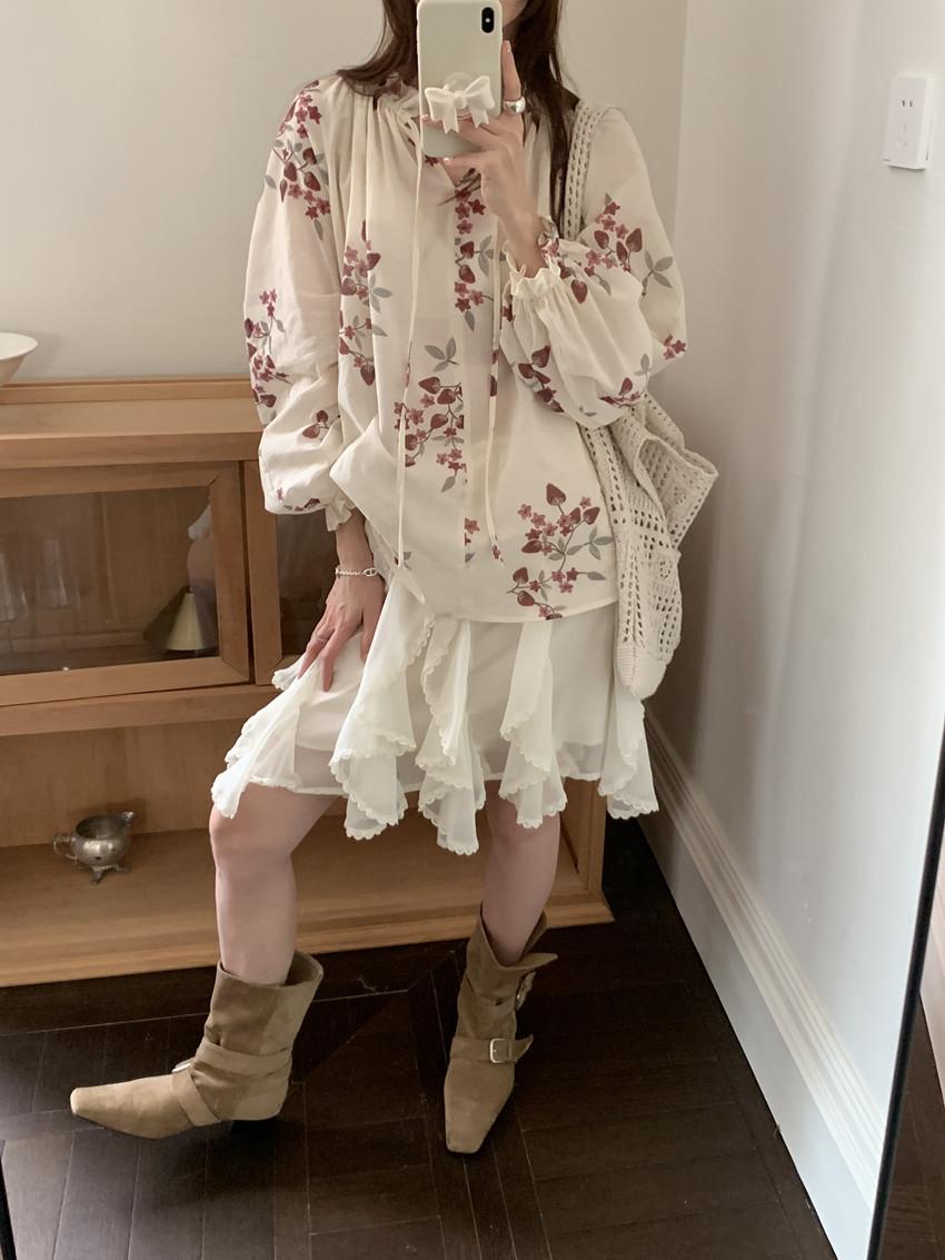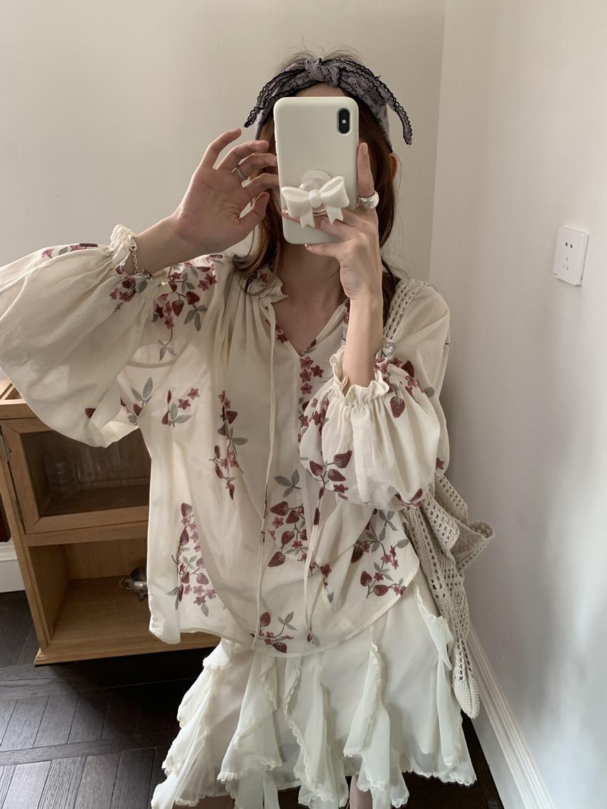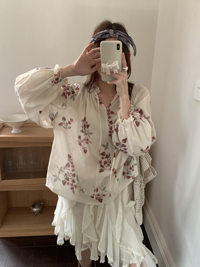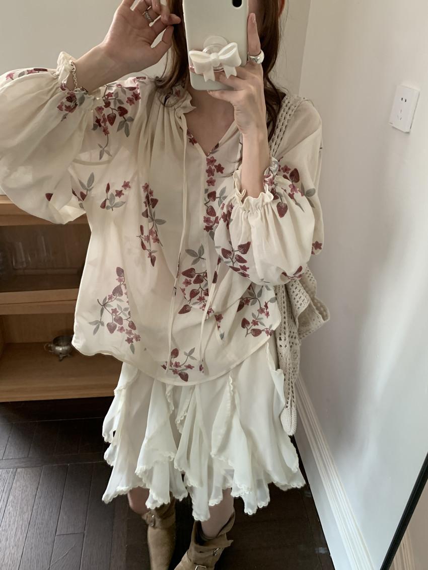 Foto Real de Traje de Dos Piezas de Estilo Retro, Camisa con Flores Estampadas + Falda de Encaje con Diseño Asimétrico