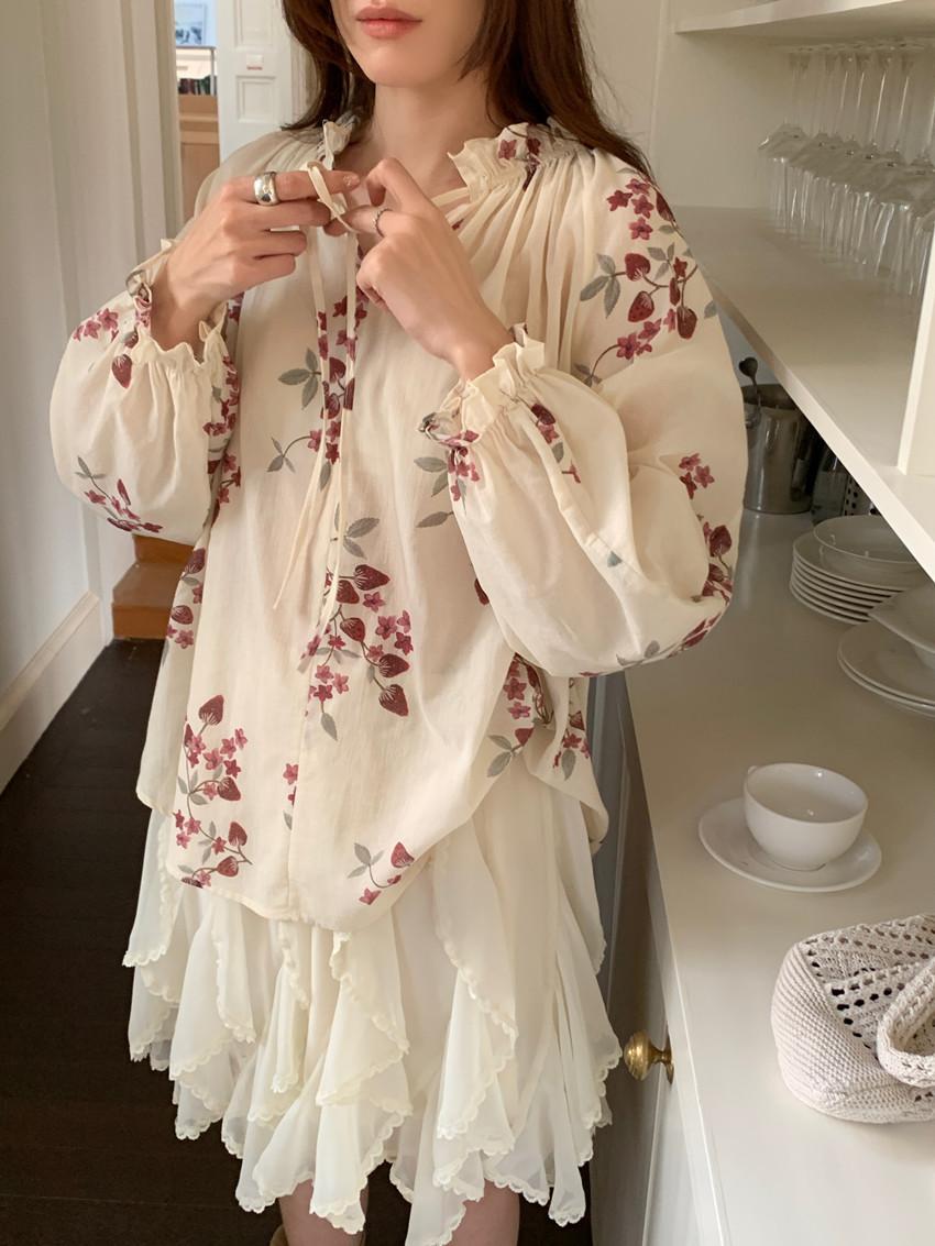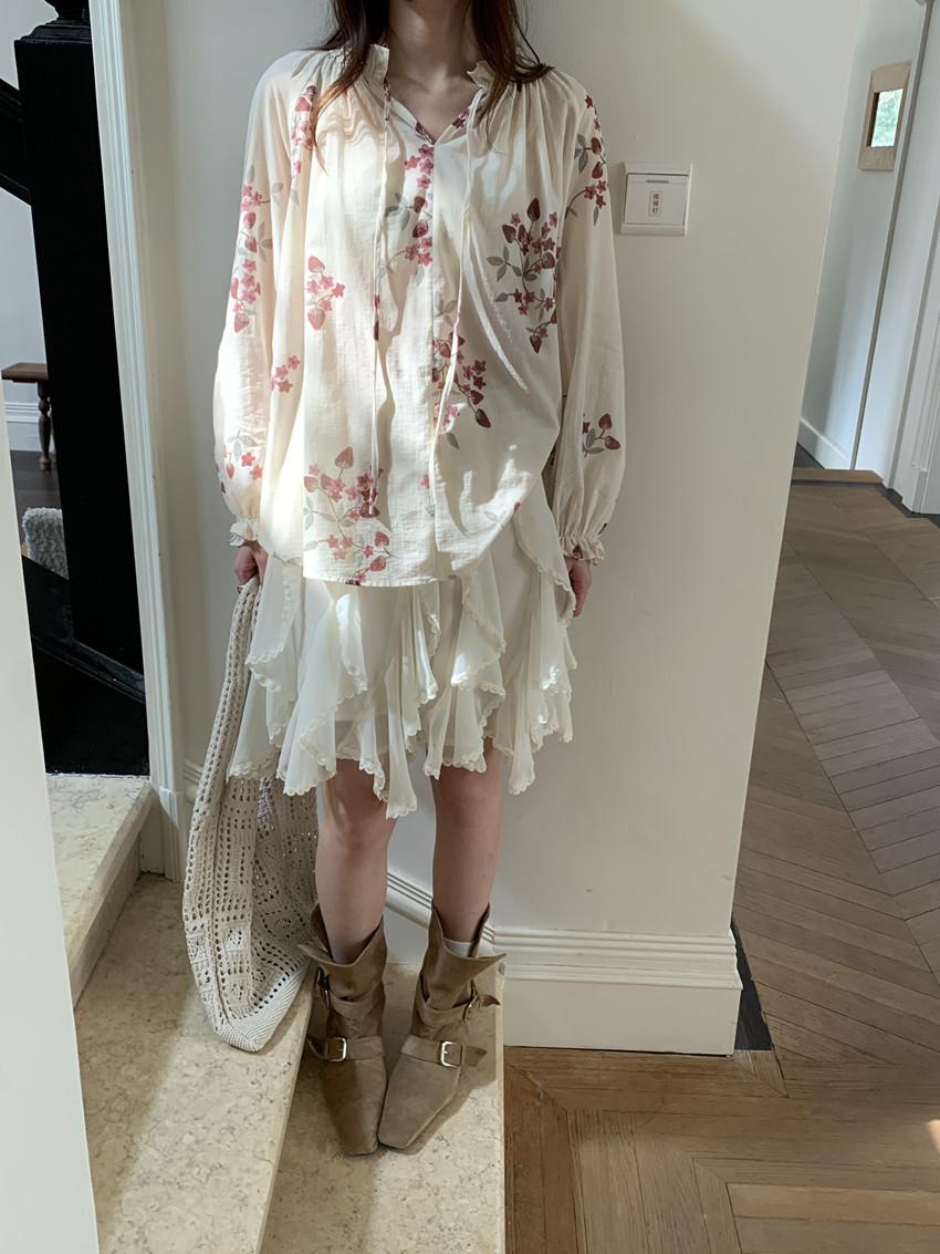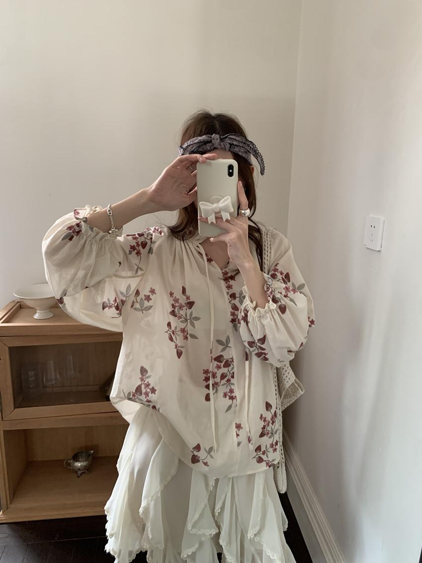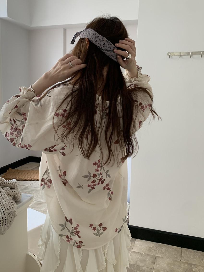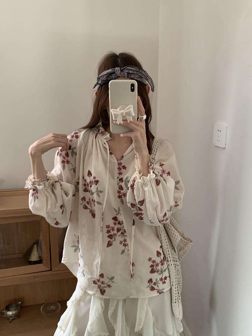 Foto Real de Traje de Dos Piezas de Estilo Retro, Camisa con Flores Estampadas + Falda de Encaje con Diseño Asimétrico