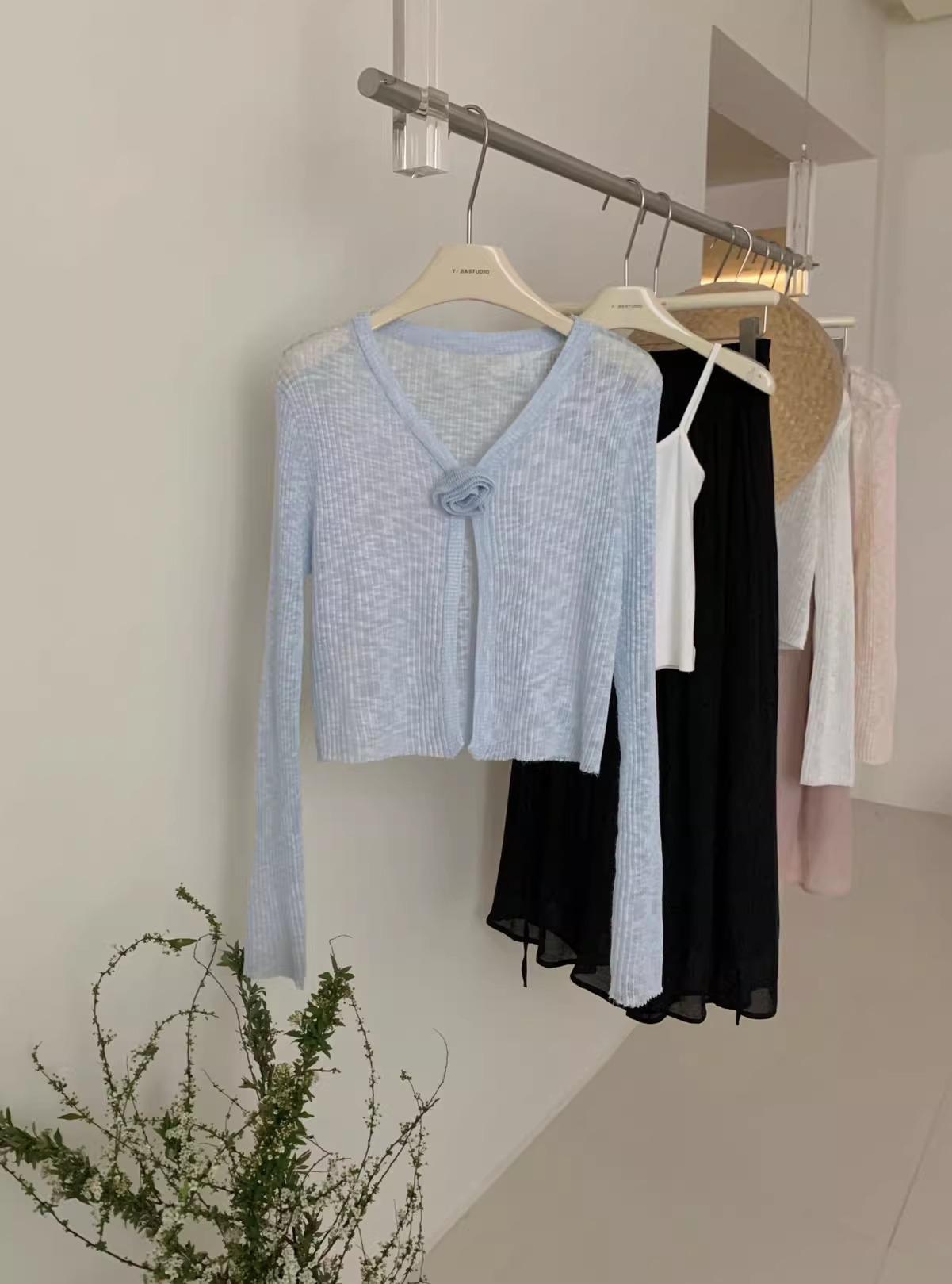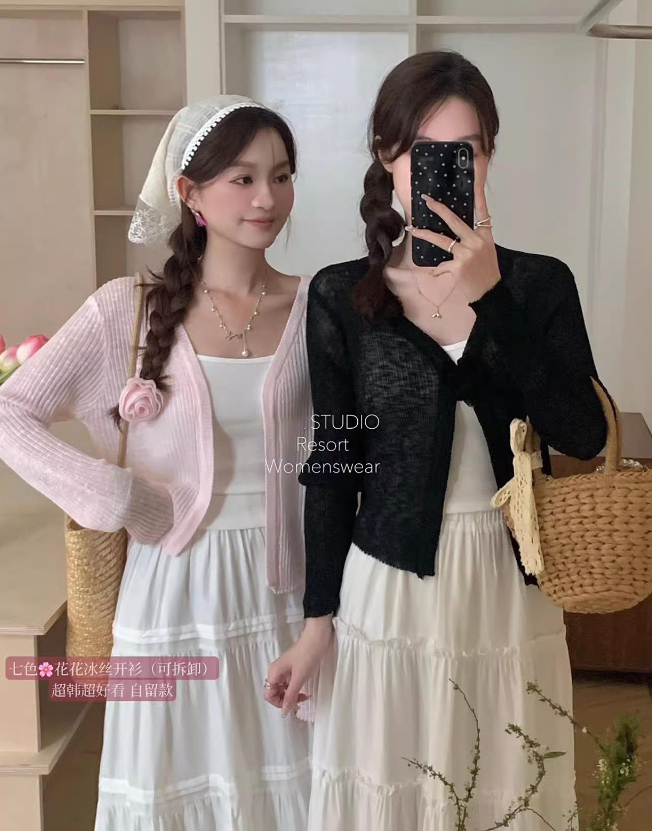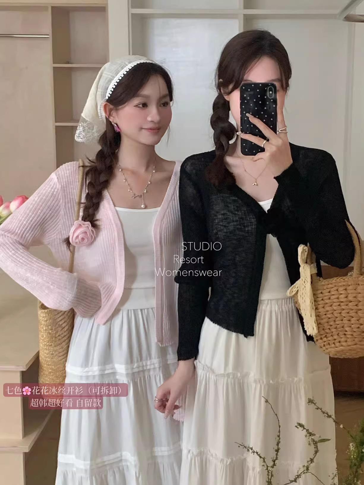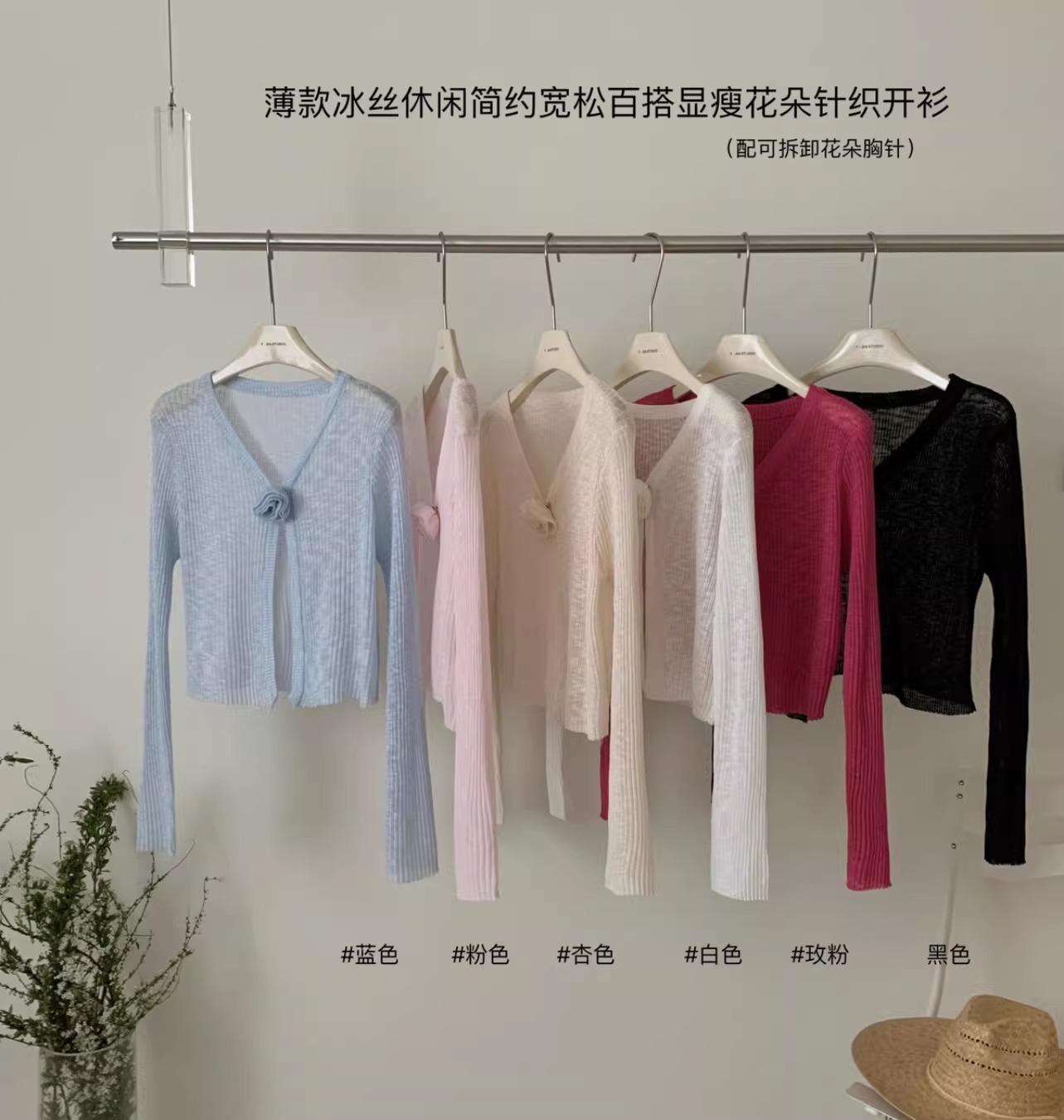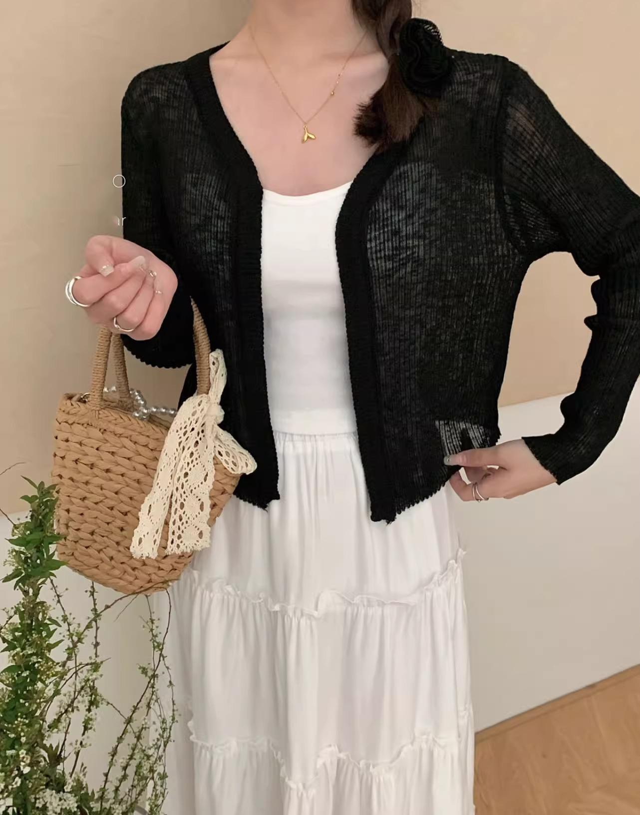 Camisa de manga larga de seda de hielo transpirable y fina, con aire acondicionado, sencilla, holgada, combinable con todo, de punto con flores, con protector solar, chaqueta dulce