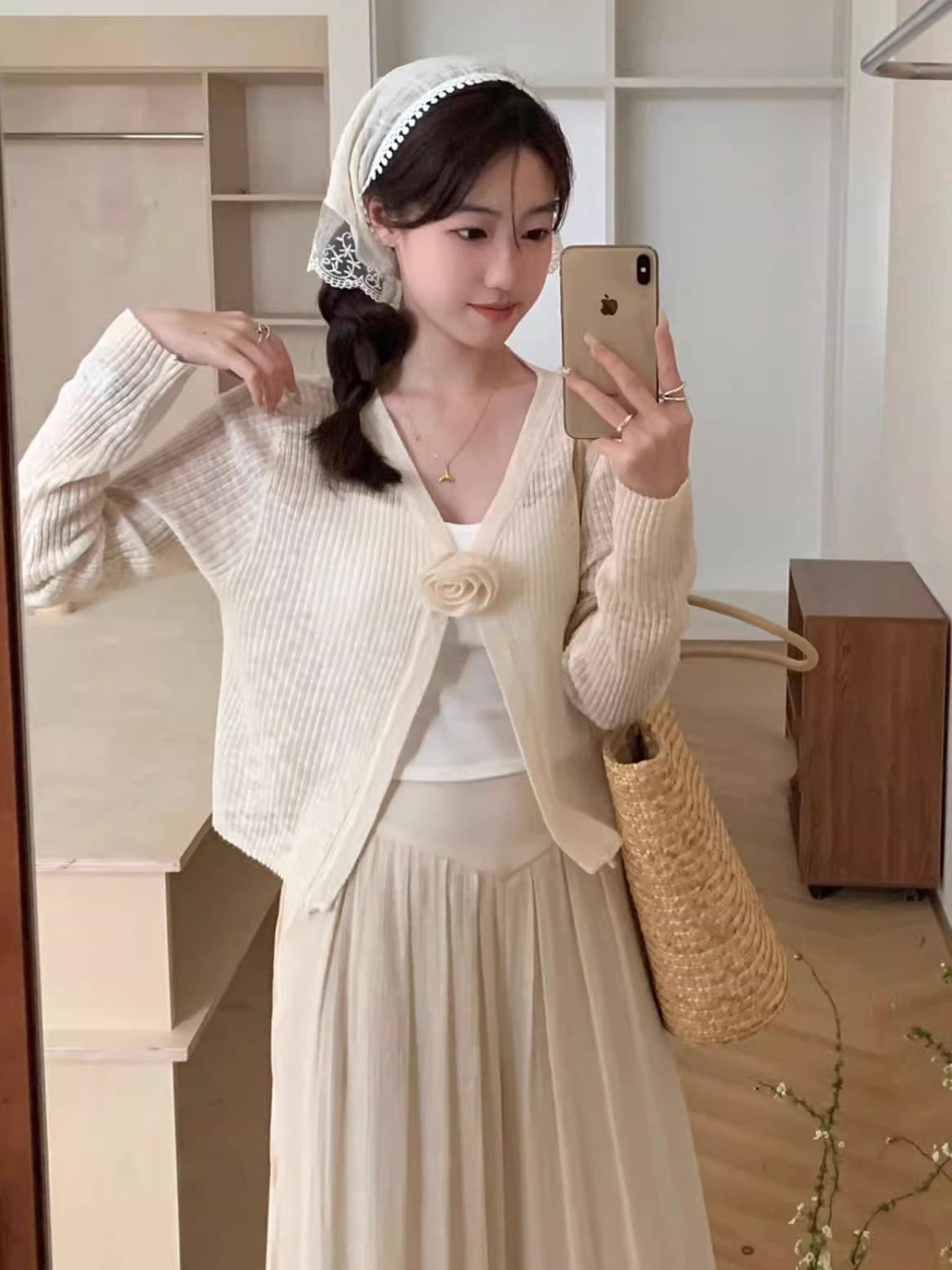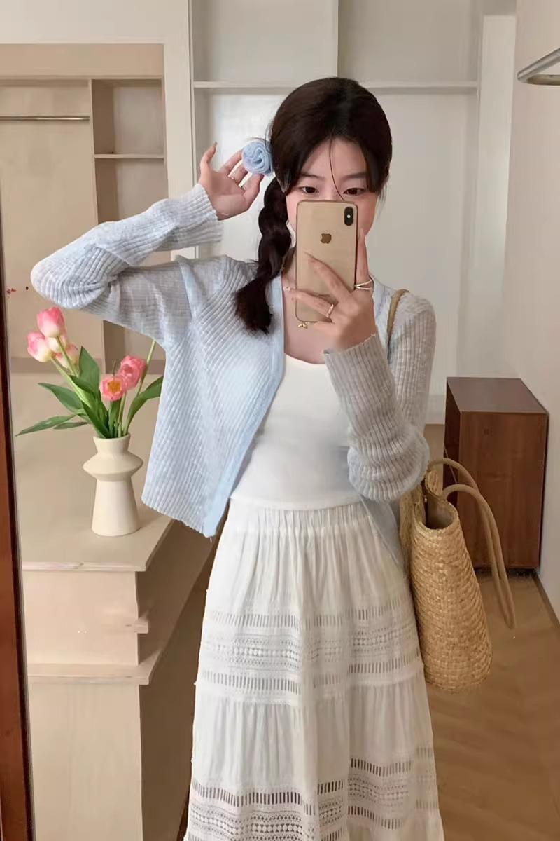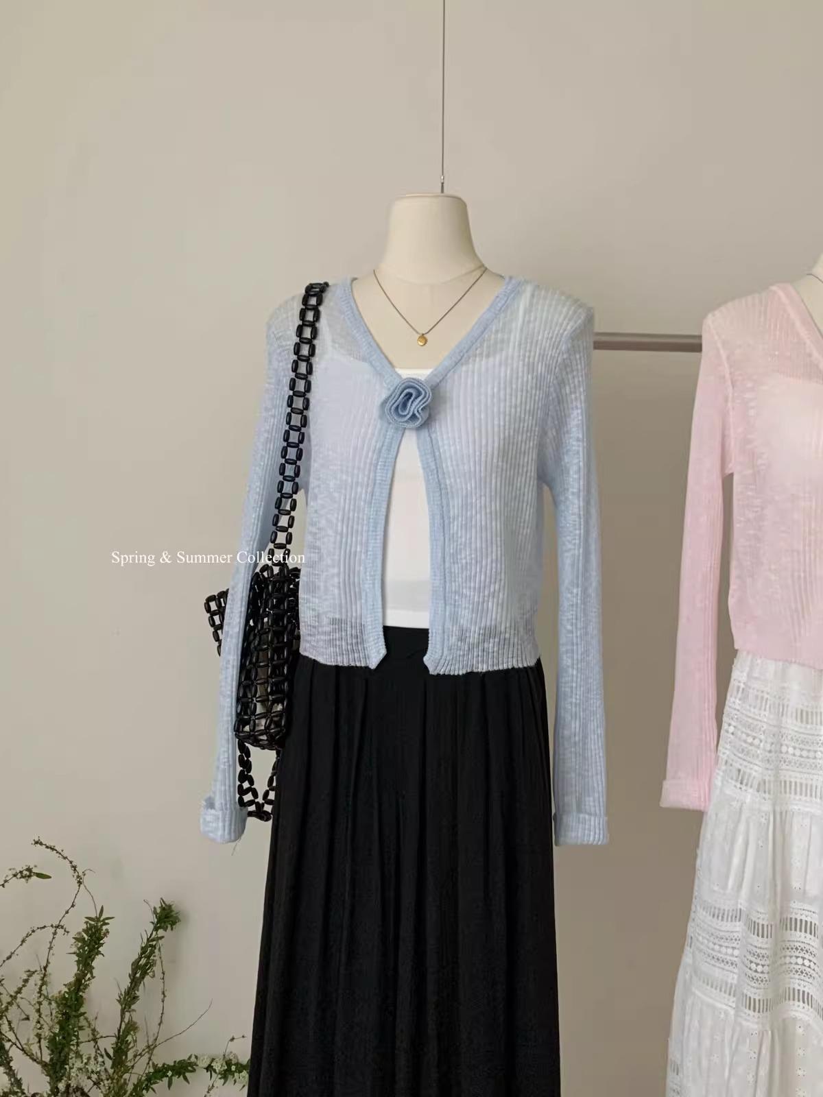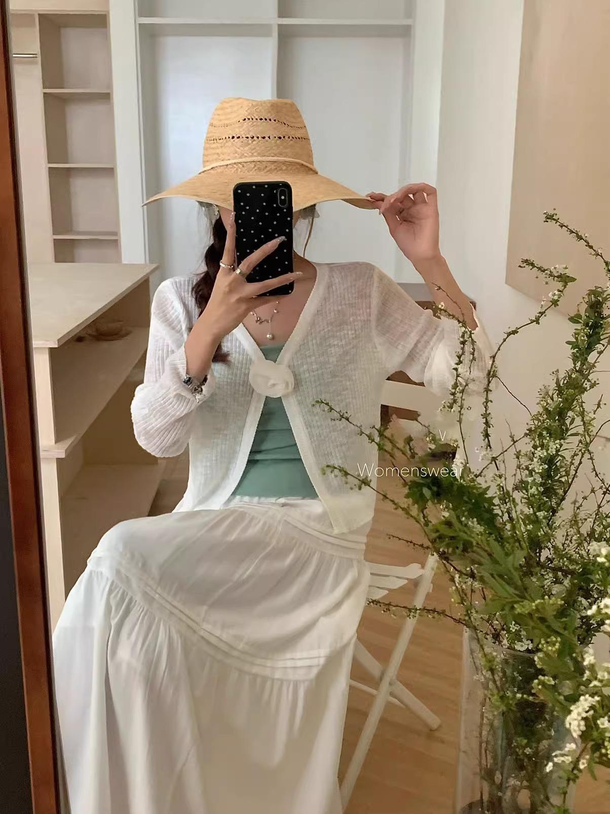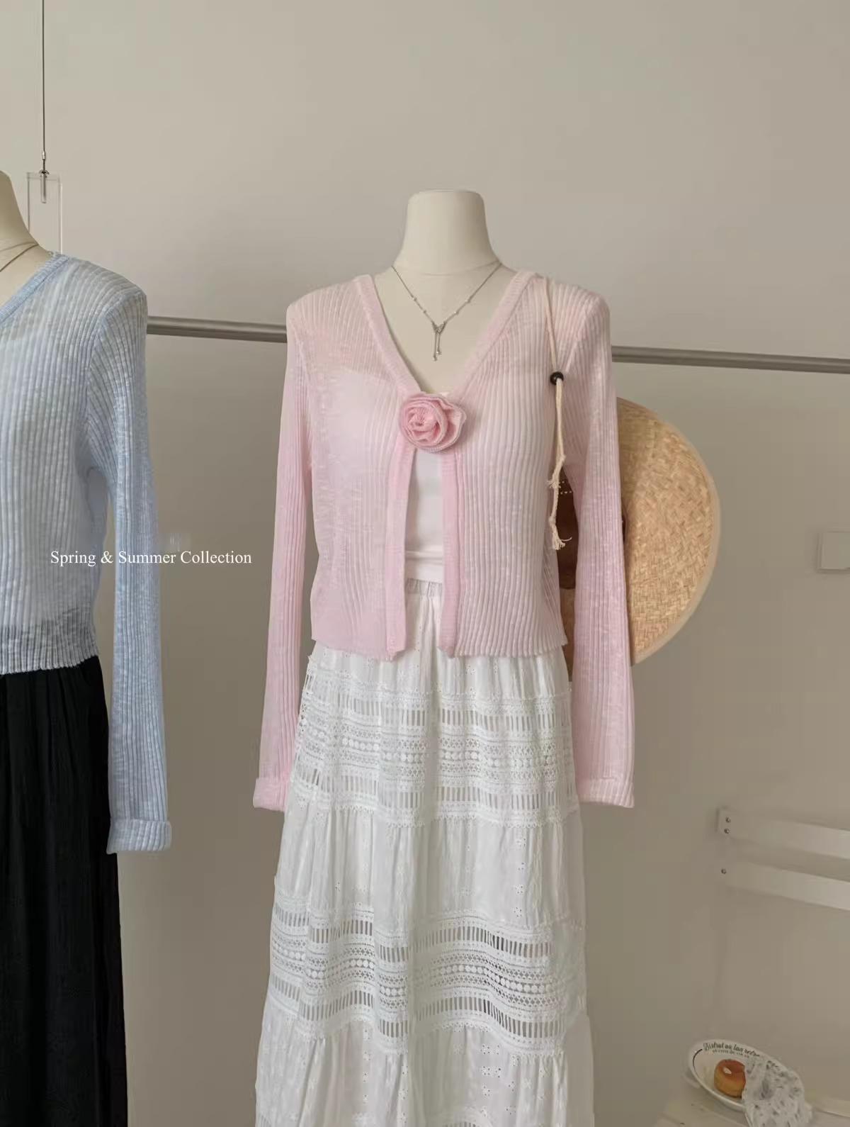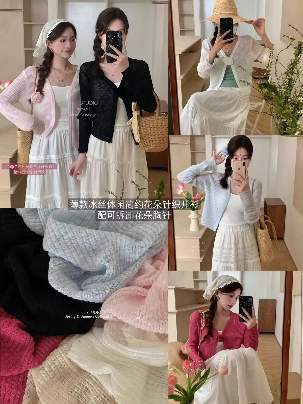 Camisa de manga larga de seda de hielo transpirable y fina, con aire acondicionado, sencilla, holgada, combinable con todo, de punto con flores, con protector solar, chaqueta dulce