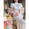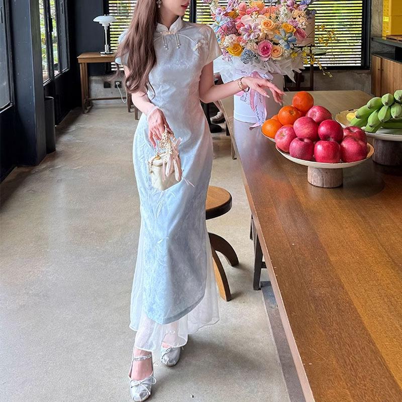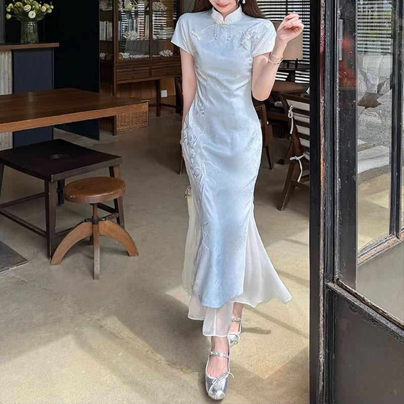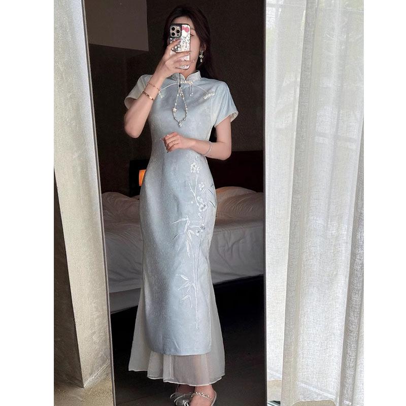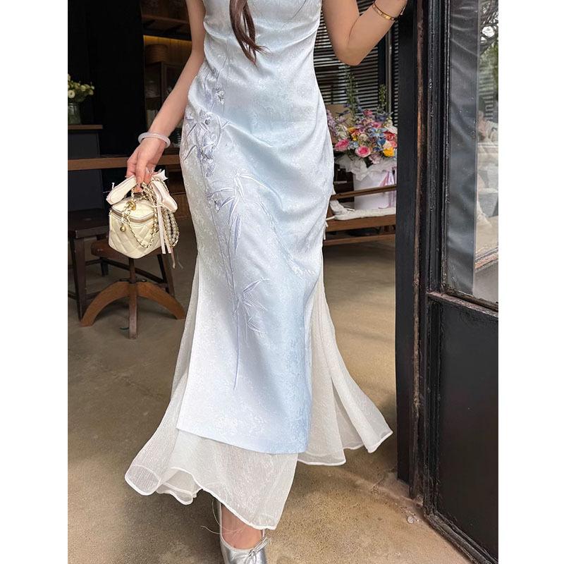 [Rima de Bambú de Hadas] Nuevo vestido cheongsam ajustado, adelgazante y con bordado jacquard azul estilo chino para verano 2025