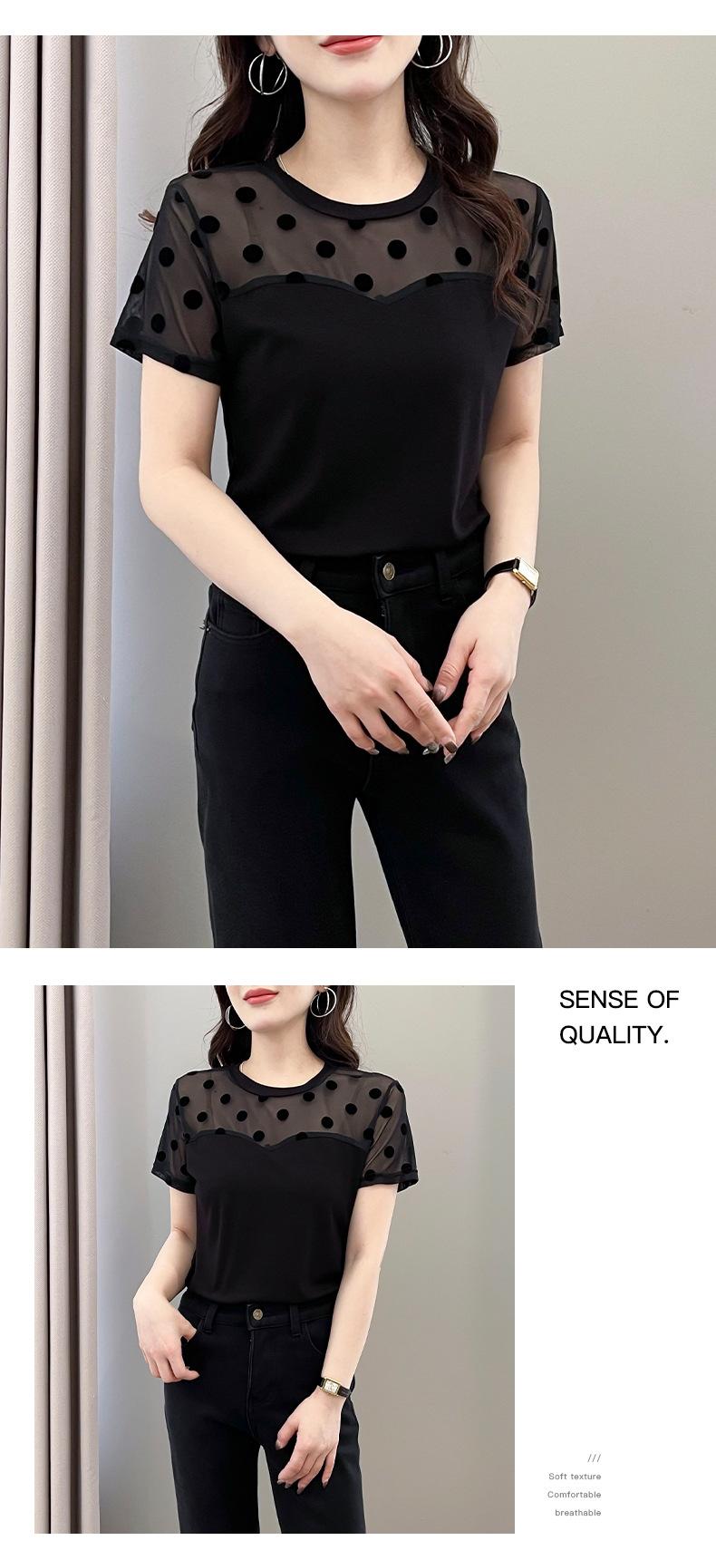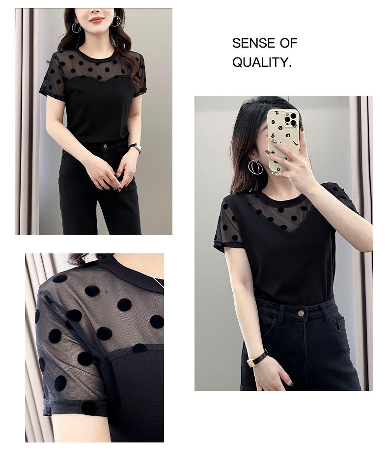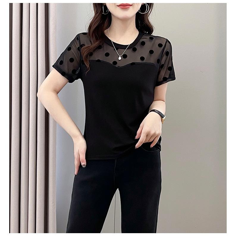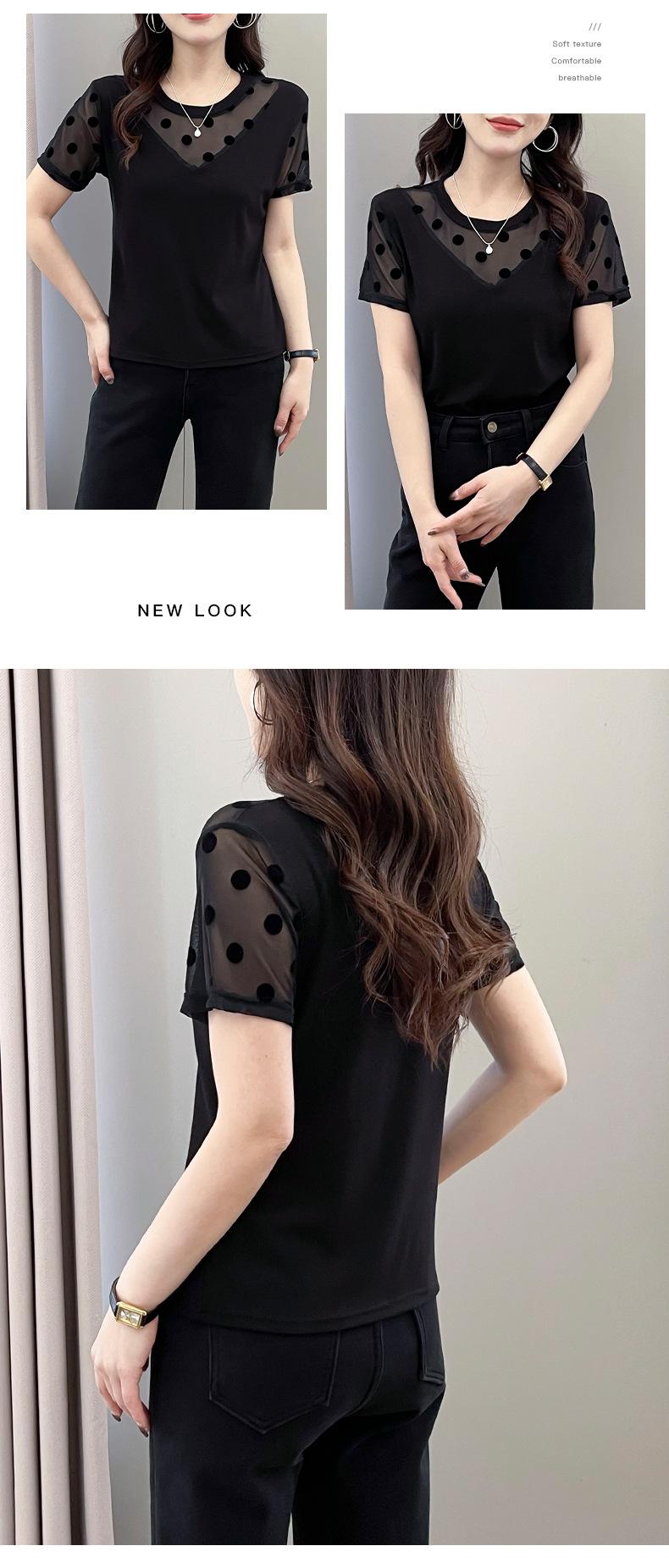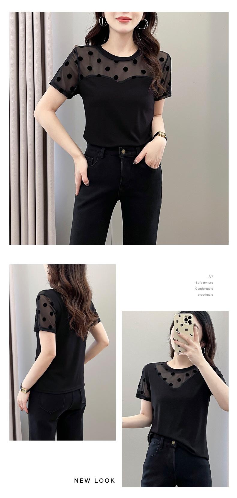 Camiseta de manga corta con lunares y costuras de malla, novedad de verano 2025, camiseta ajustada adelgazante, top de cuello redondo para mujer.