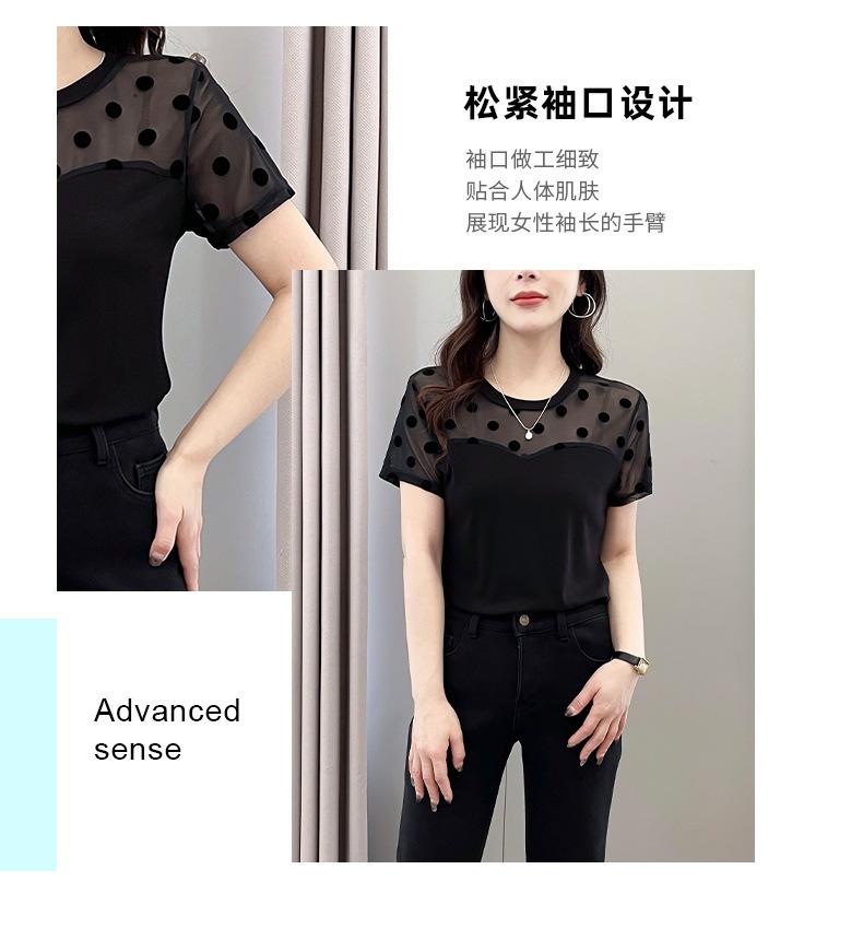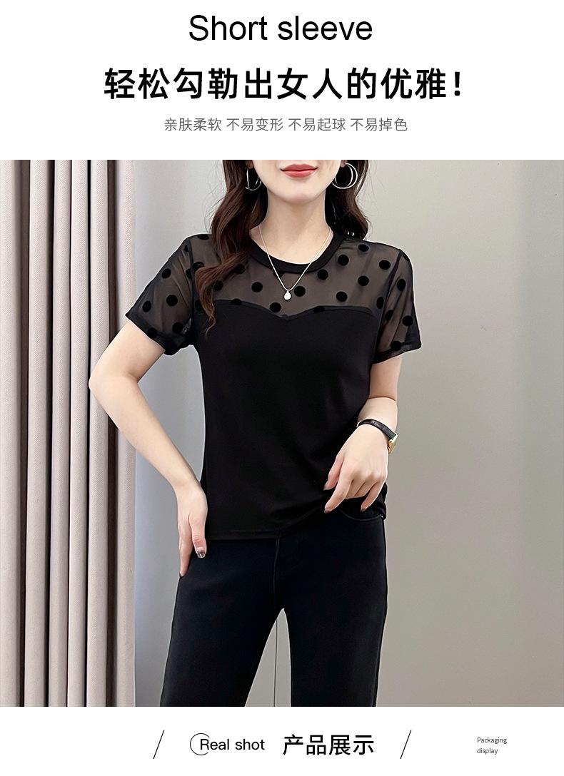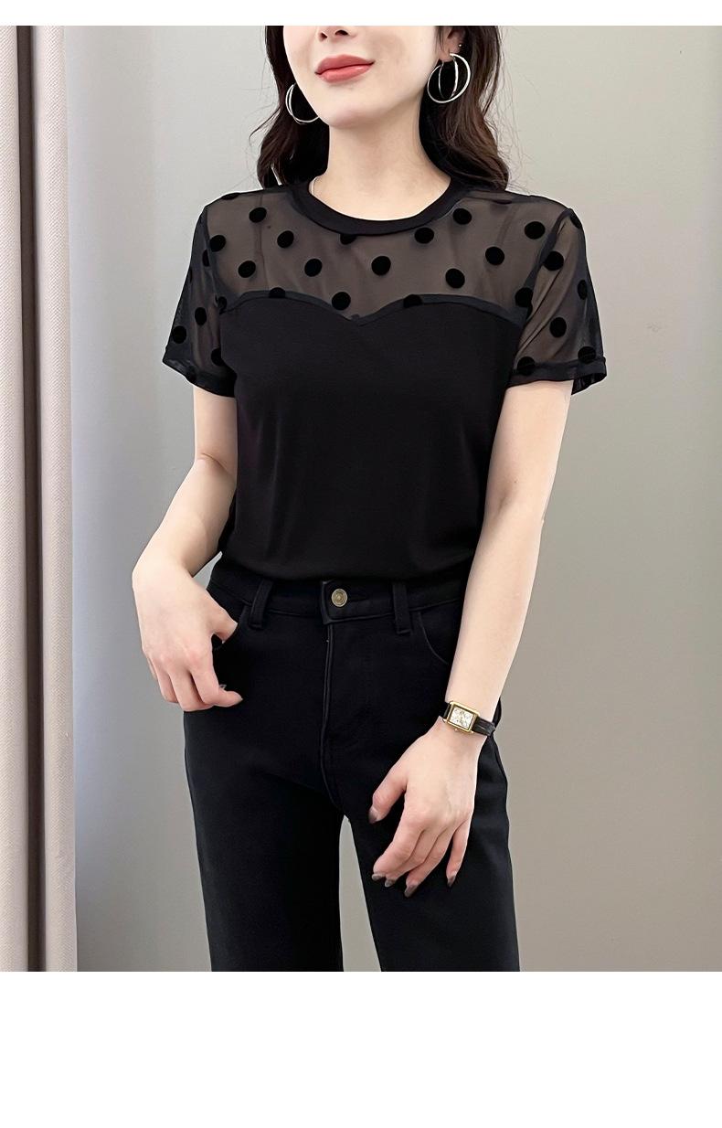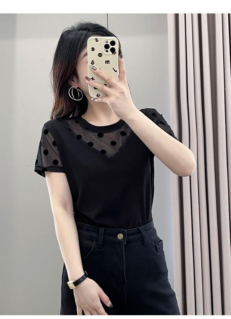 Camiseta de manga corta con lunares y costuras de malla, novedad de verano 2025, camiseta ajustada adelgazante, top de cuello redondo para mujer.