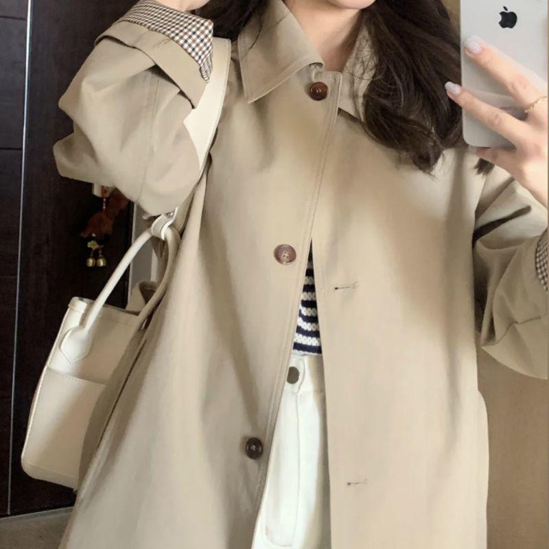 Chaqueta Cortavientos Shanli Dadi de Otoño Temprano para Mujer, Nueva Primavera y Otoño Caqui Petite Estilo Coreano Británico Largo Medio
